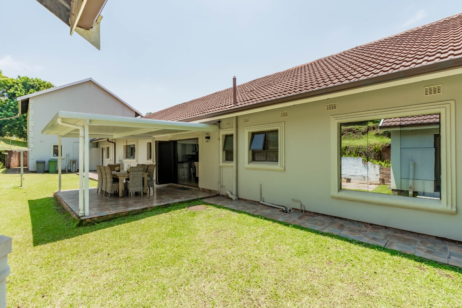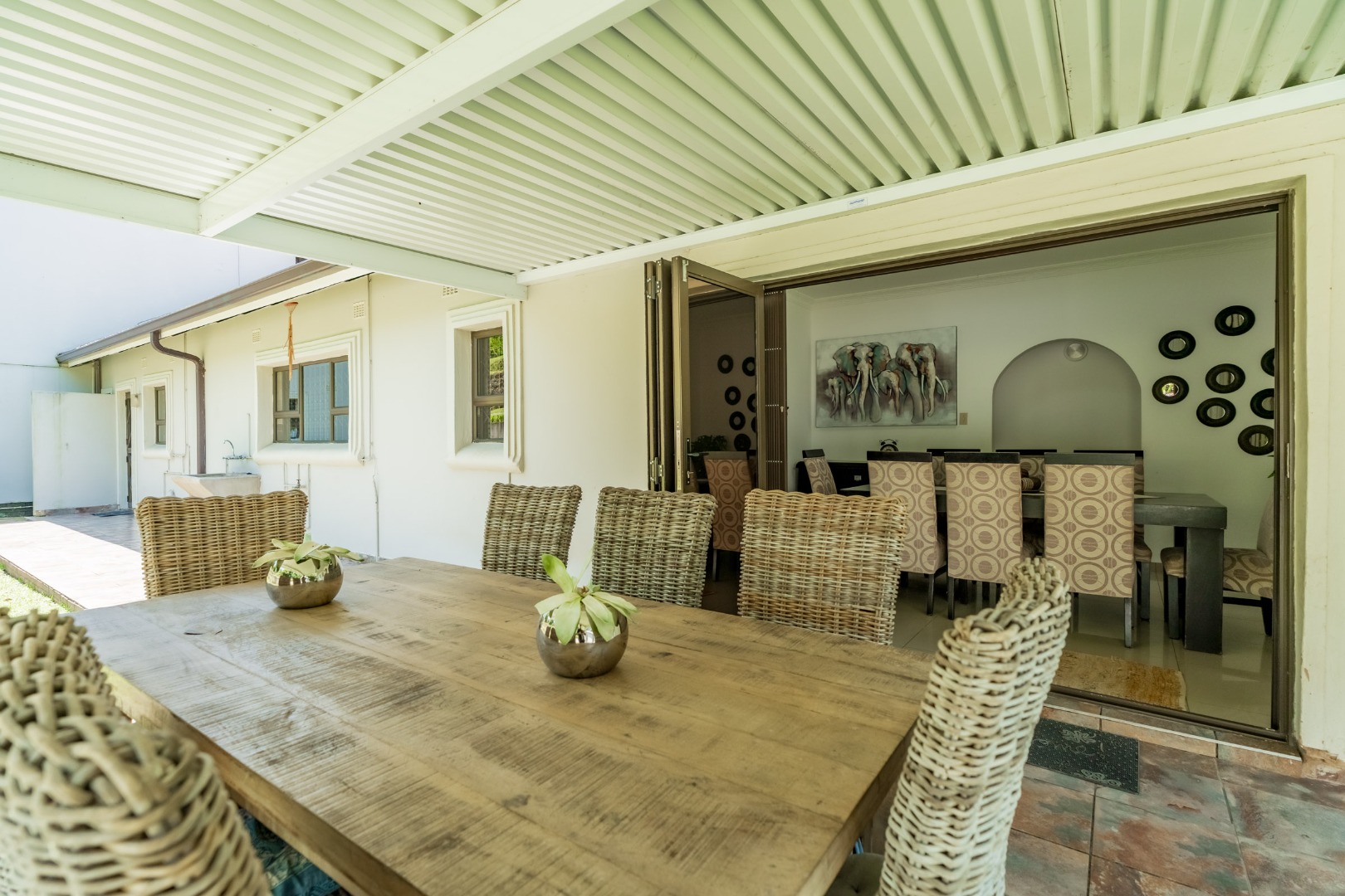 The dining room flows seamlessly onto a separate patio area, ideal for entertaining. The home boasts four spacious bedrooms, with the main bedroom featuring its own private en-suite bathroom, as well as a modern full guest bathroom.