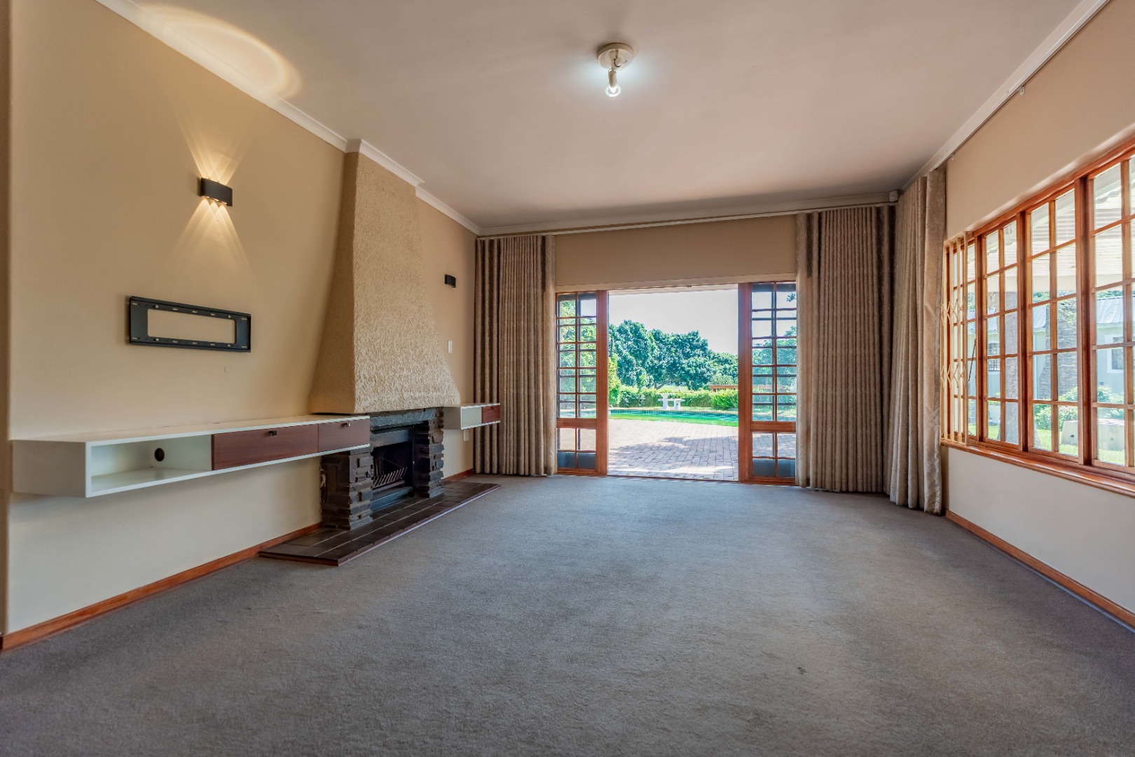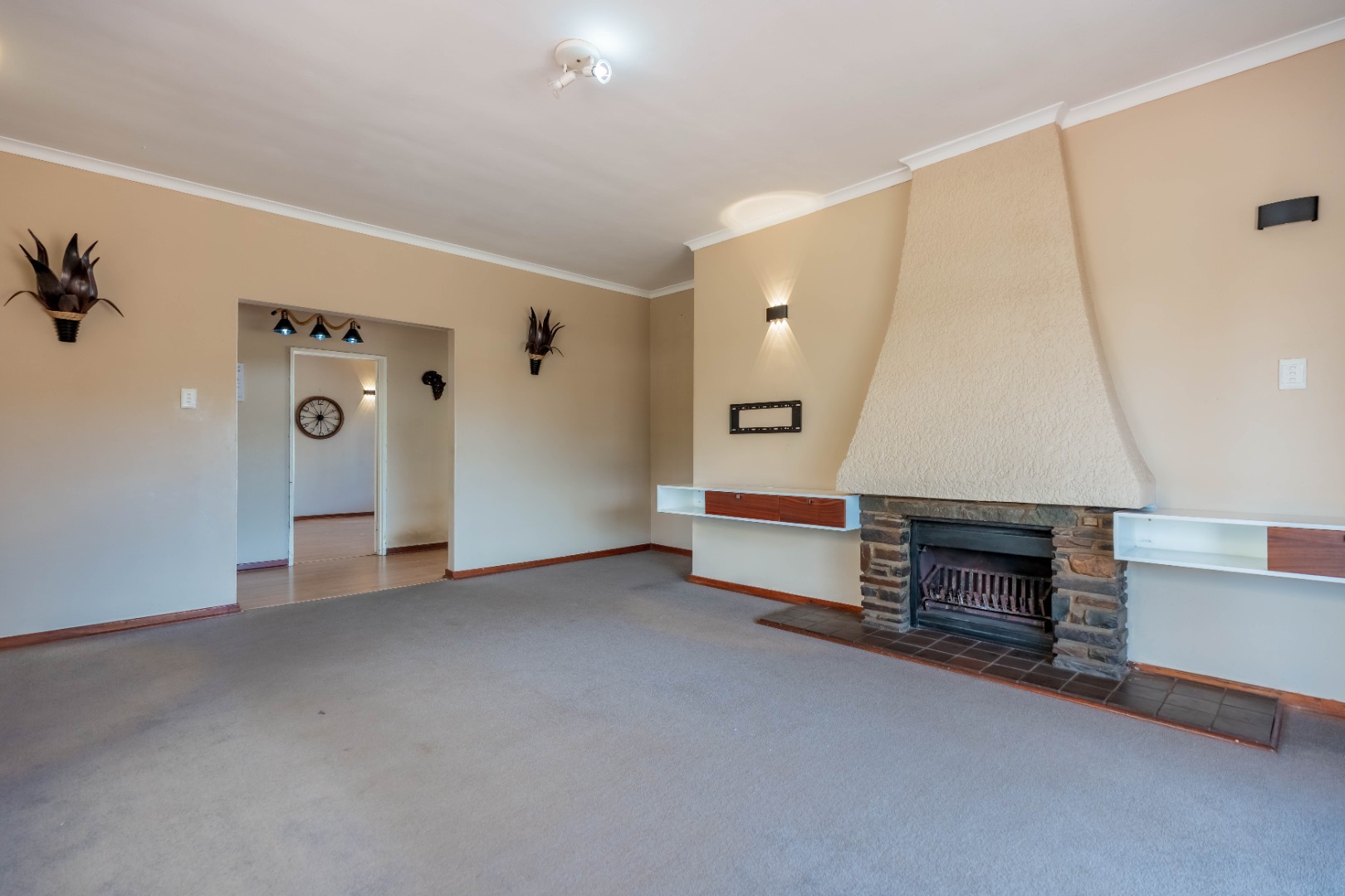 As you enter the home, you’re welcomed by a spacious lounge to your left, complete with a cozy fireplace. The lounge flows seamlessly onto a covered patio, overlooking a sparkling pool and a level, child-friendly garden – ideal for entertaining and relaxed family living.