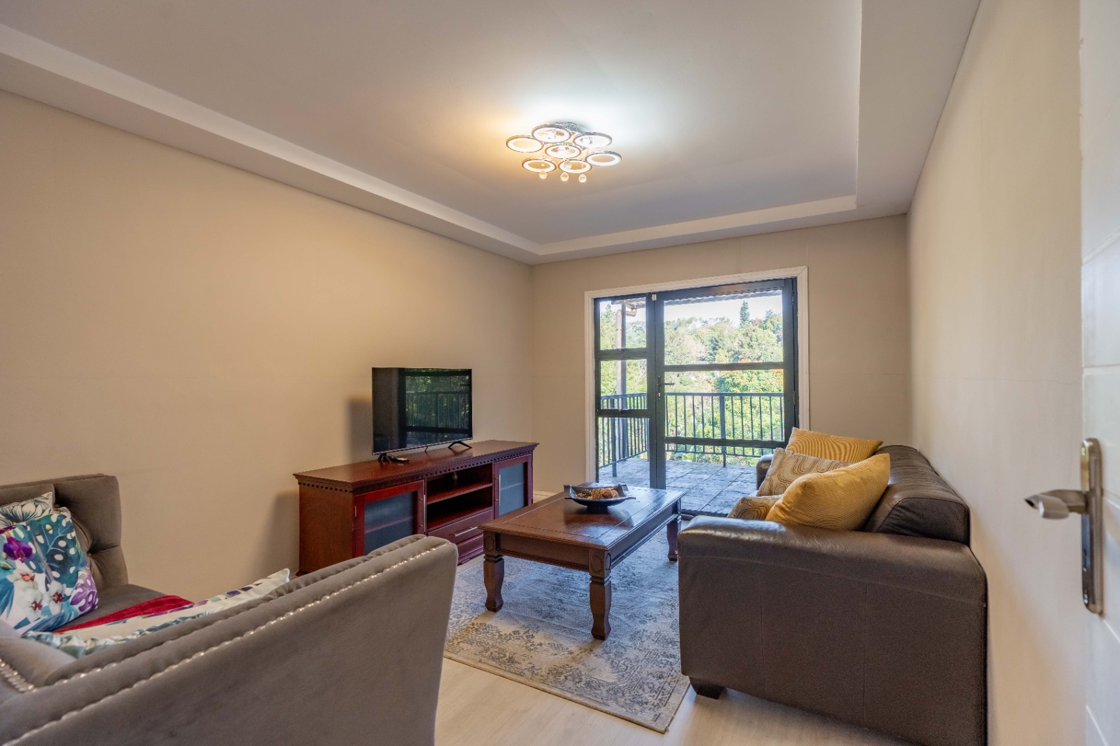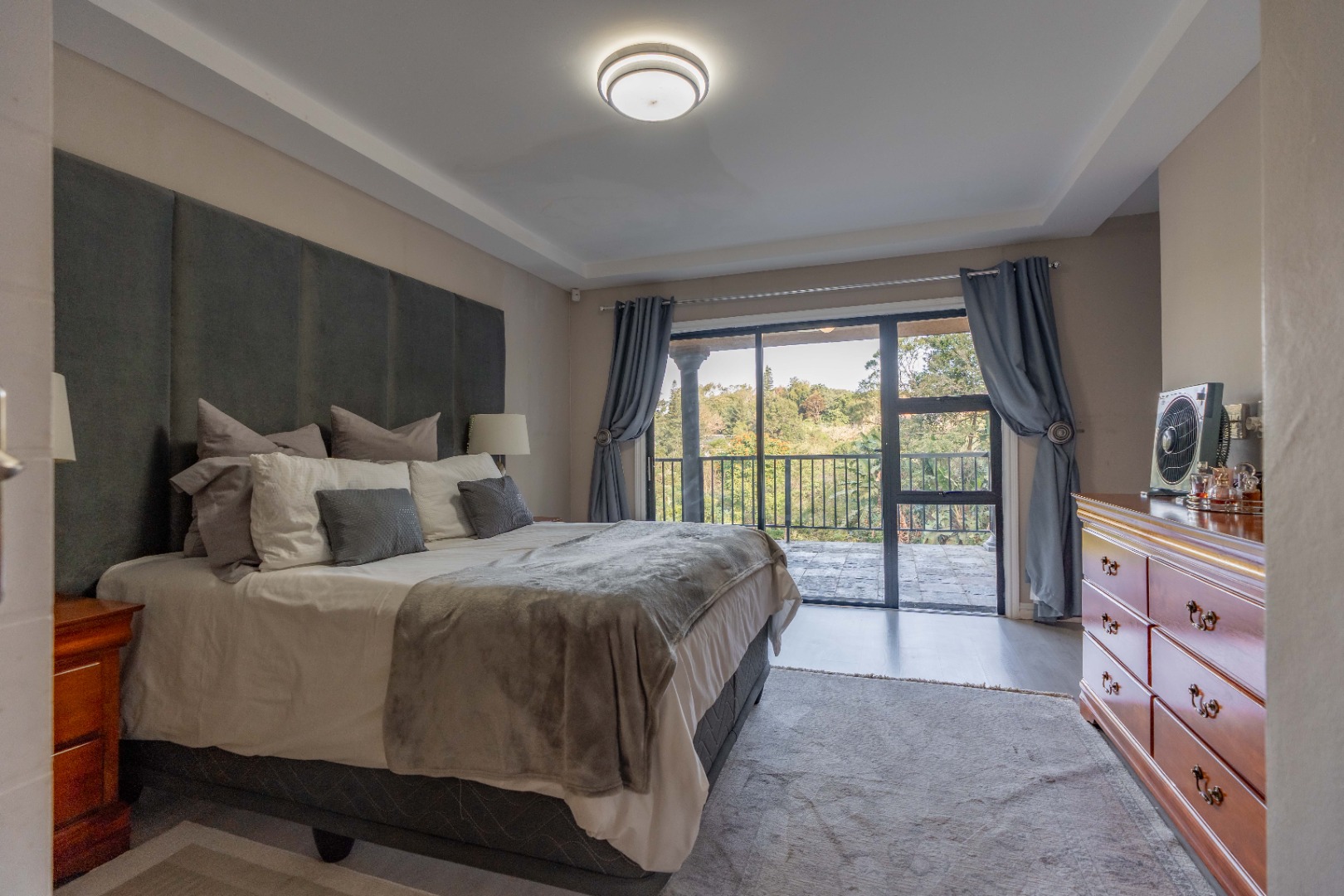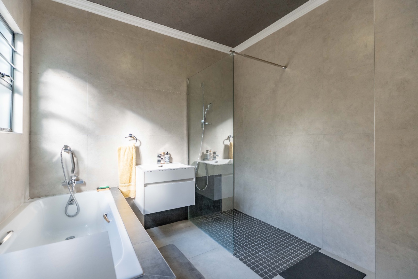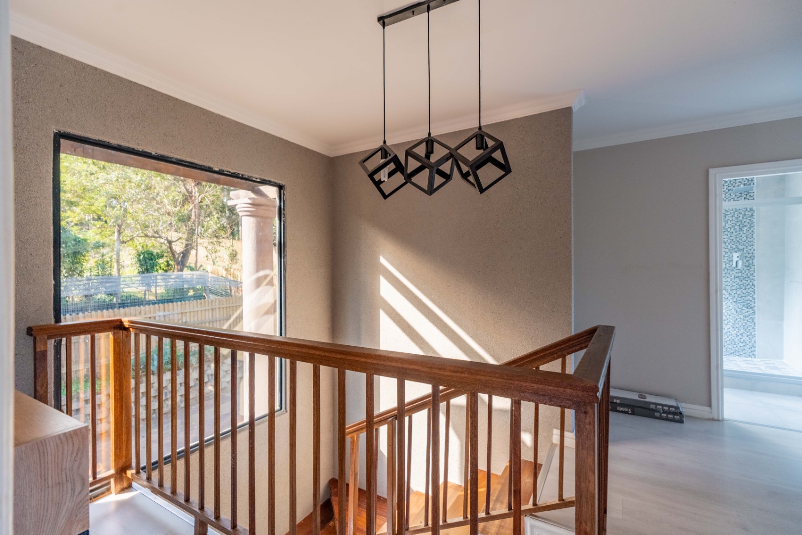 Upstairs offers a spacious main bedroom with a walk-in closet, stylish en-suite bathroom featuring a large open shower. There are sliding doors leading onto a private balcony overlooking peaceful greenery and birdlife.