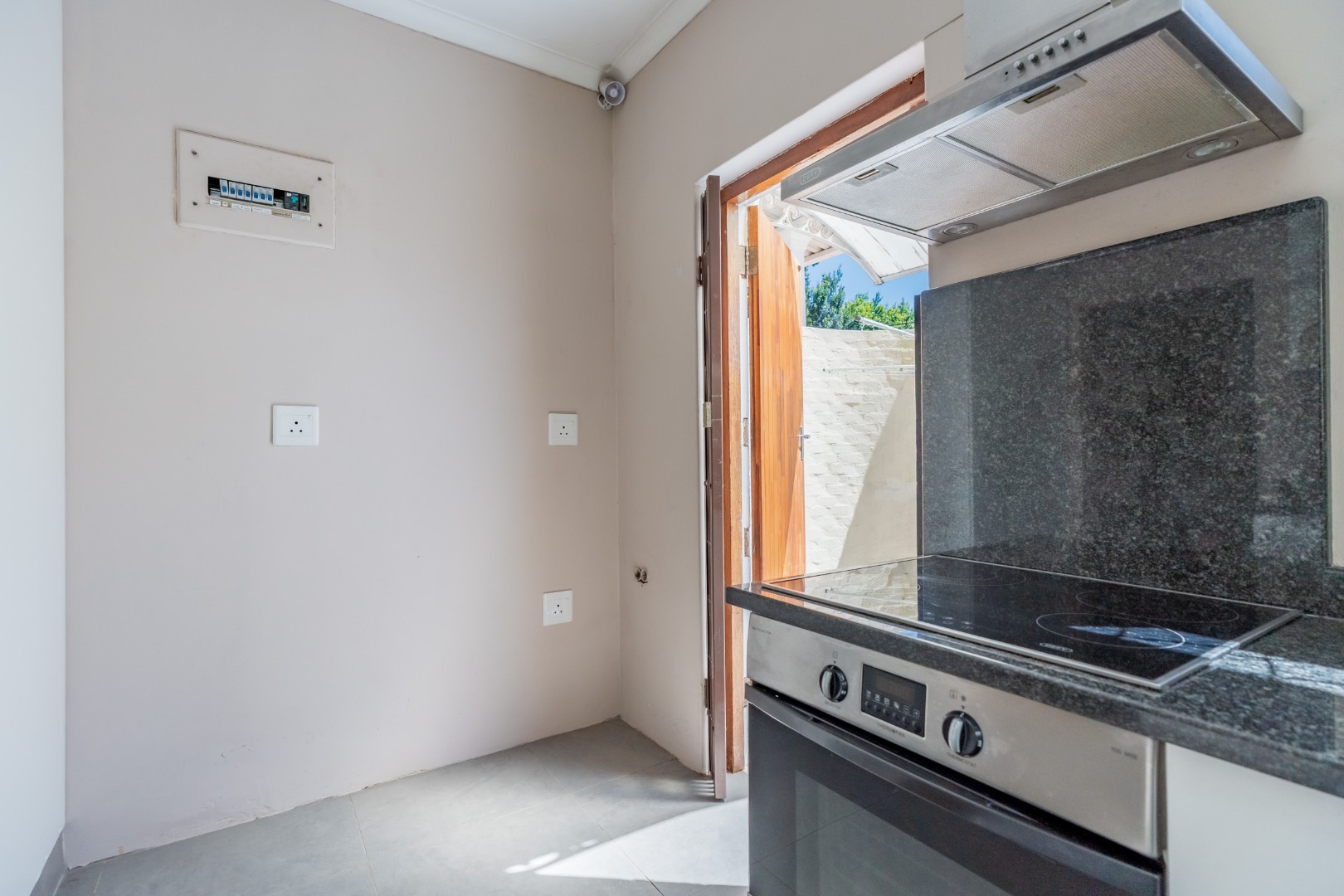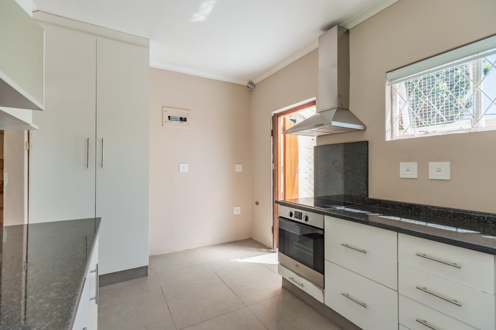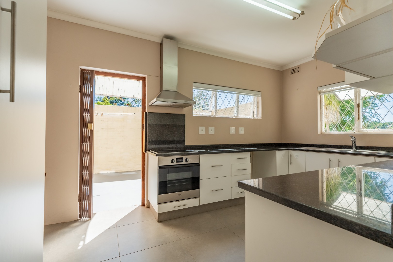 The modern, spacious kitchen boasts granite countertops and opens onto a large, sunny courtyard, providing additional outdoor space and convenience.