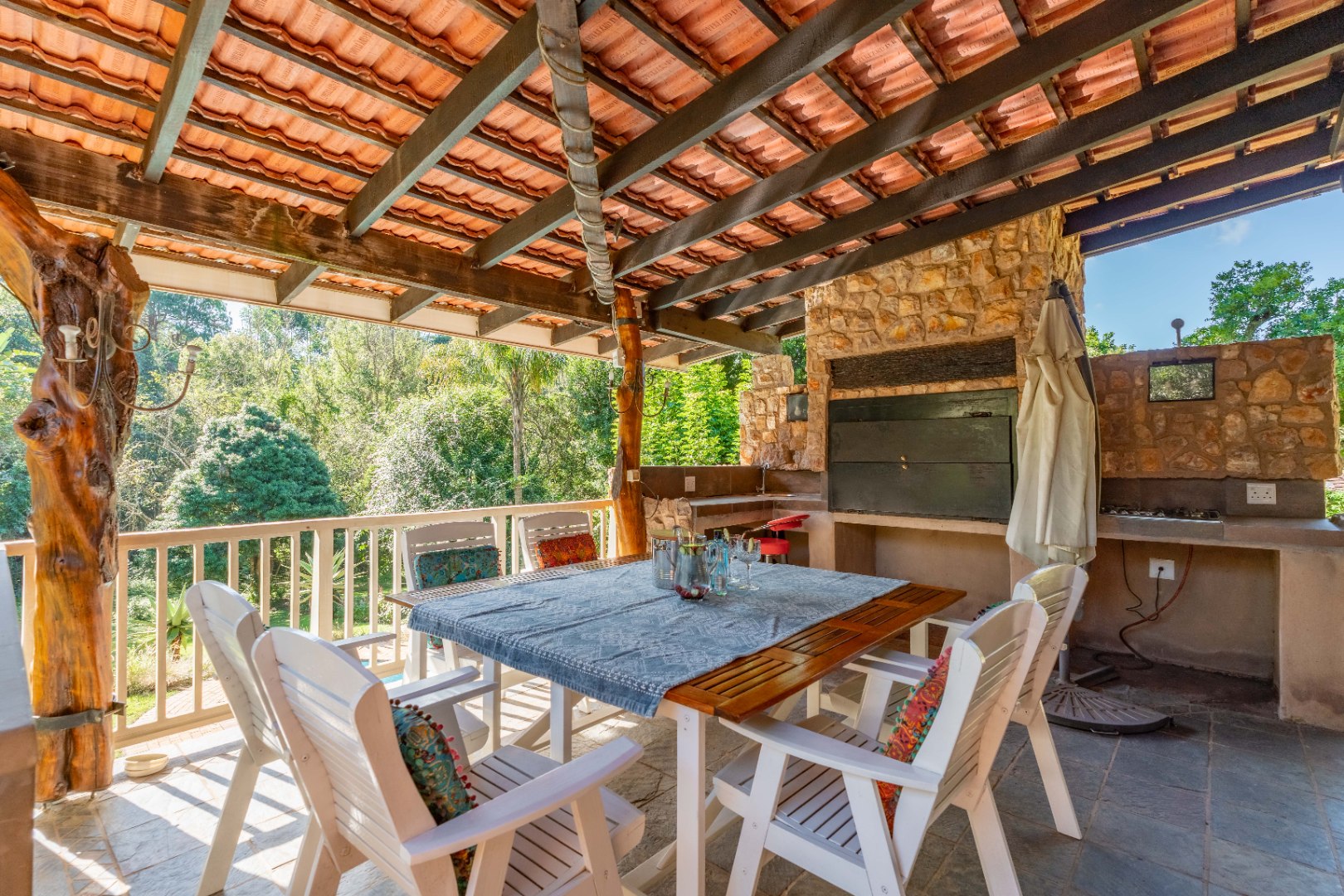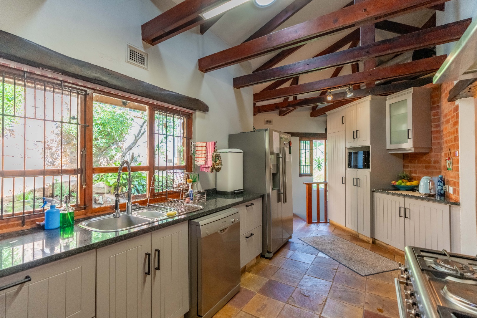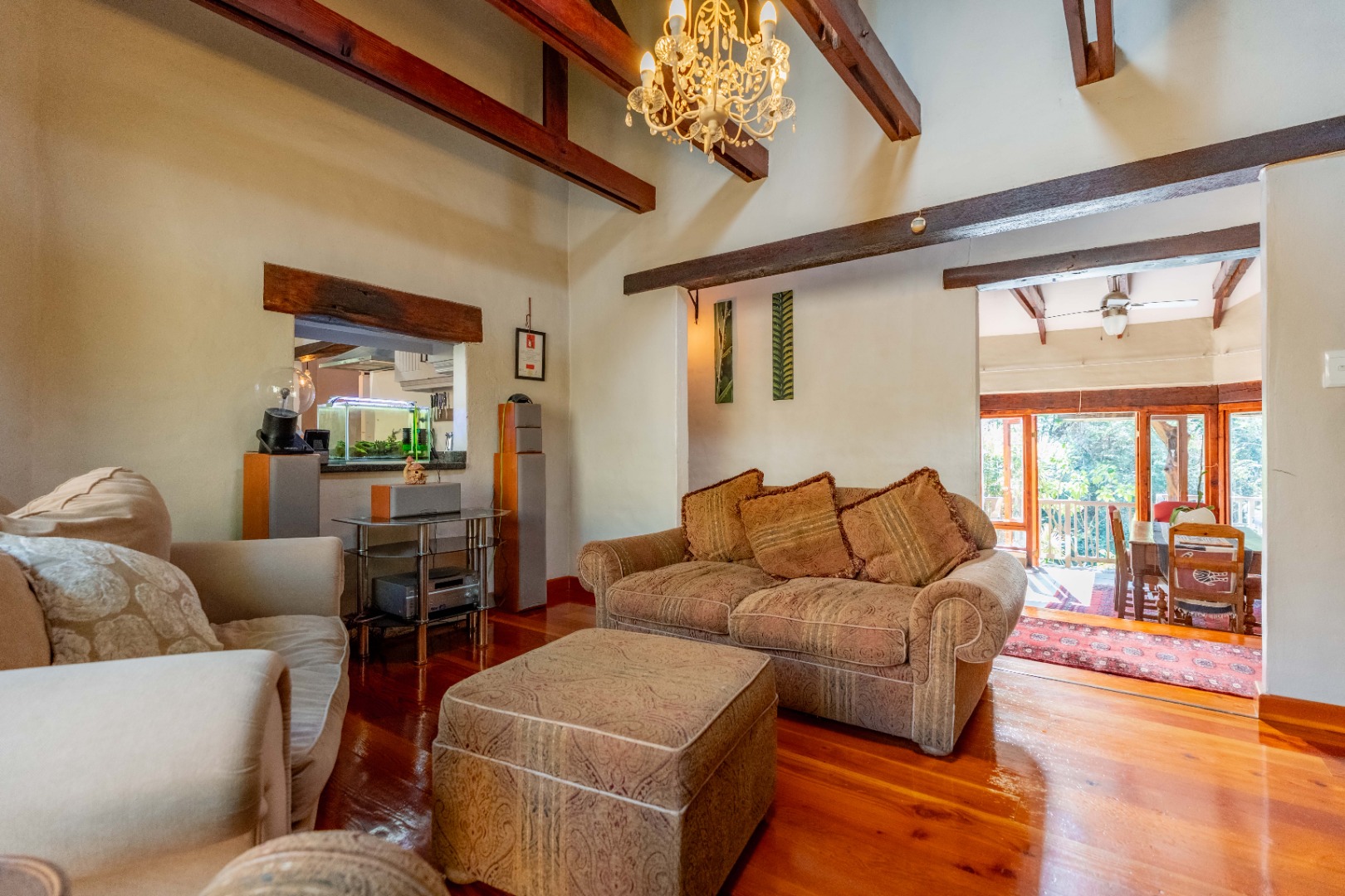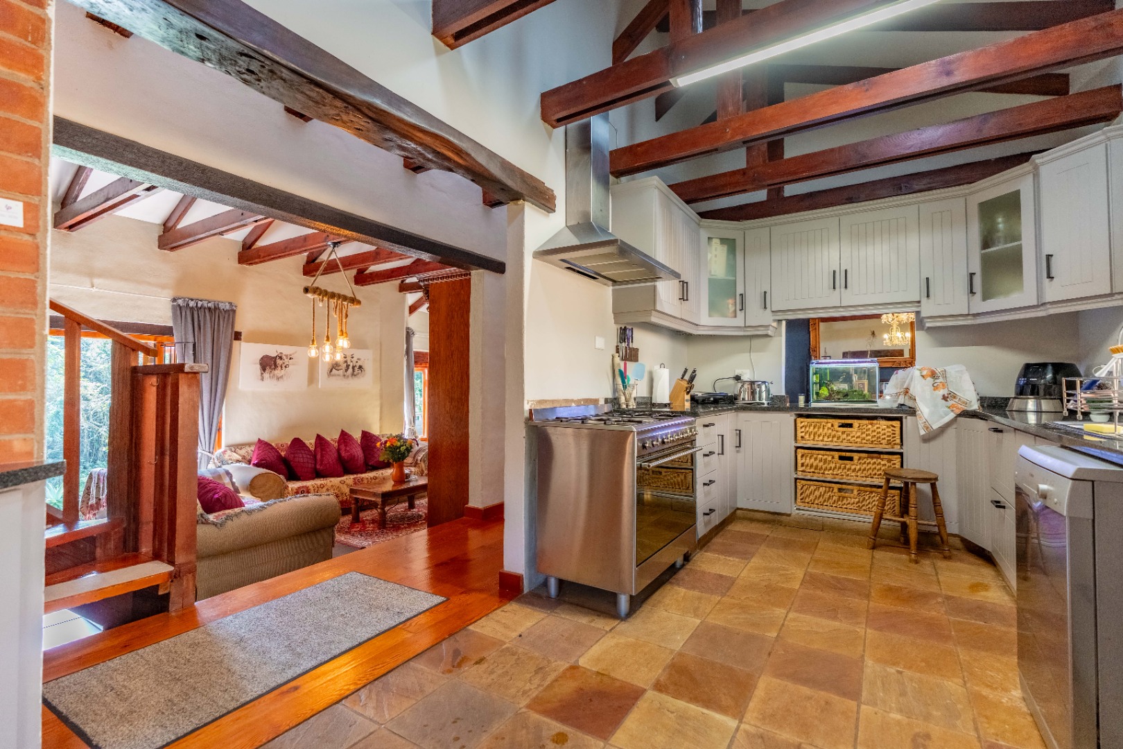 The inviting lounge opens onto a covered patio, ideal for enjoying a sundowner while overlooking a large sparkling pool and a lush, nature-inspired garden. The kitchen features a gas hob with electric stove, ample storage, and a separate scullery for added convenience.