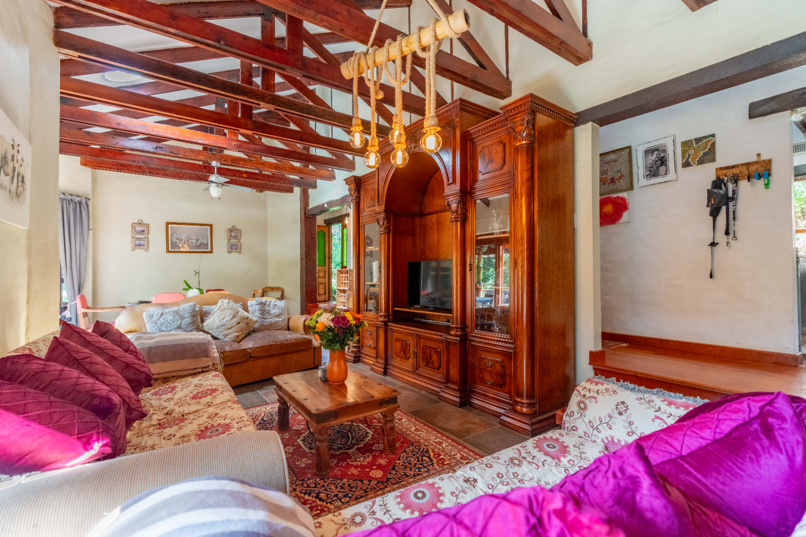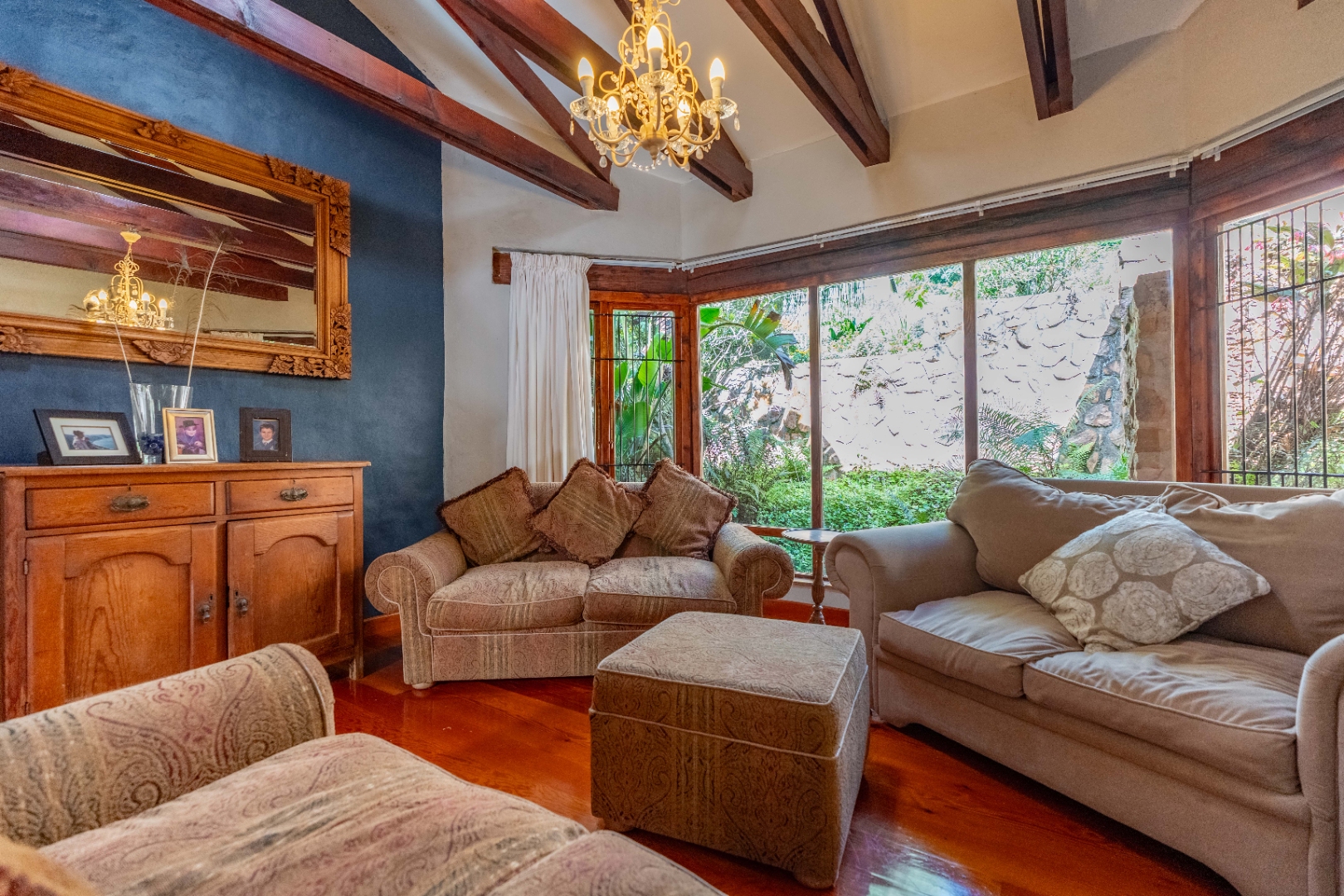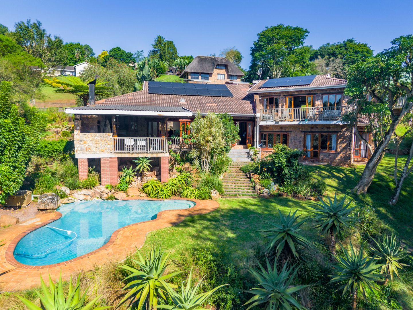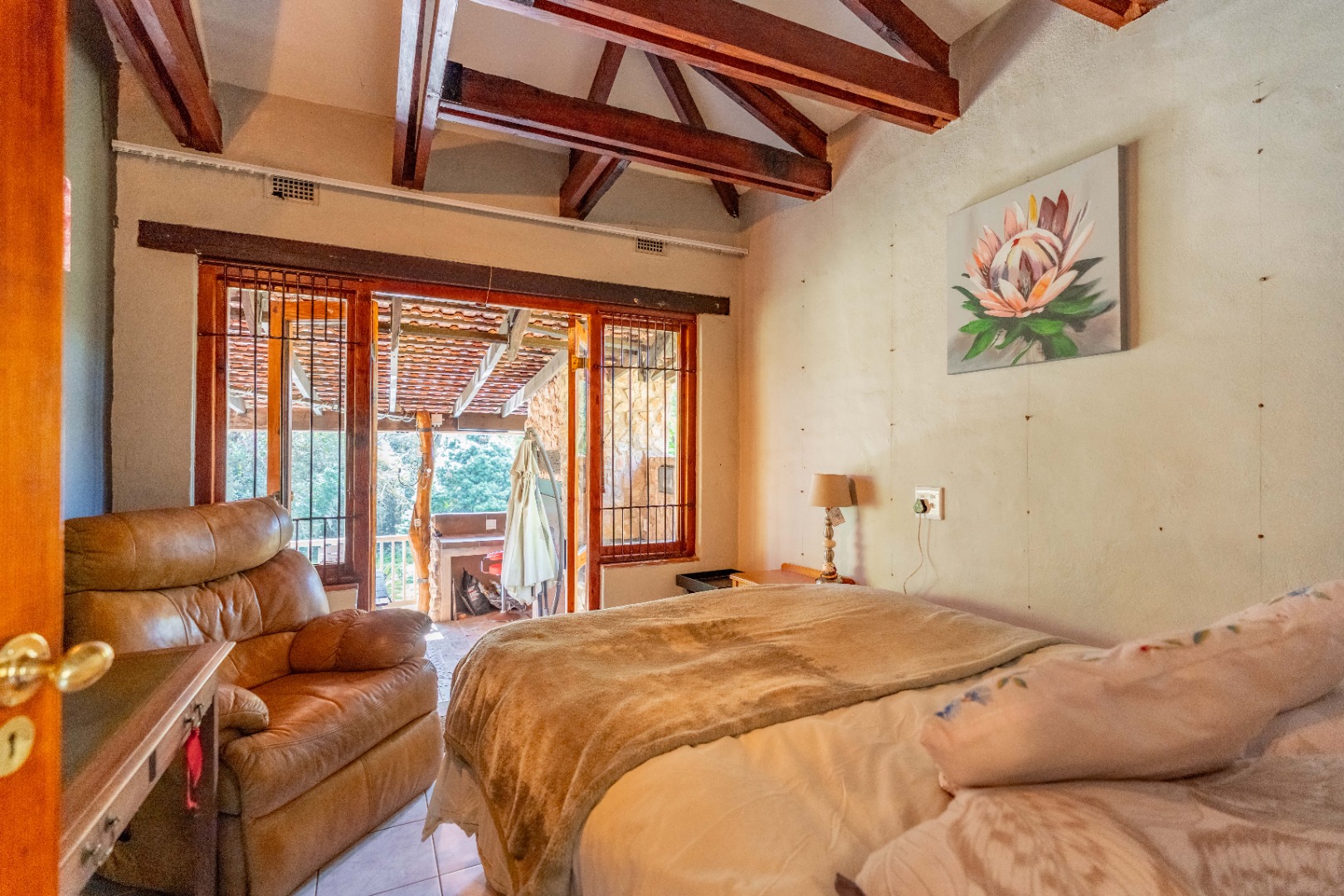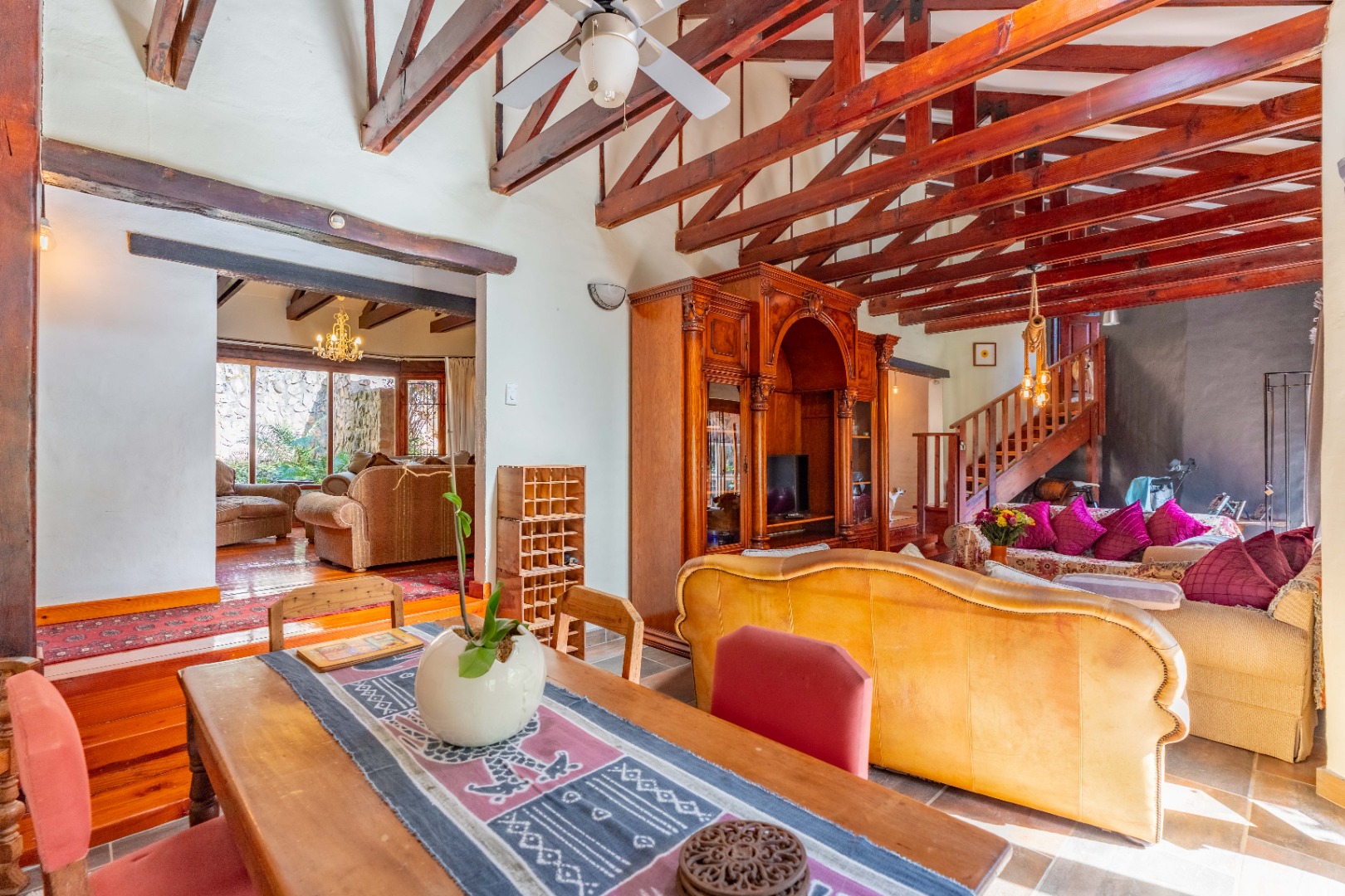 The inviting lounge opens onto a covered patio, ideal for enjoying a sundowner while overlooking a large sparkling pool and a lush, nature-inspired garden. The kitchen features a gas hob with electric stove, ample storage, and a separate scullery for added convenience.