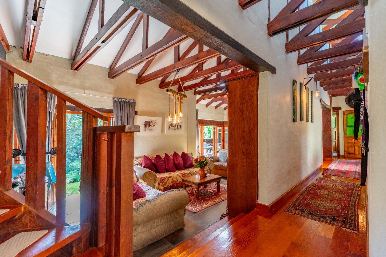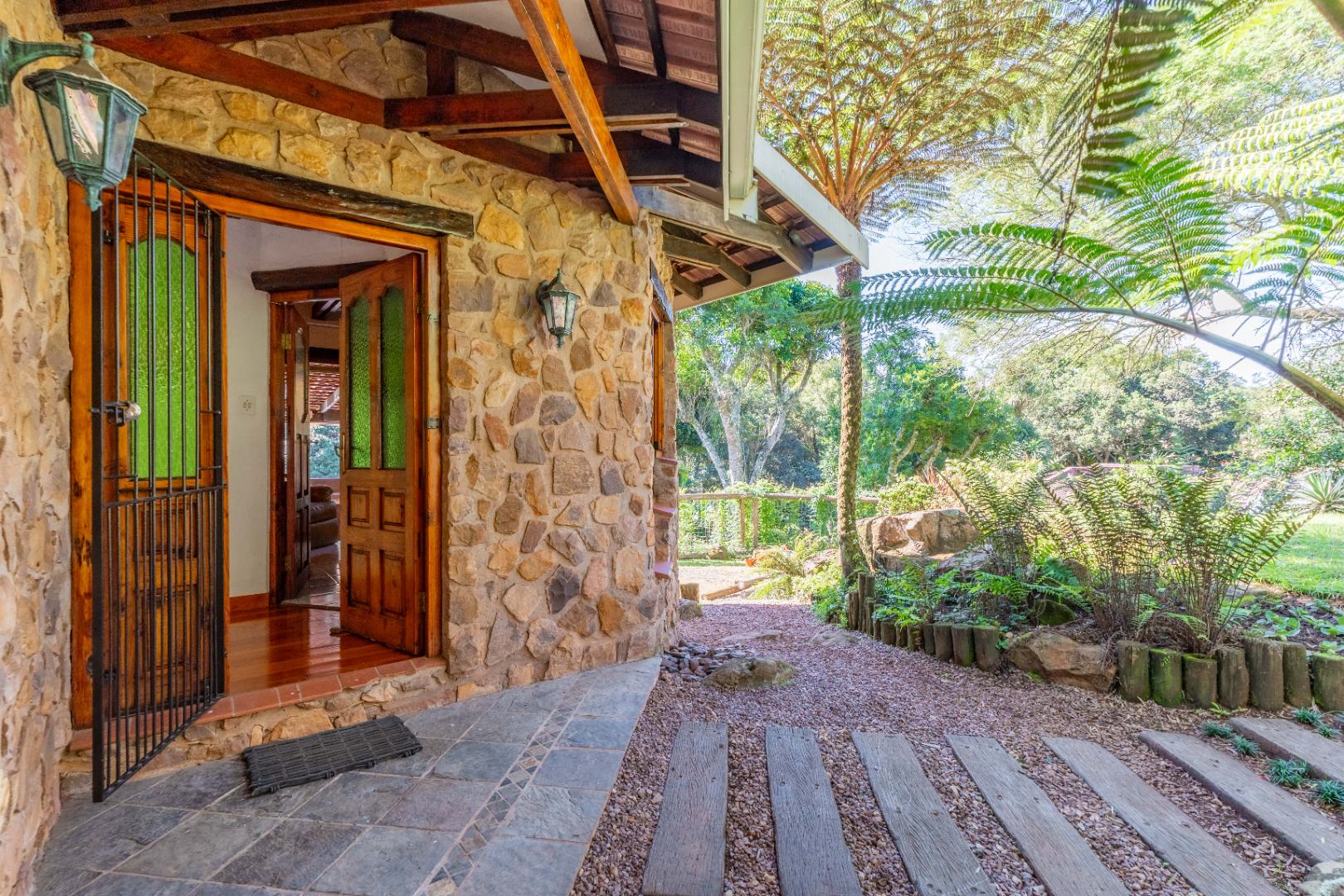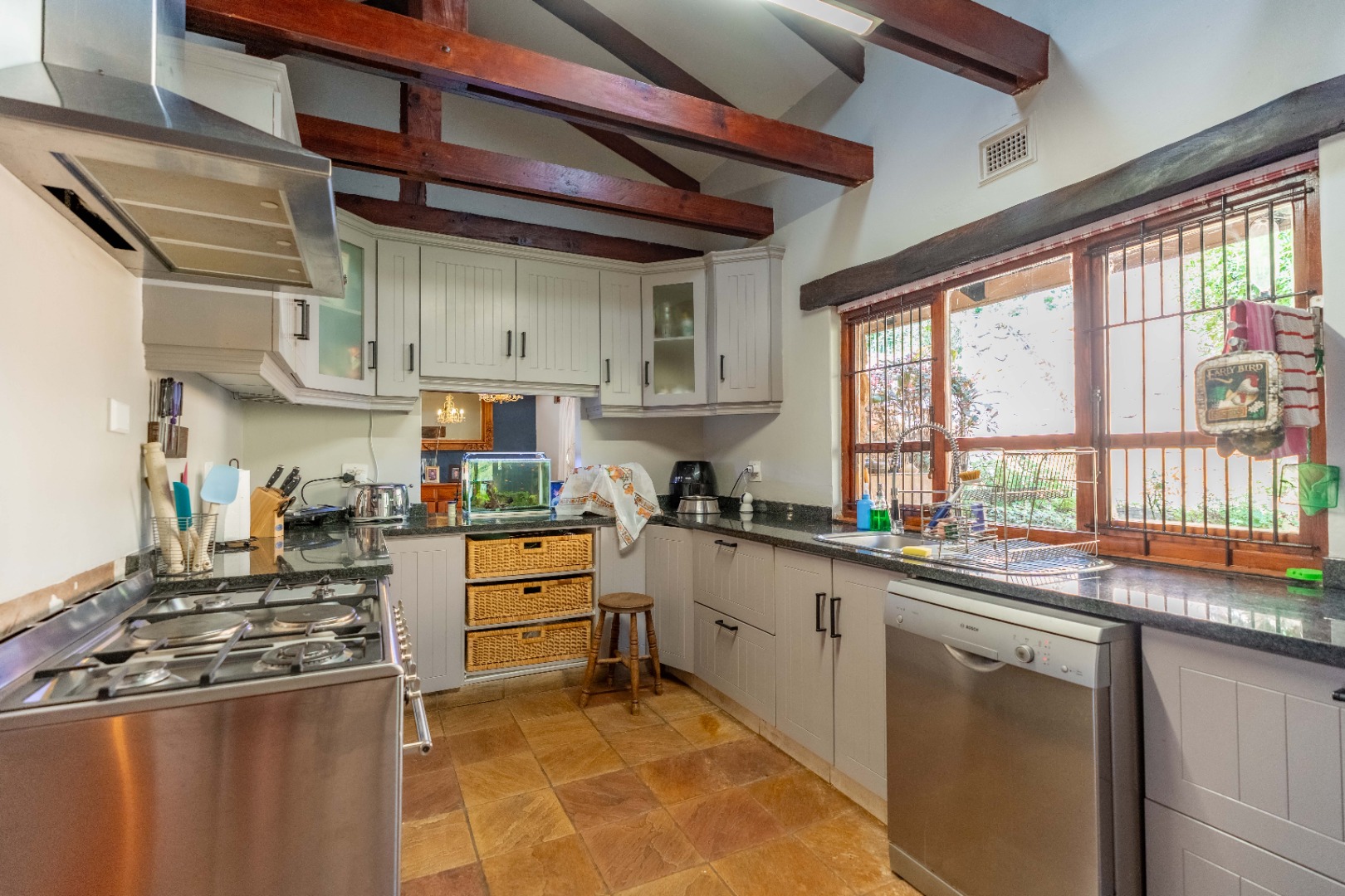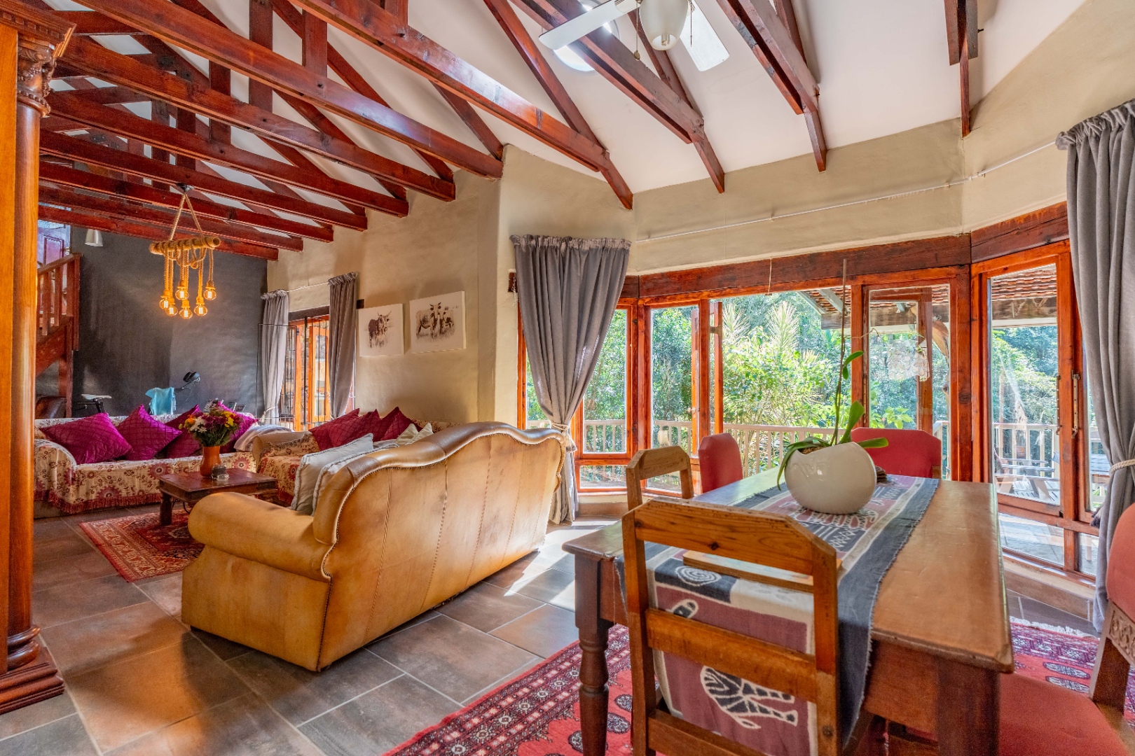 The inviting lounge opens onto a covered patio, ideal for enjoying a sundowner while overlooking a large sparkling pool and a lush, nature-inspired garden. The kitchen features a gas hob with electric stove, ample storage, and a separate scullery for added convenience.