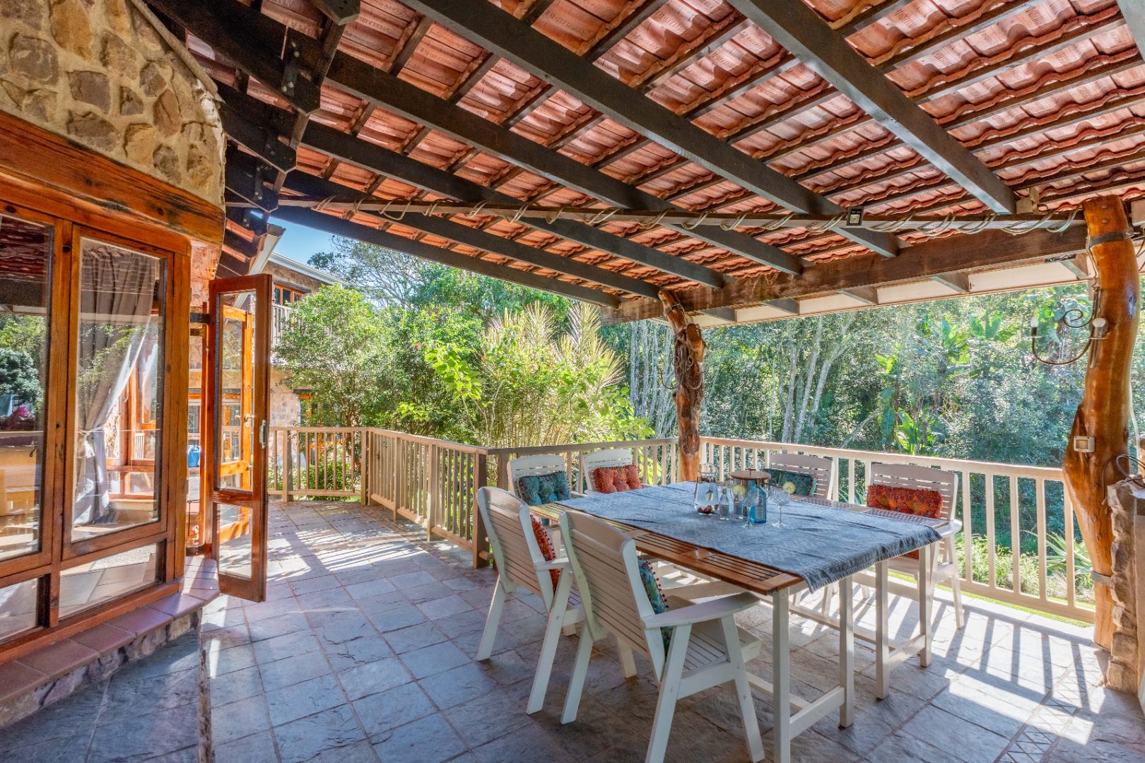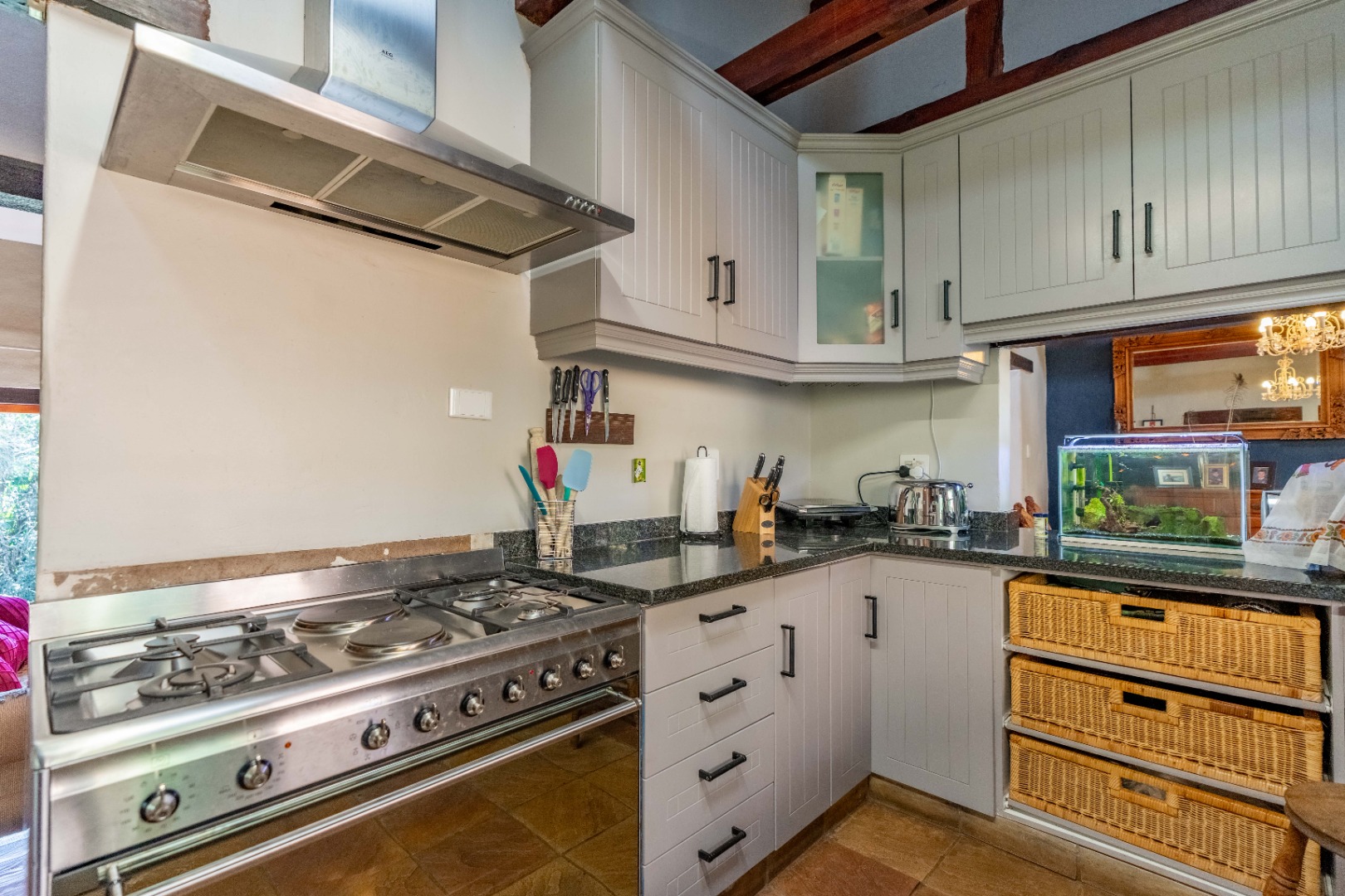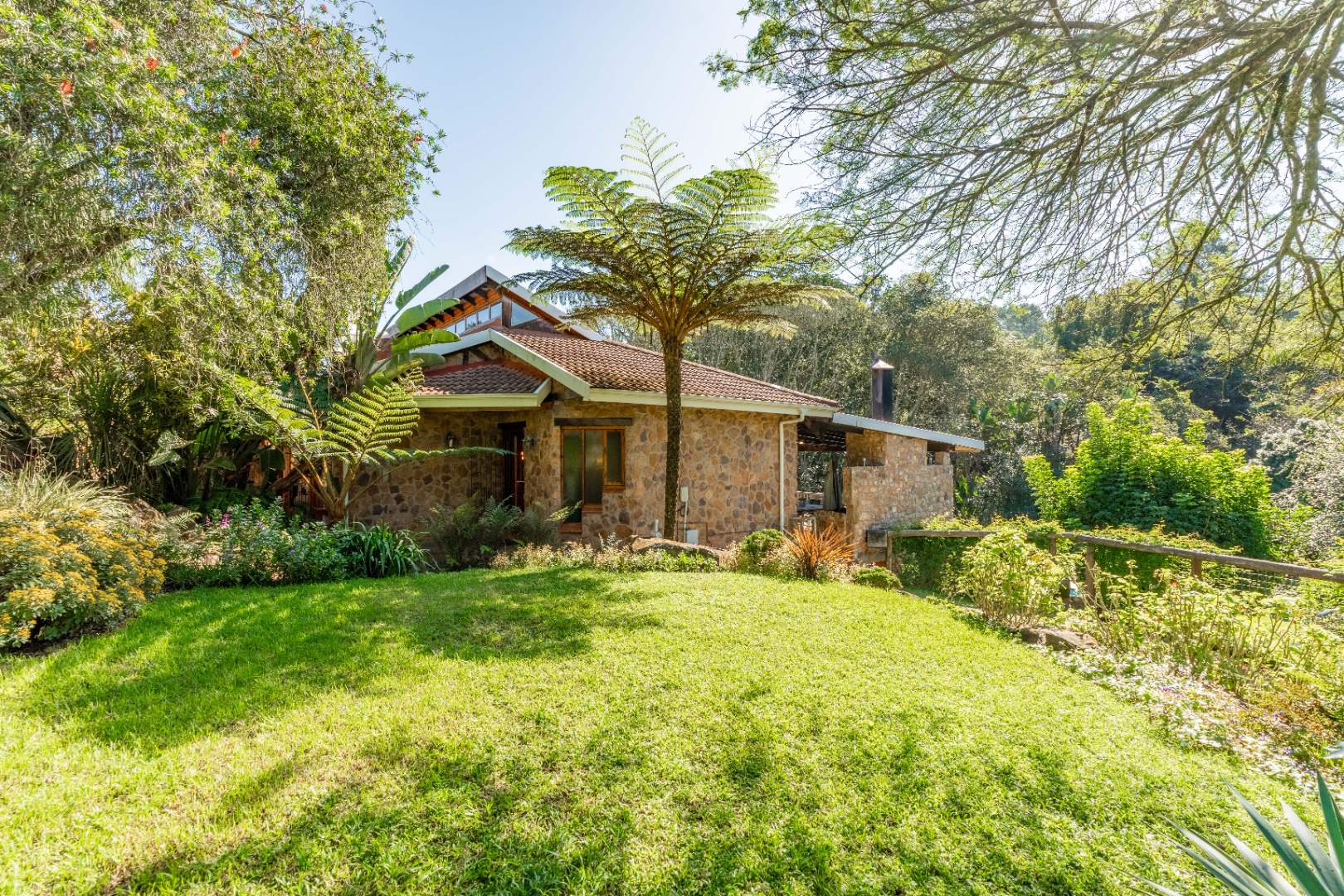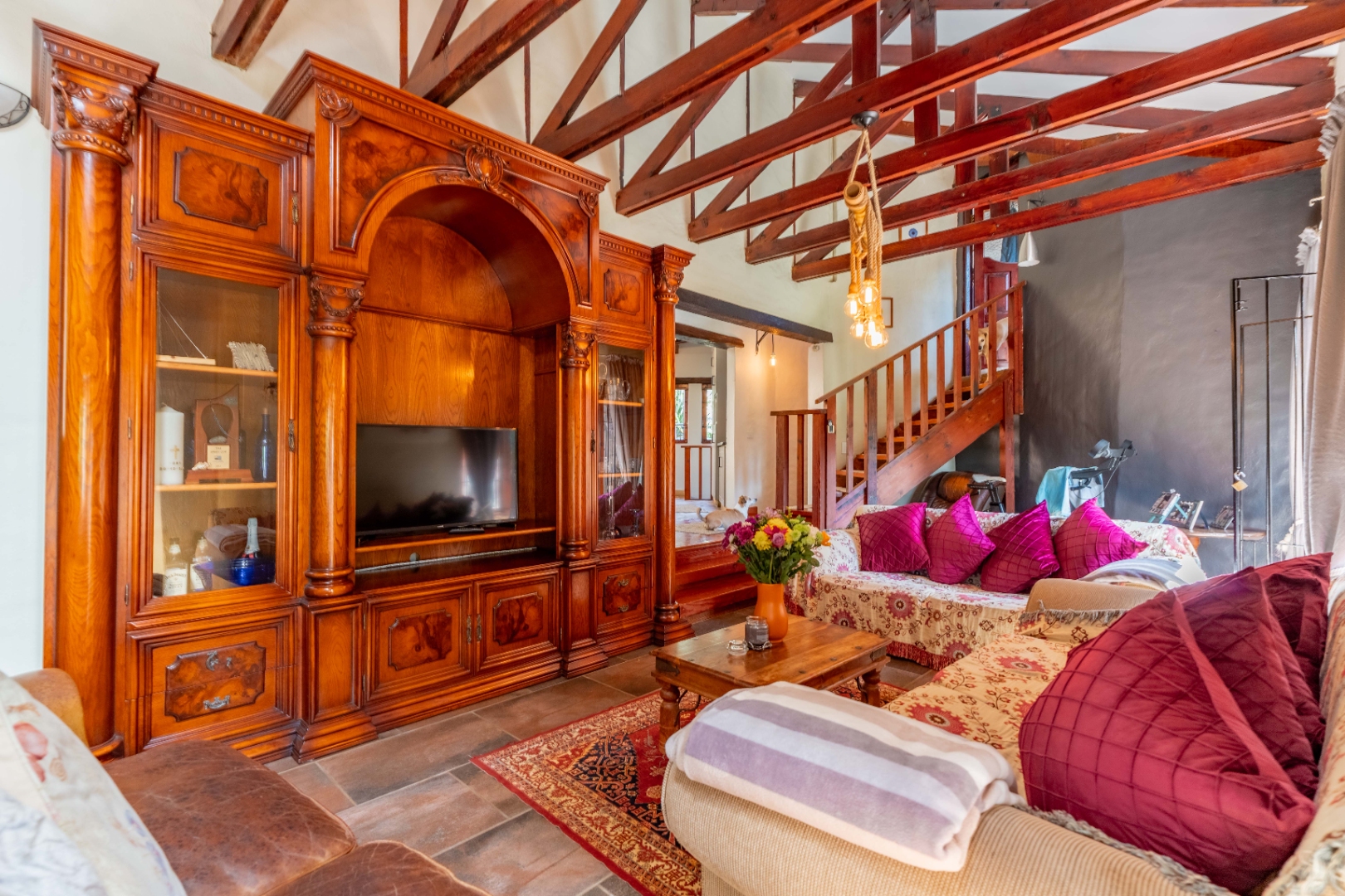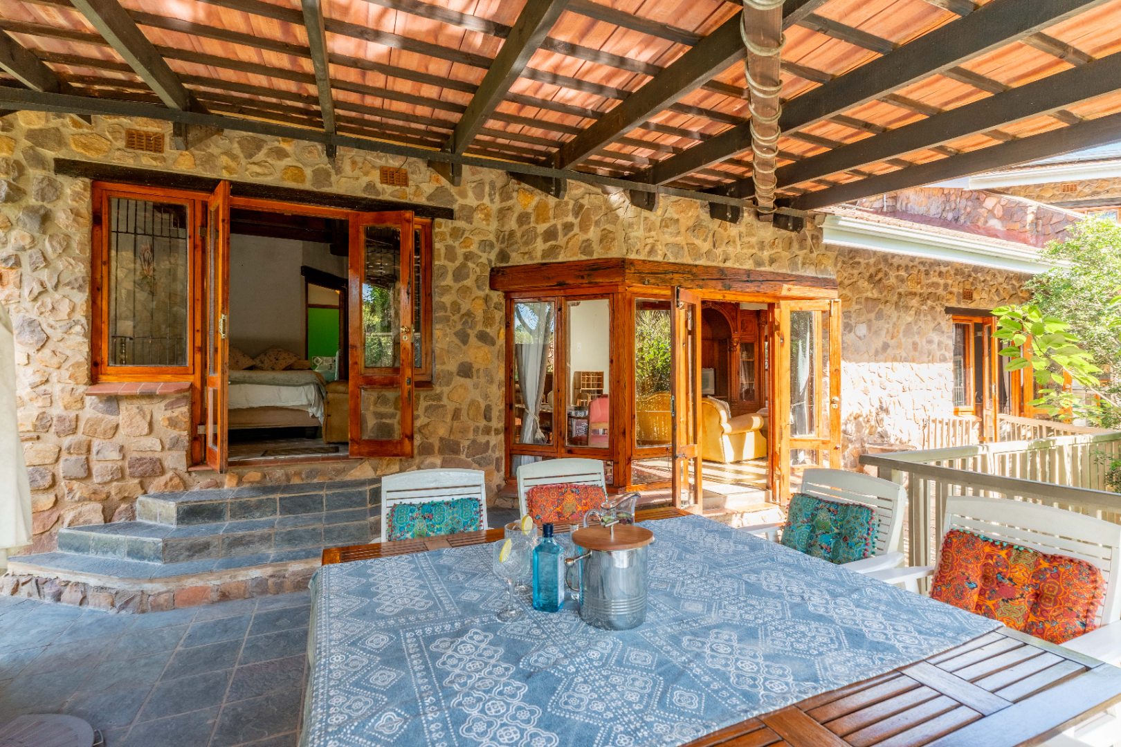 The inviting lounge opens onto a covered patio, ideal for enjoying a sundowner while overlooking a large sparkling pool and a lush, nature-inspired garden. The kitchen features a gas hob with electric stove, ample storage, and a separate scullery for added convenience.