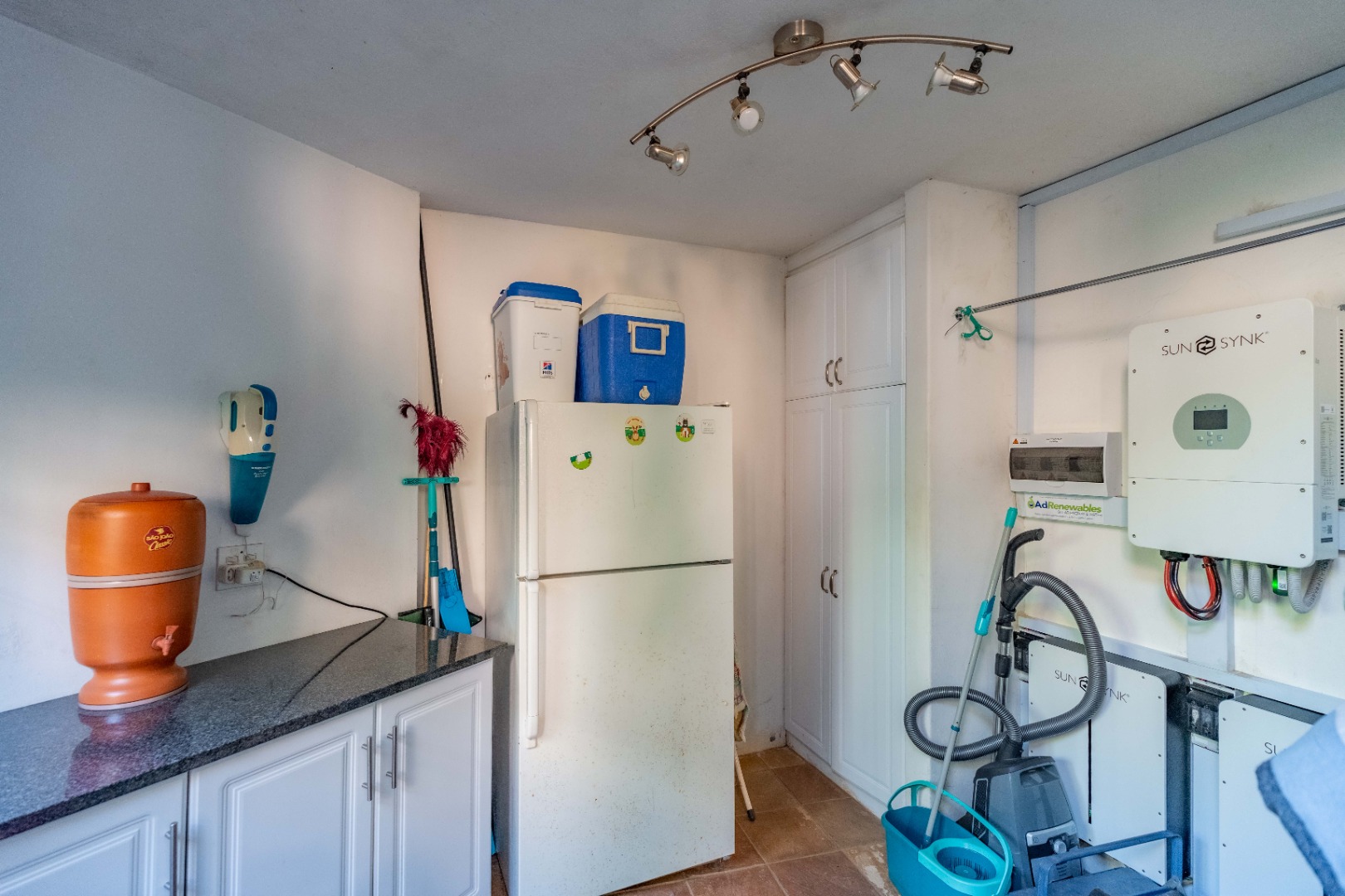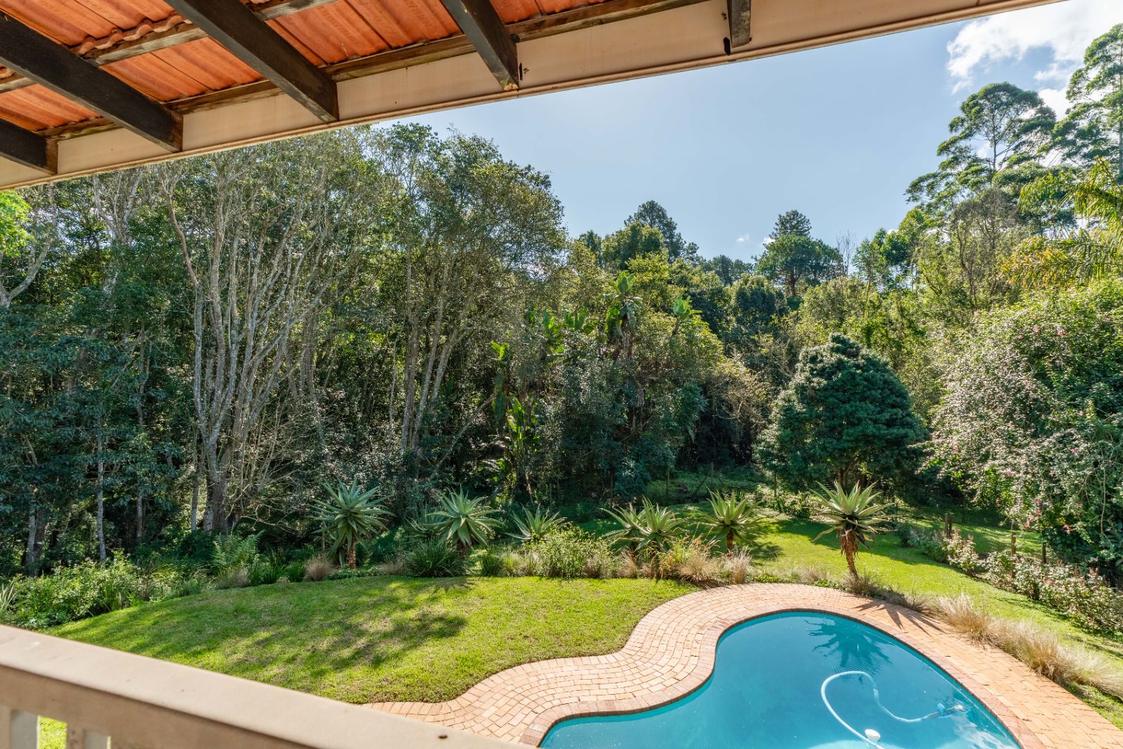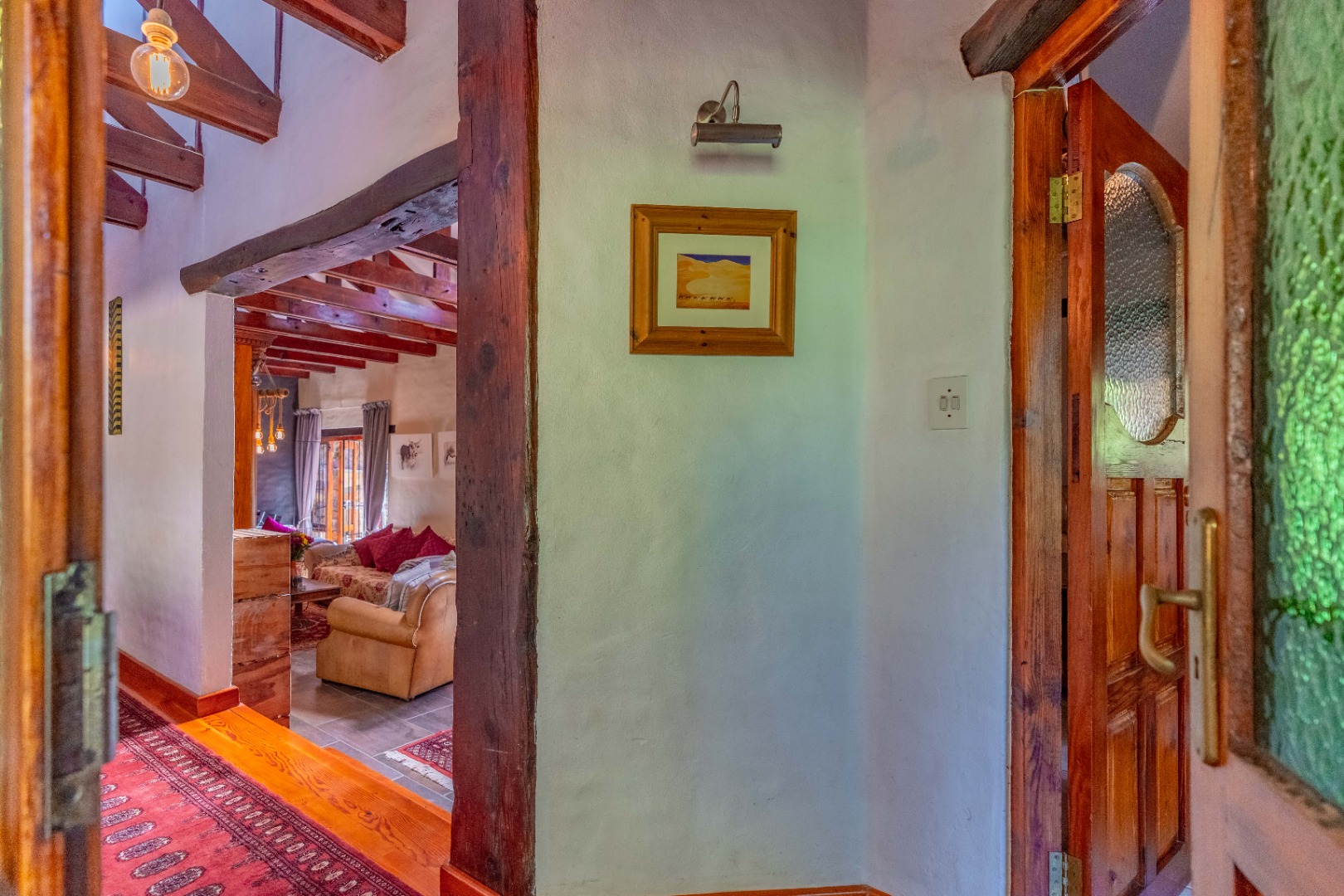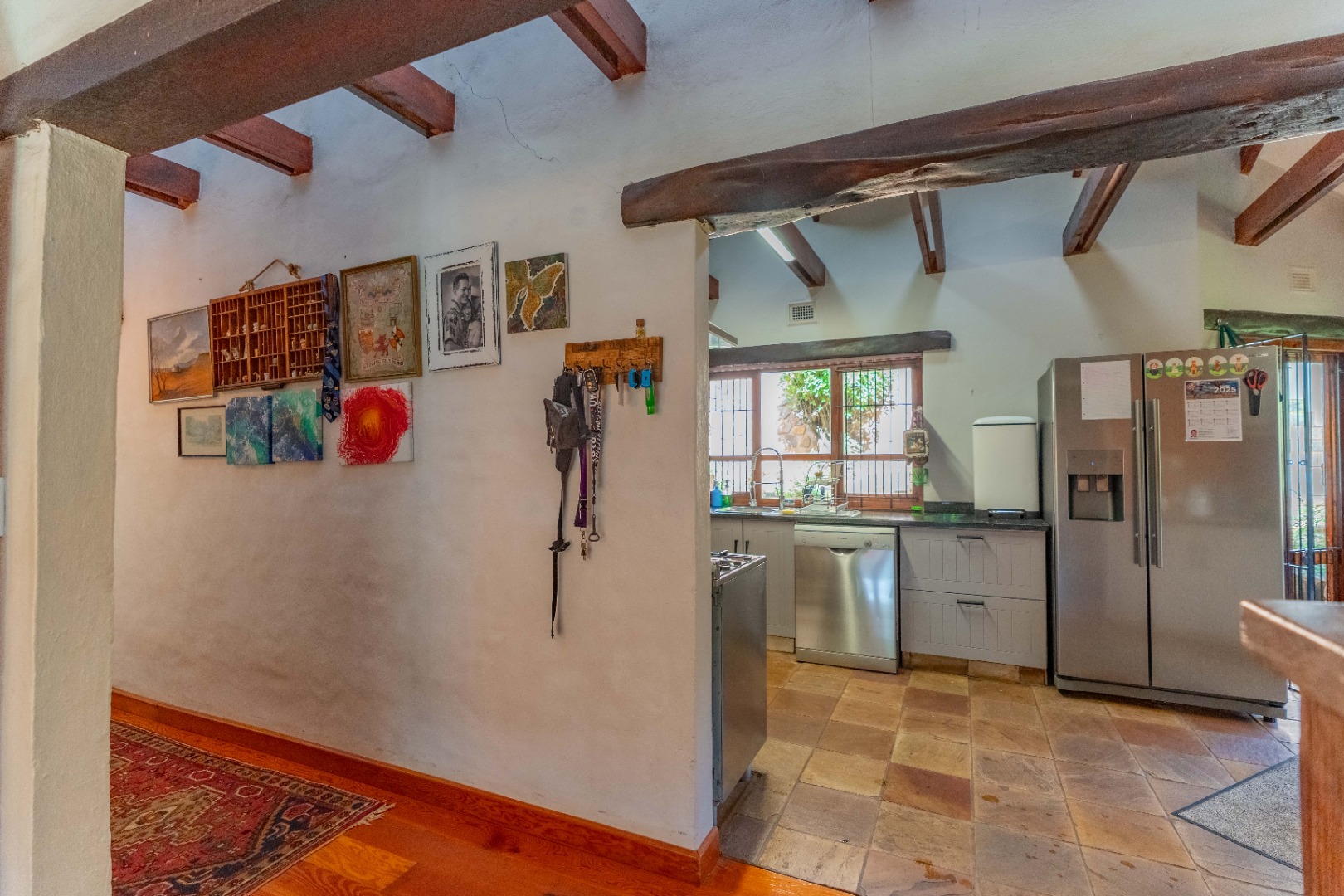 The inviting lounge opens onto a covered patio, ideal for enjoying a sundowner while overlooking a large sparkling pool and a lush, nature-inspired garden. The kitchen features a gas hob with electric stove, ample storage, and a separate scullery for added convenience.