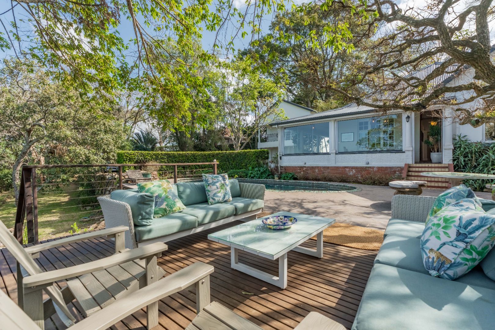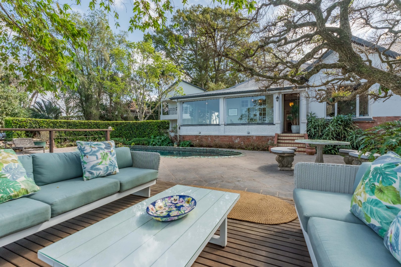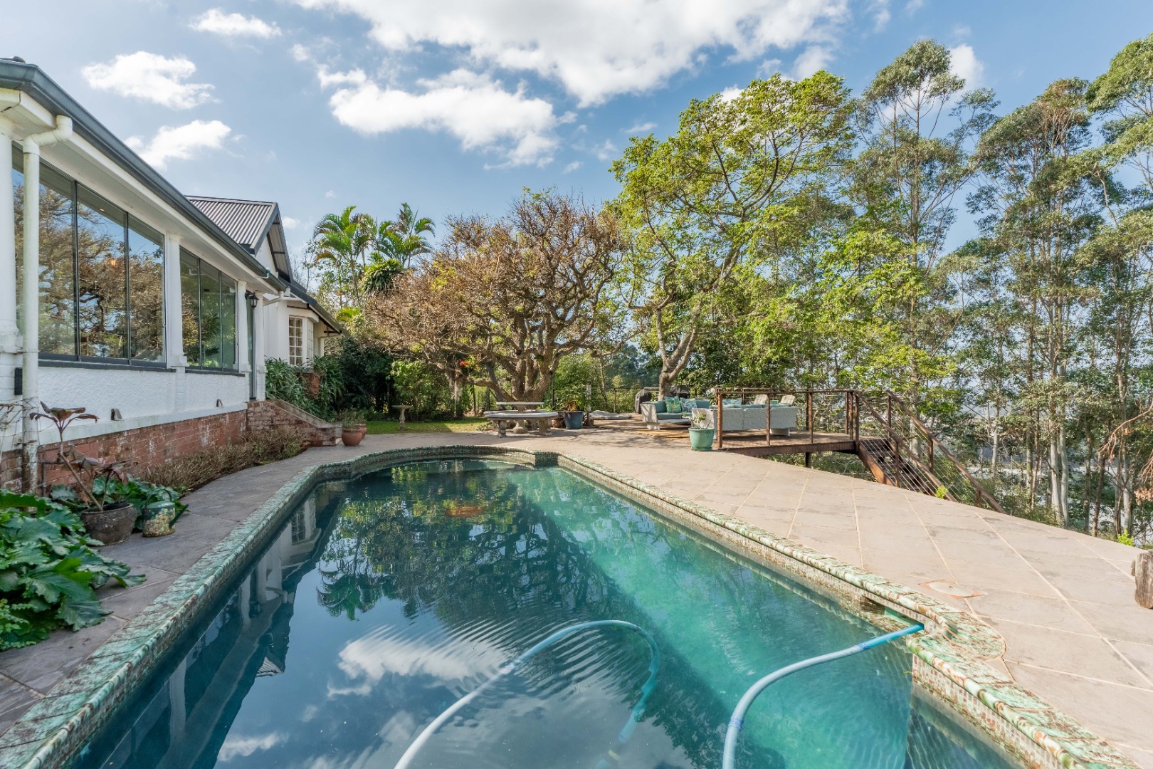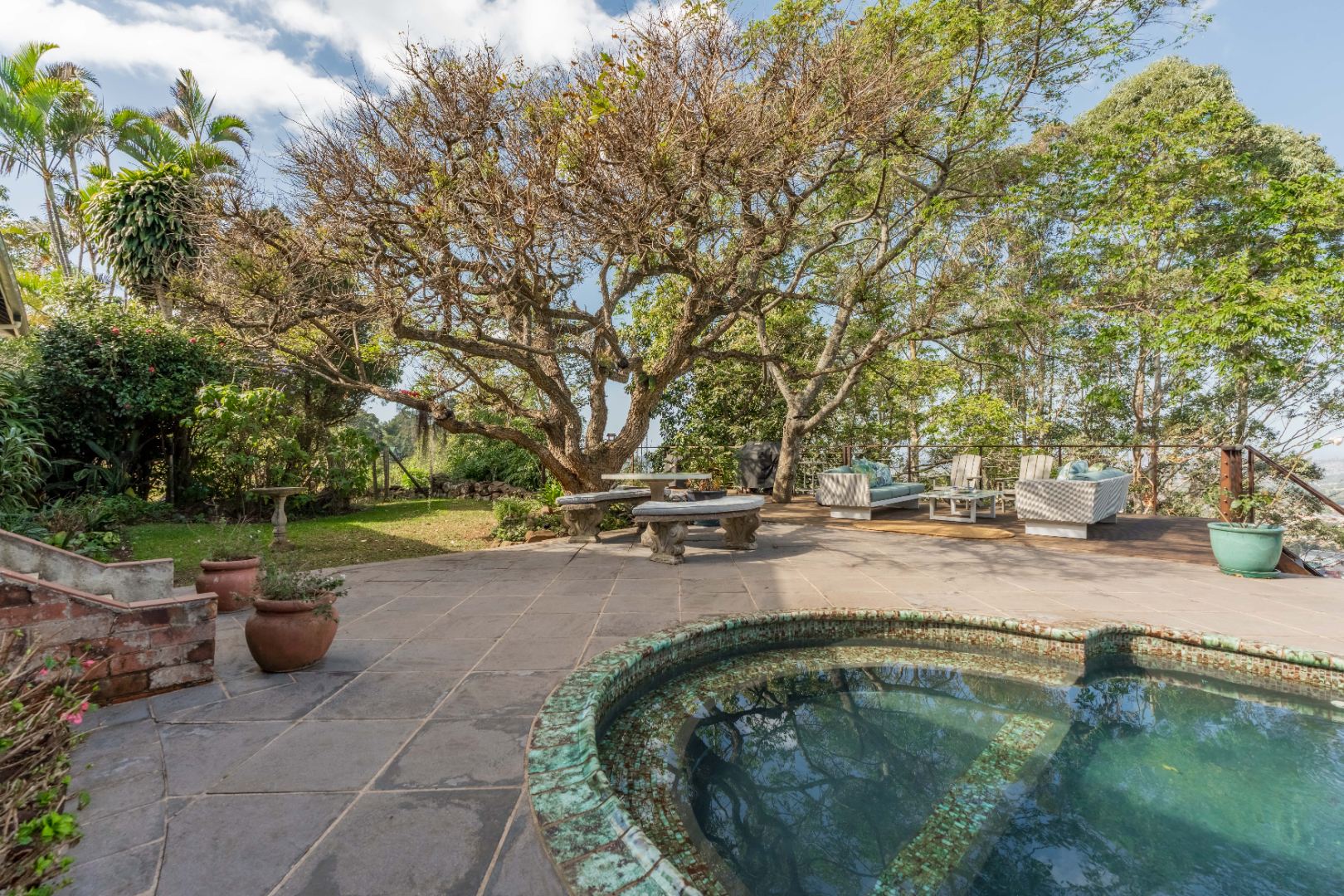 Semi wrap around verandah with views over the garden and sparkling pool. A built in hot tub on the patio, ideal to chill with endless views.