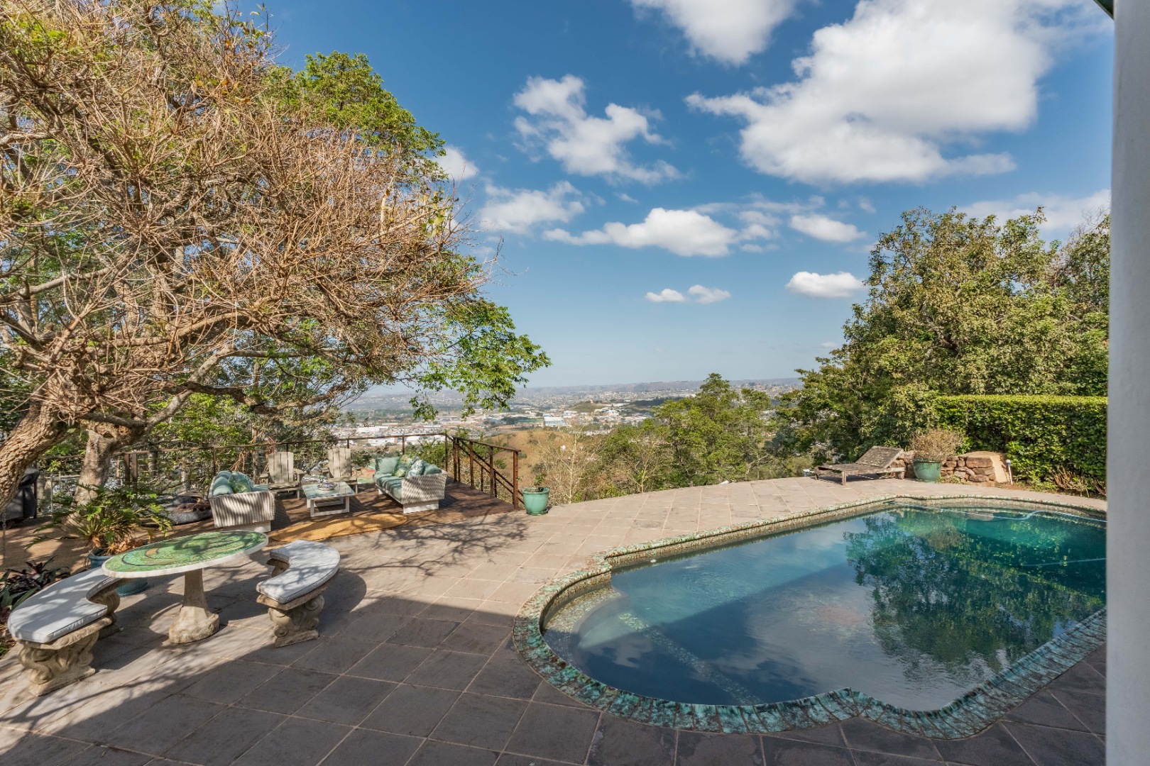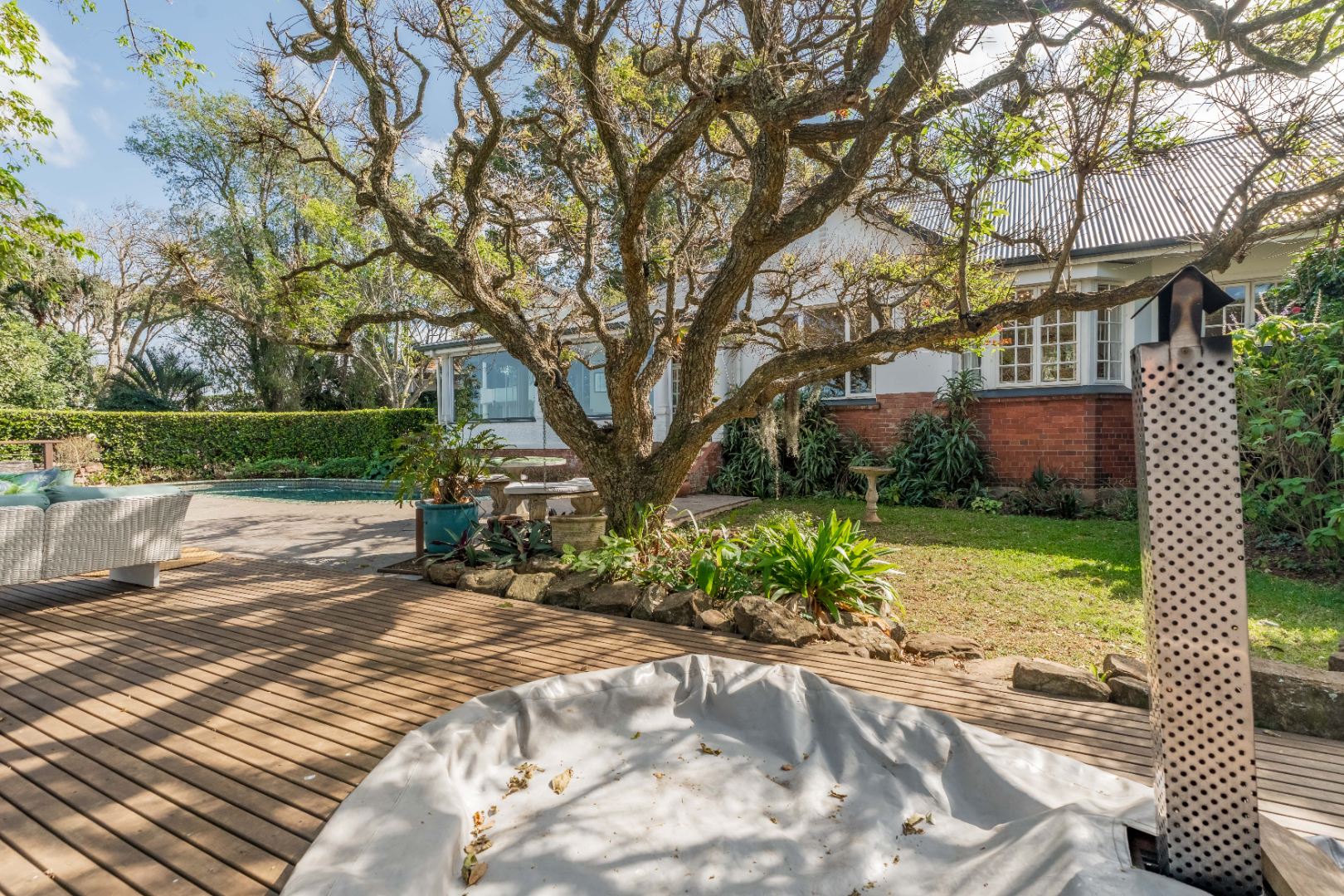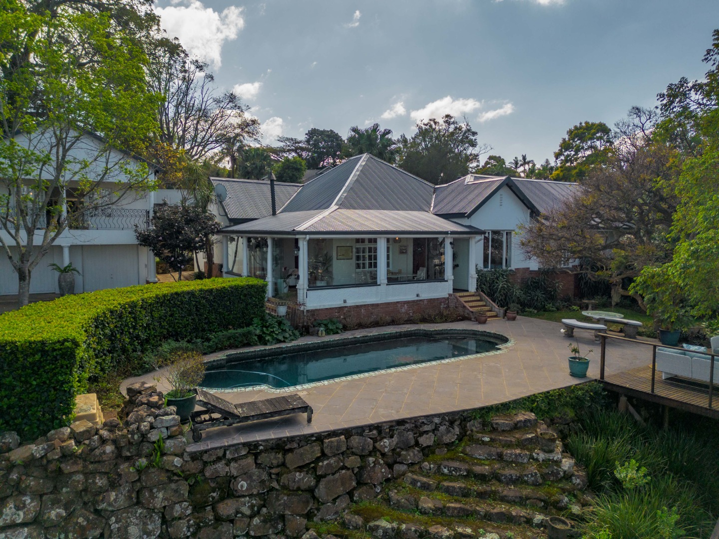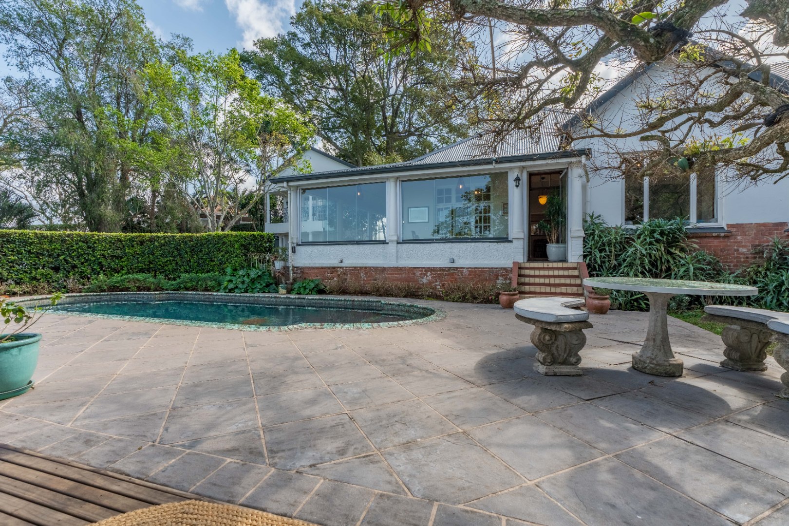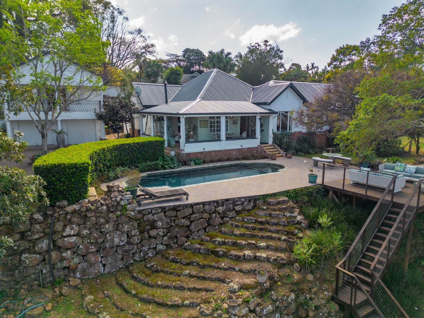 Semi wrap around verandah with views over the garden and sparkling pool. A built in hot tub on the patio, ideal to chill with endless views.