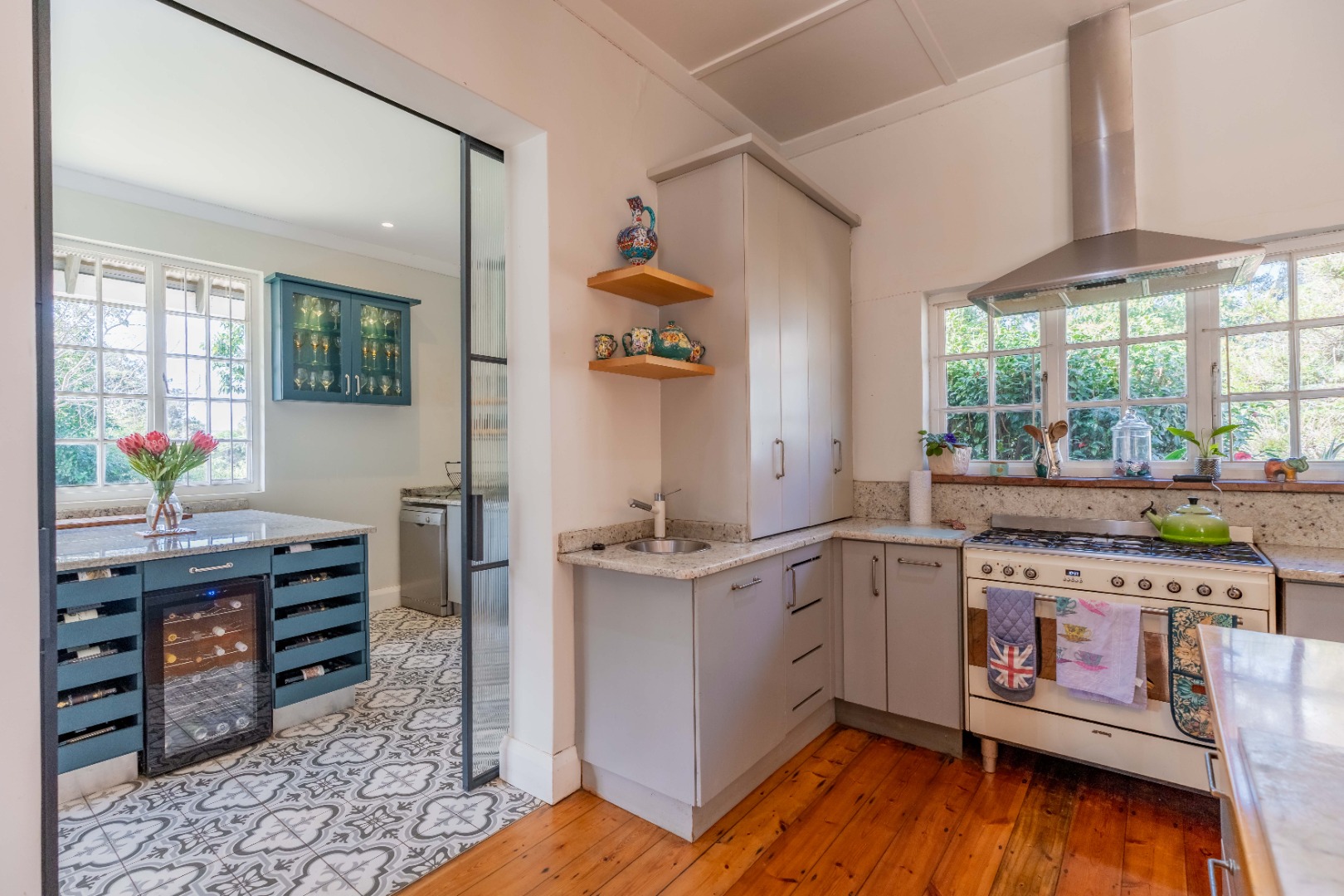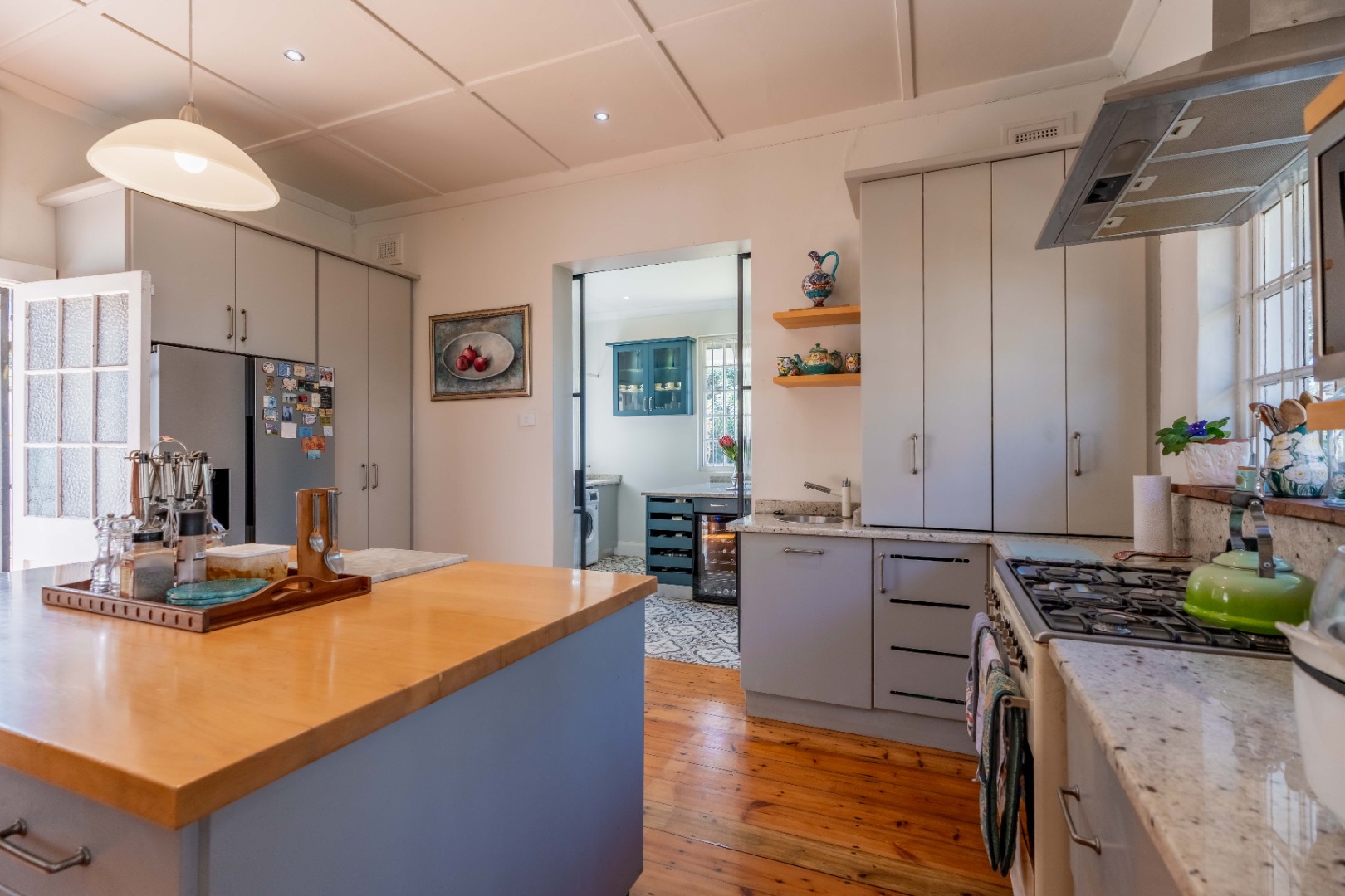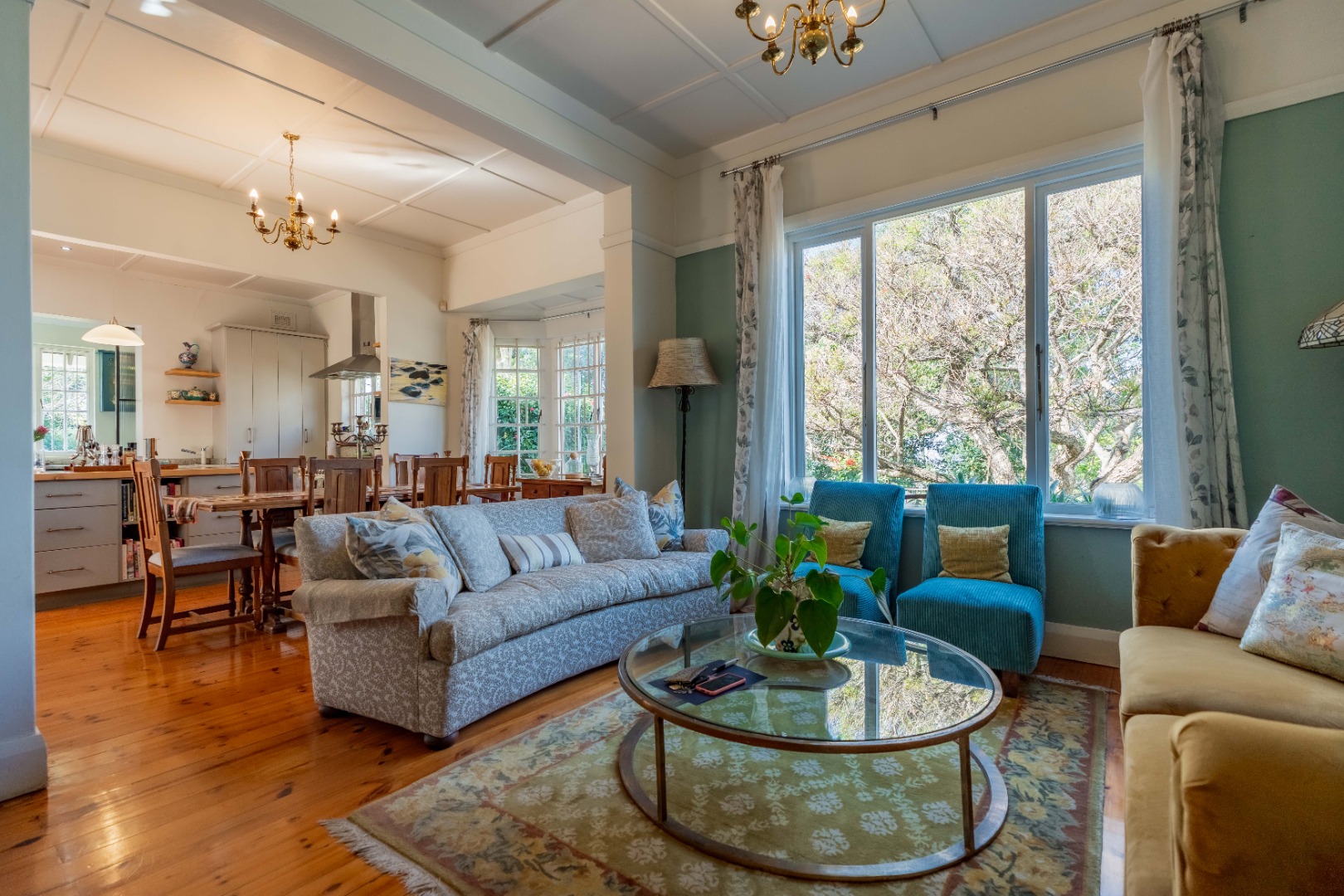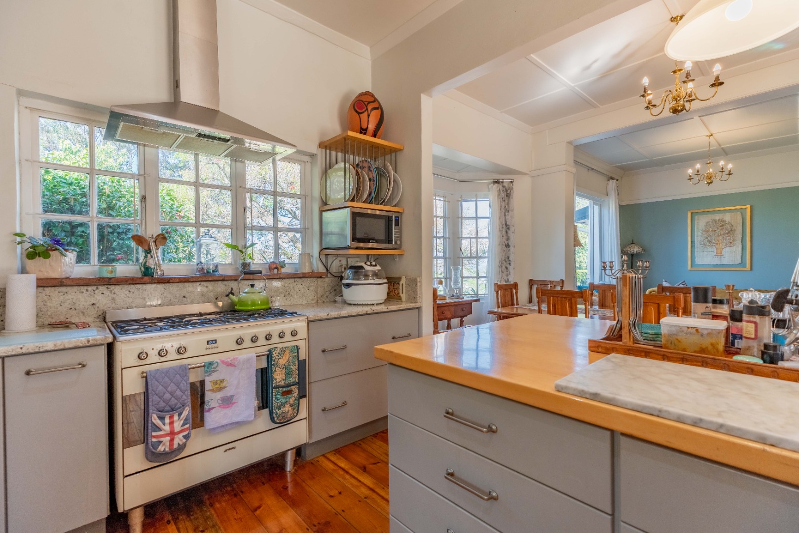 Gorgeous open plan kitchen and large scullery opening to cosy lounge and dining room with fireplace, bay windows and beautiful wooden floors. Lovely entrance hall with 2nd lounge.