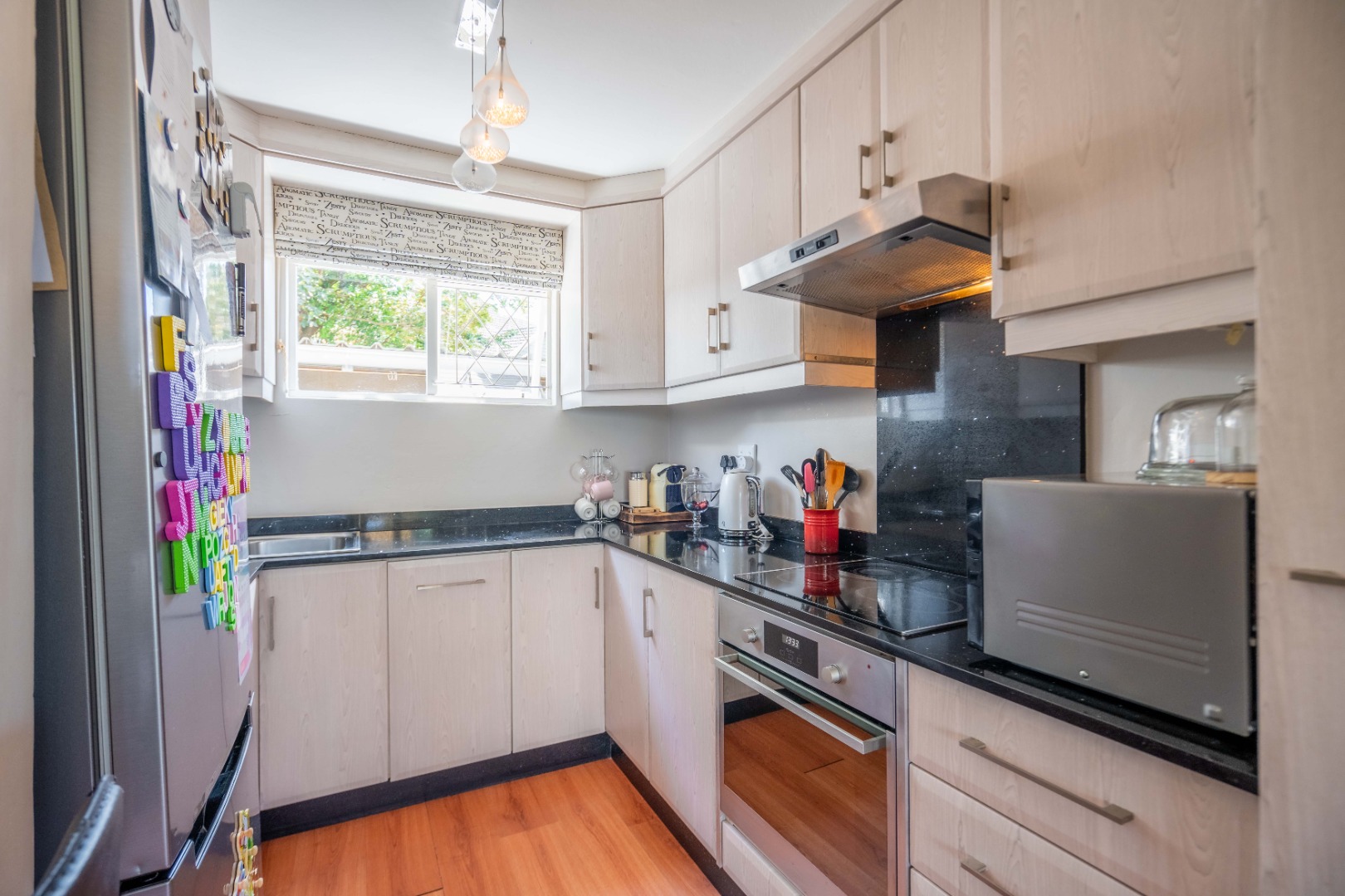 The modern open-plan kitchen is fitted with Caesarstone countertops, an undercounter oven, and an electric stove. Neat cabinetry and a well-thought-out layout make this kitchen perfect for both everyday living and entertaining.