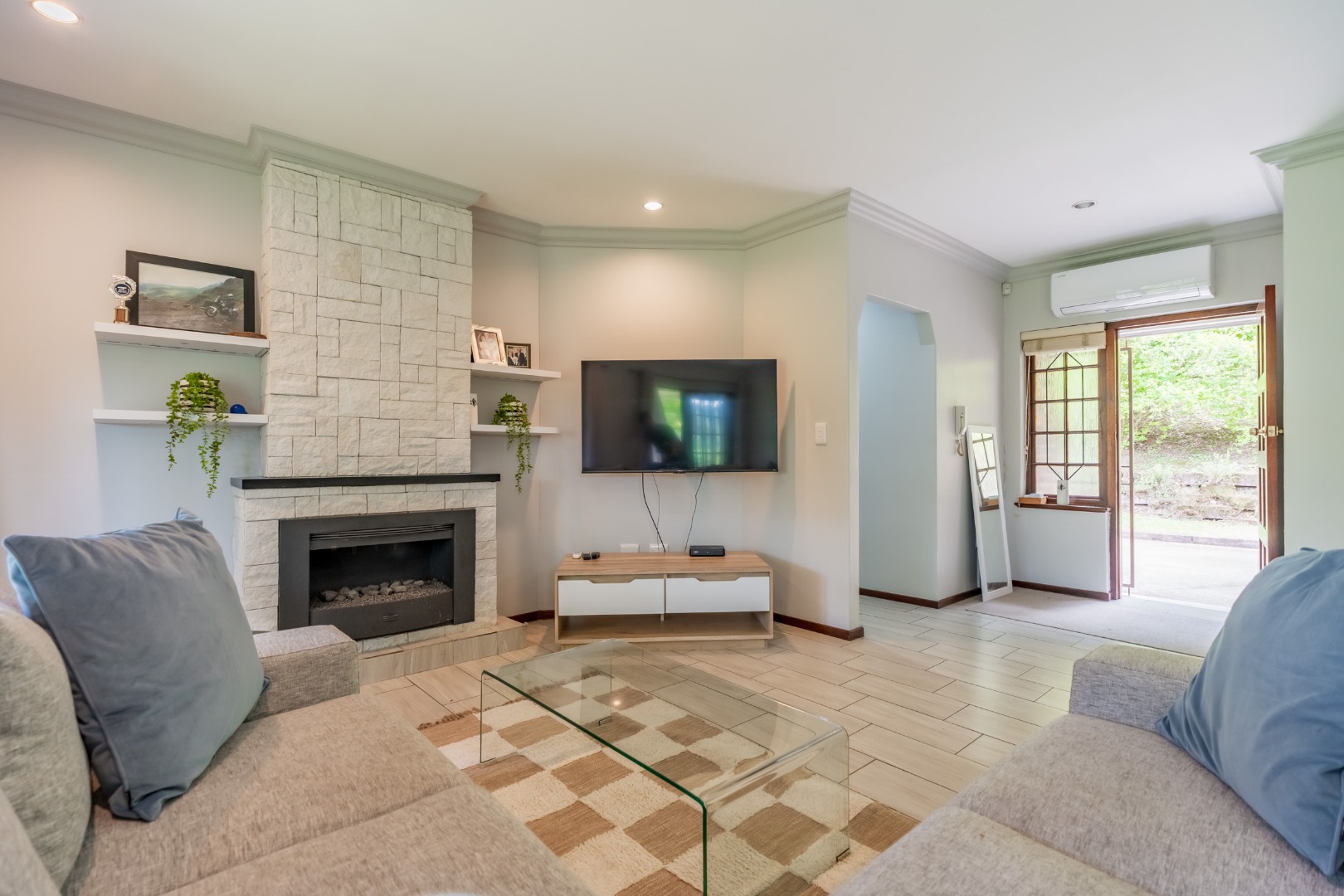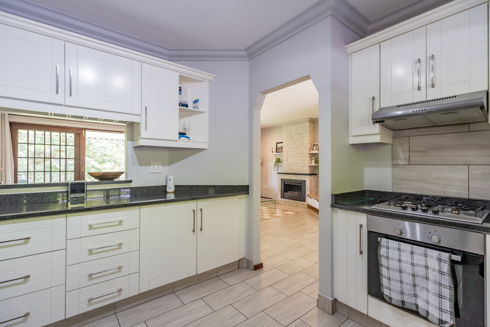 The home features three well-sized bedrooms and two bathrooms, complemented by a light-filled open-plan living area. The granite kitchen is fitted with a gas hob and flows seamlessly into the living space, where a cosy gas fireplace opens onto a covered patio. From here, enjoy tranquil views, abundant birdlife and a manicured, fully fenced garden.