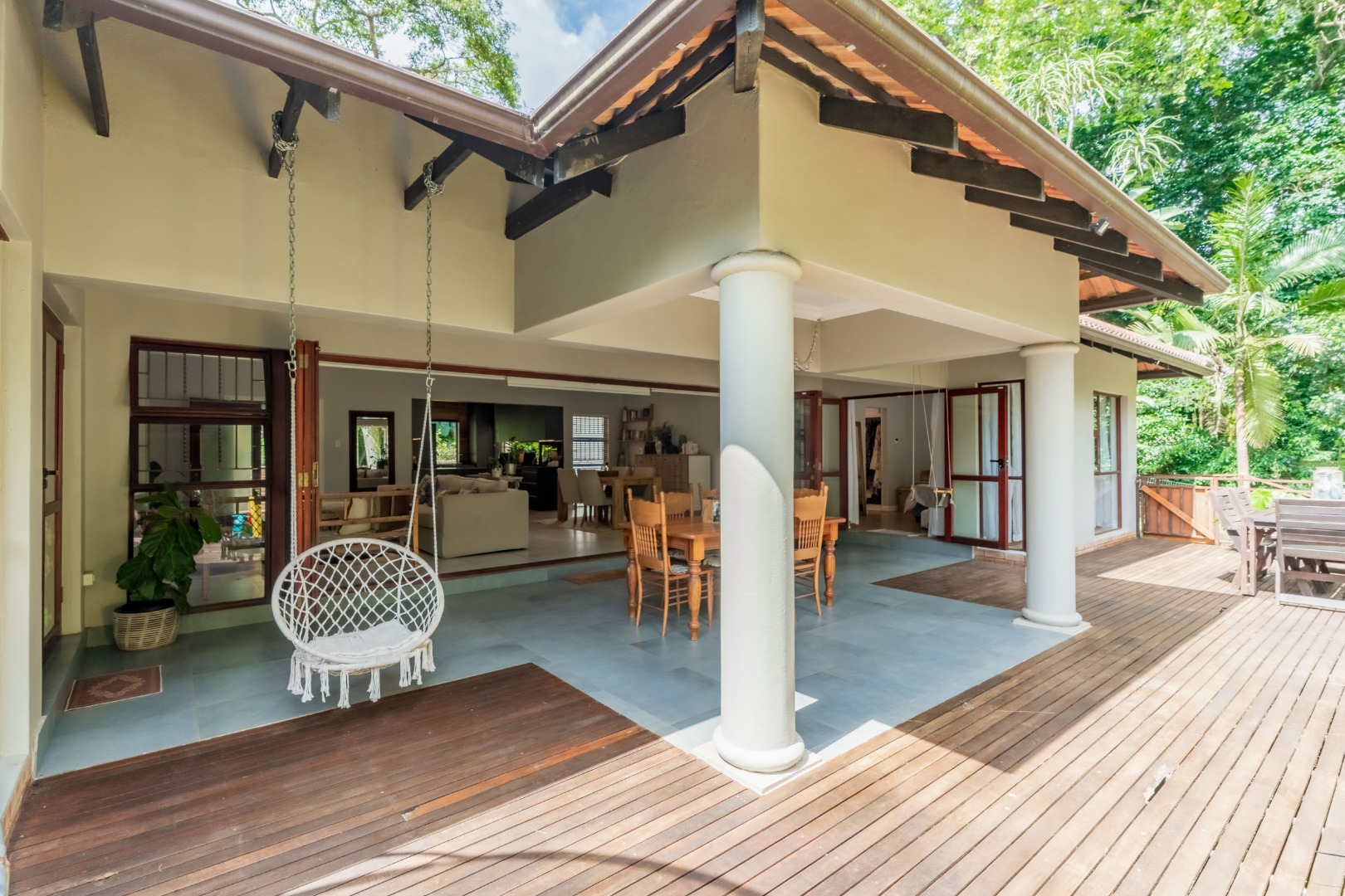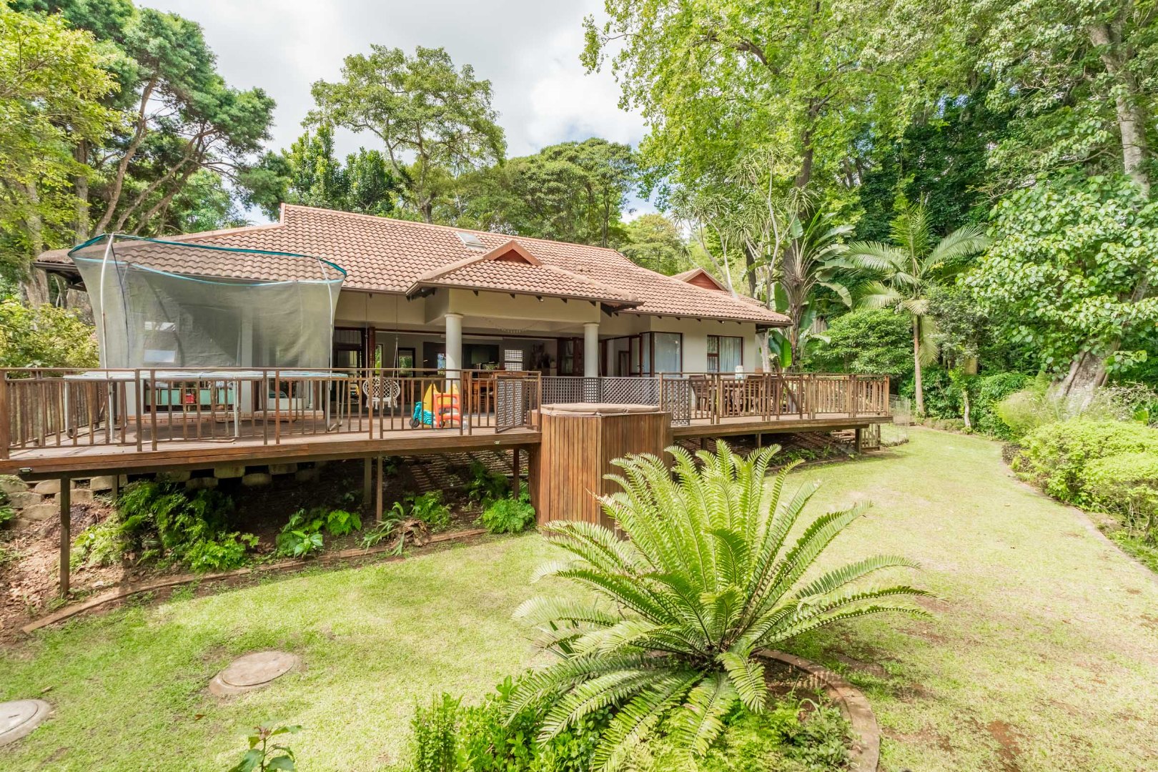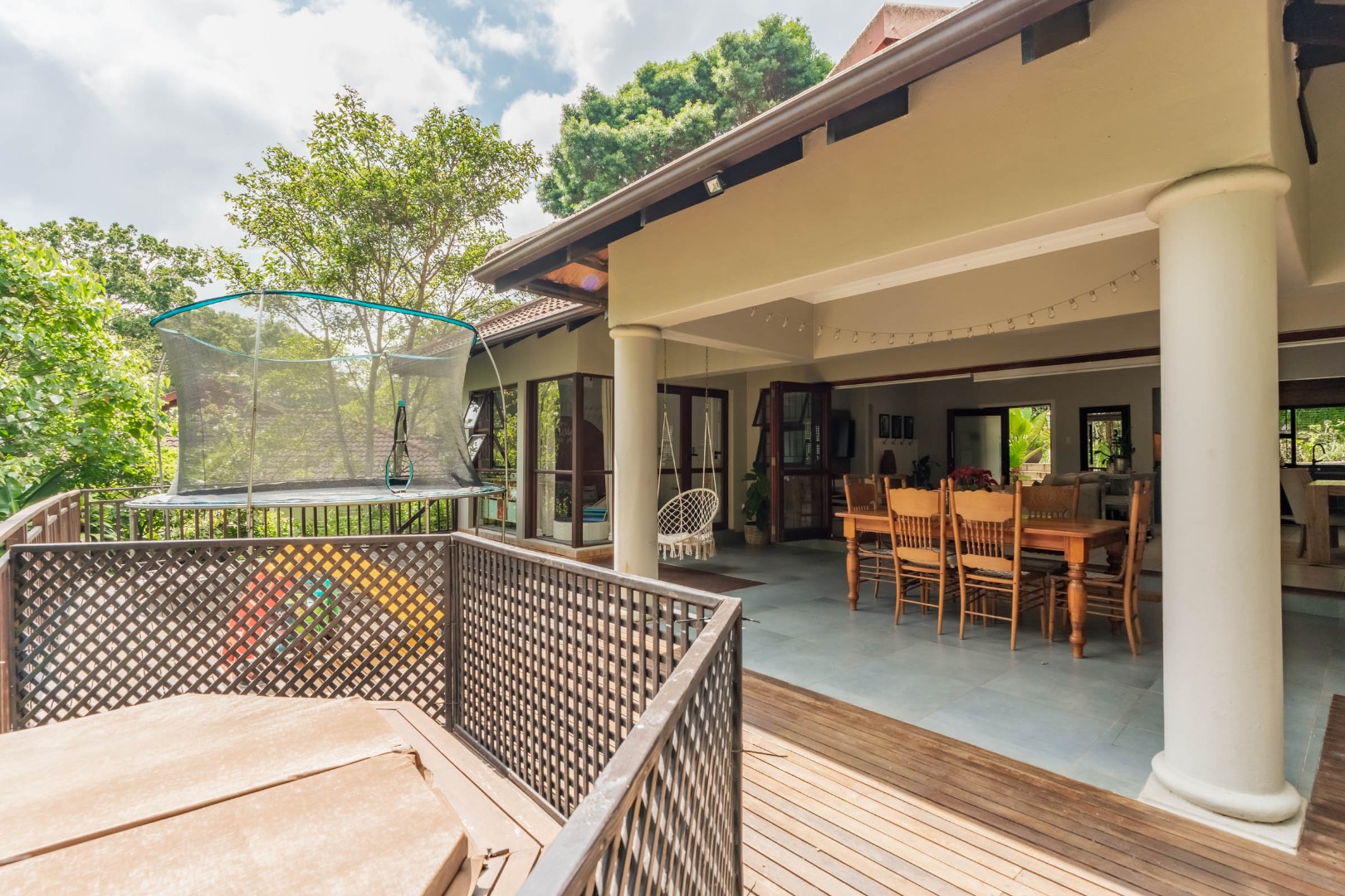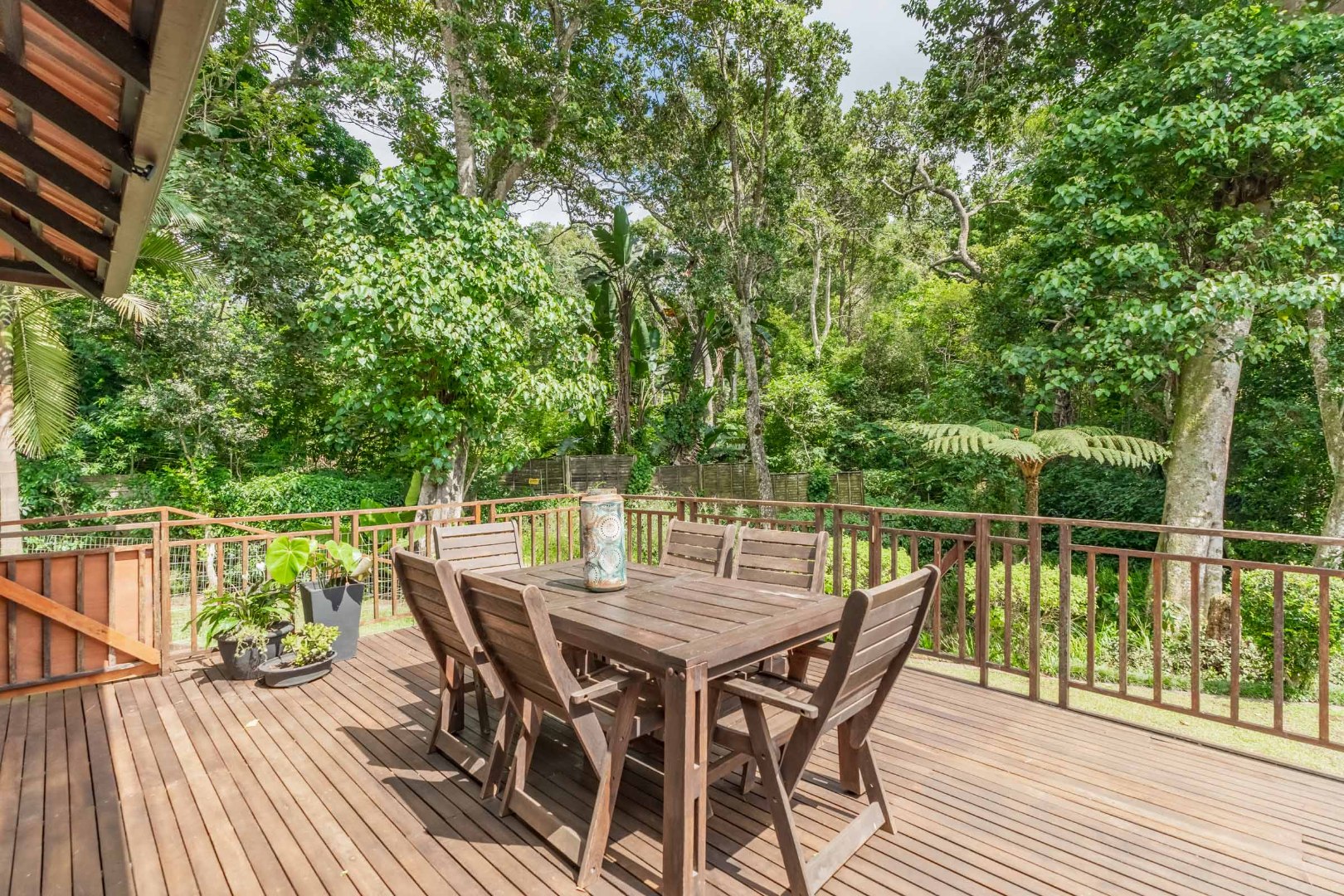 Stack back doors to large undercover patio extending onto a deck with jacuzzi overlooking indigenous stunning established garden with large trees and beautiful bird life.