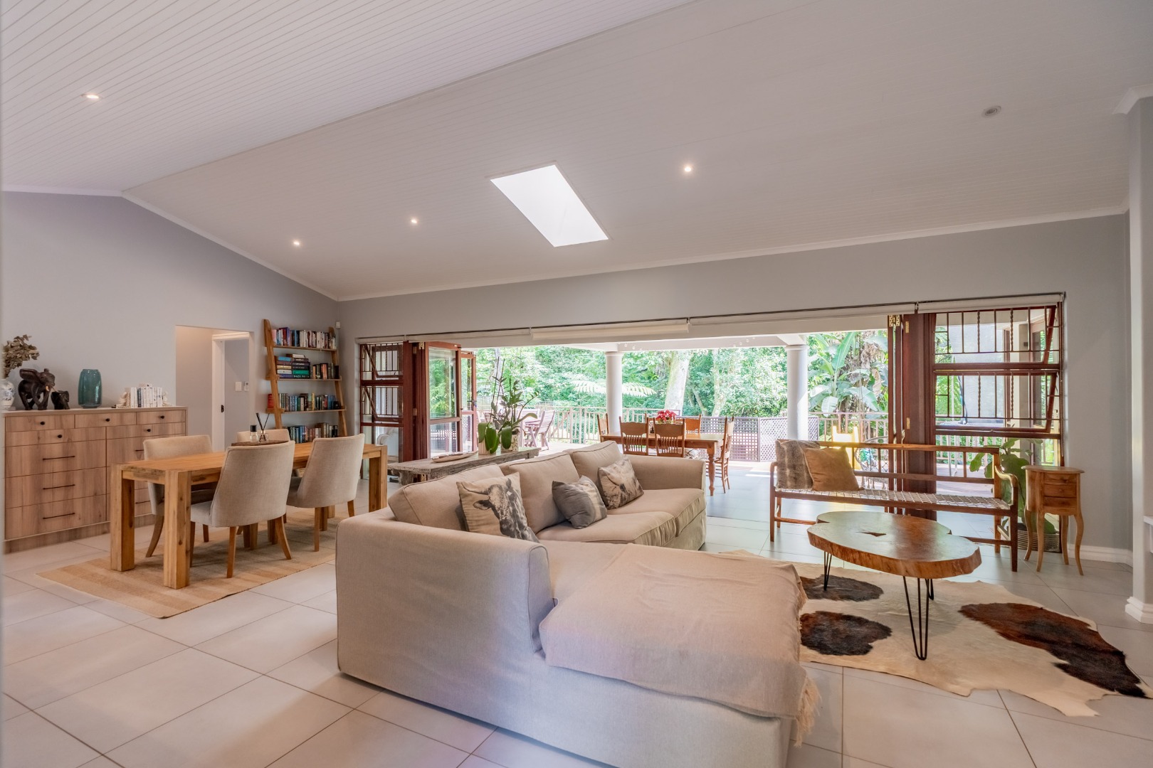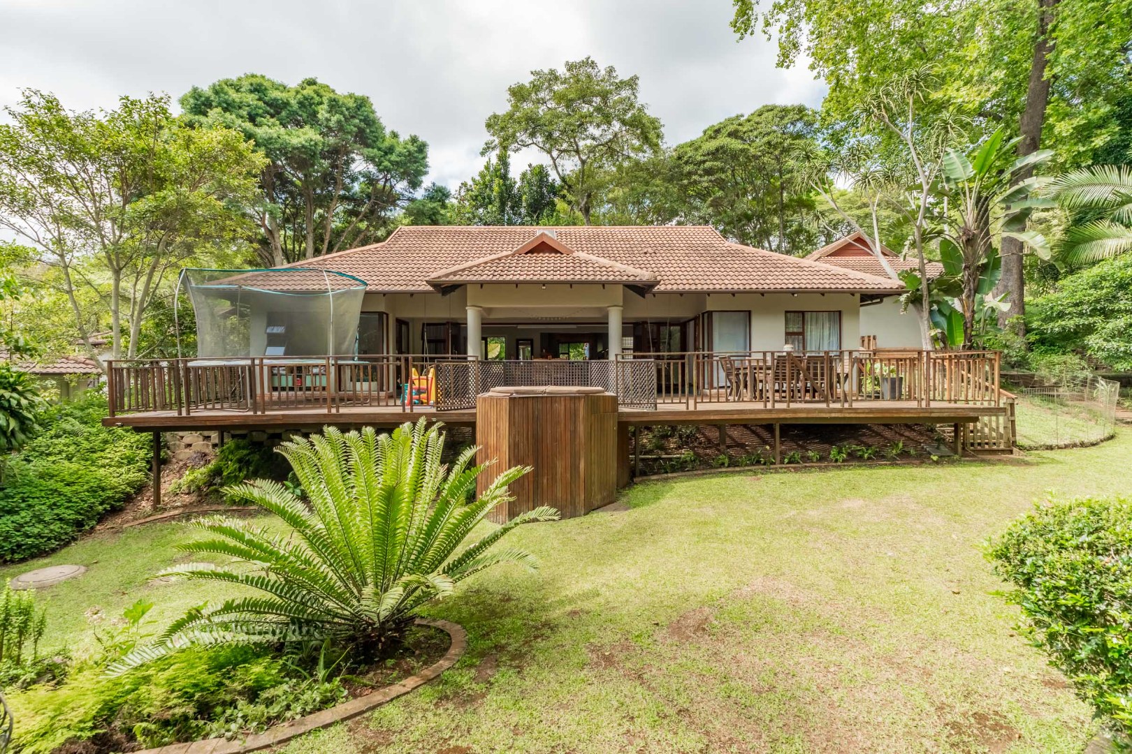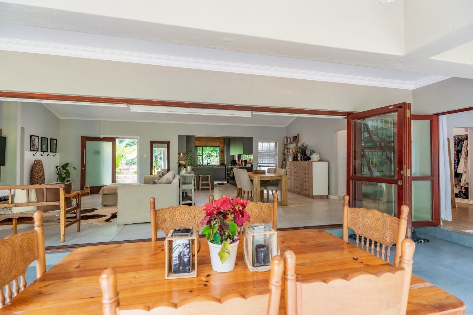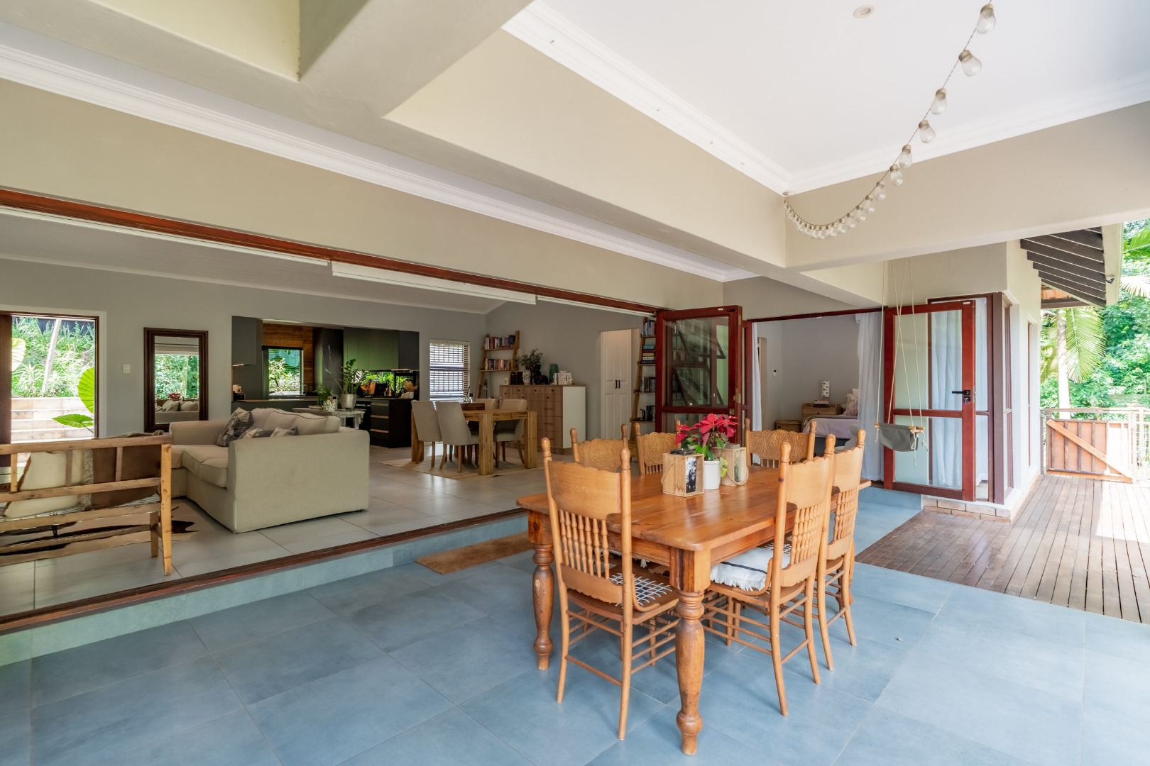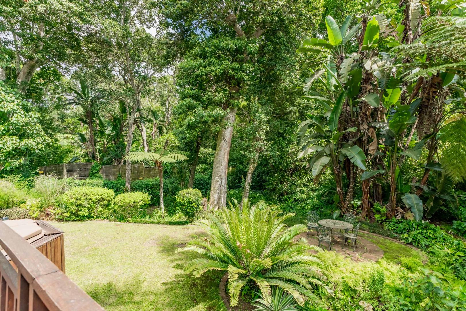 Stack back doors to large undercover patio extending onto a deck with jacuzzi overlooking indigenous stunning established garden with large trees and beautiful bird life.