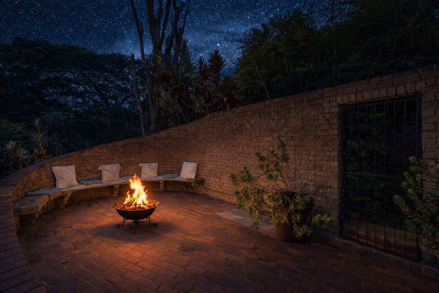 Outdoors, the property truly shines. A beautifully established and secure garden frames a sparkling rock pool complete with a water feature, while the seated firepit area creates a magical setting for evenings under the stars. The covered entertainment area with built-in braai overlooks the pool, making it perfect for relaxed family living or hosting friends year-round.