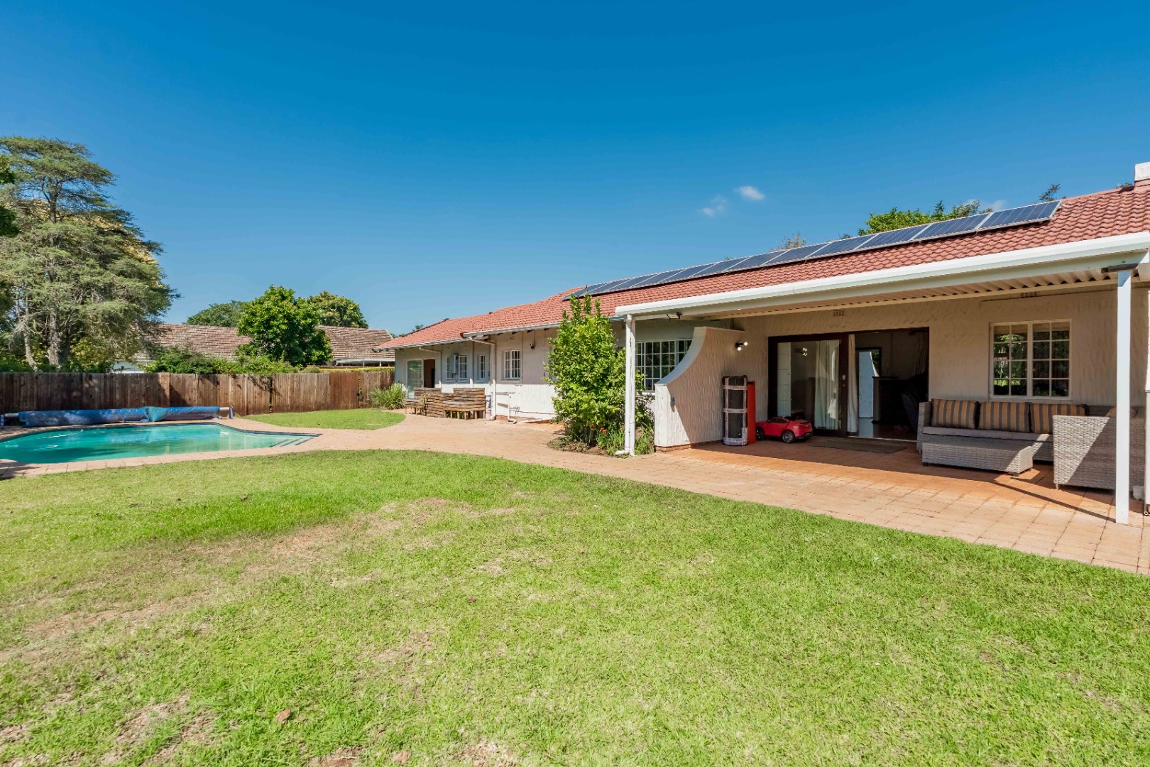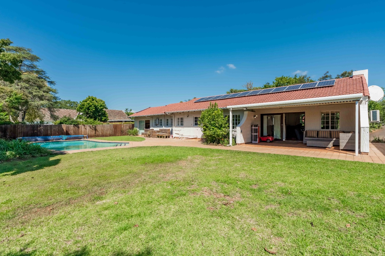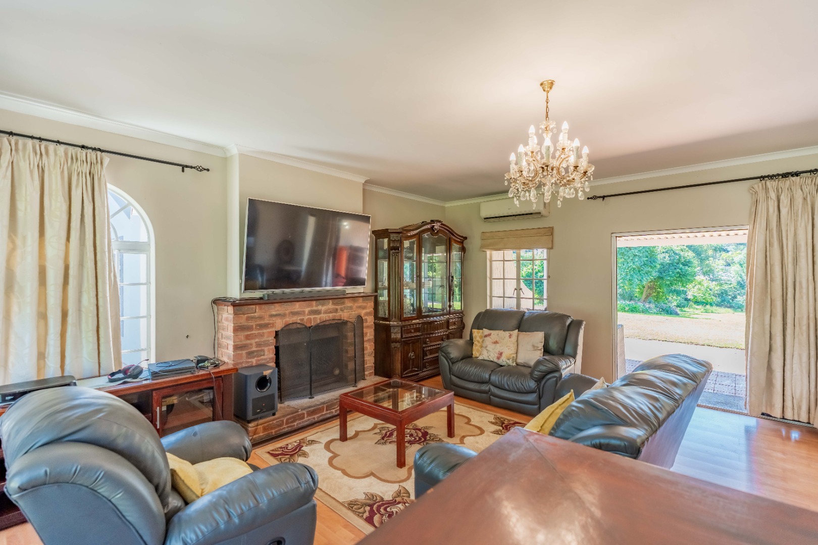As you step inside, you’re welcomed by a spacious lounge featuring a cozy fireplace and built-in bar, perfect for entertaining. The lounge flows effortlessly onto a covered patio overlooking a sparkling pool and a beautifully maintained garden – ideal for relaxed family living.