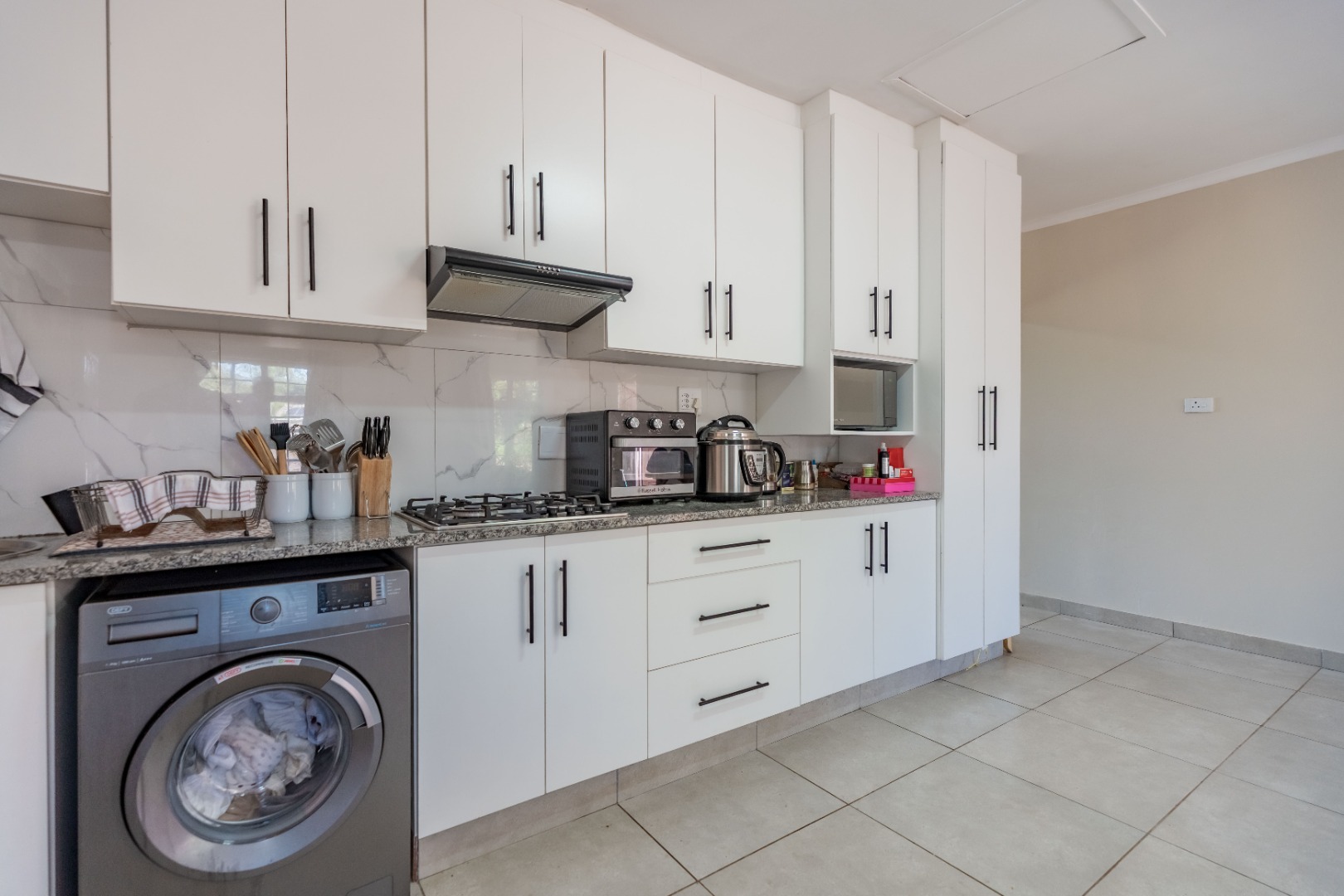 The modern kitchen is fitted with granite countertops, a gas stove, and plumbing for a washing machine, and opens into a bright dining area, creating a warm and functional heart of the home.