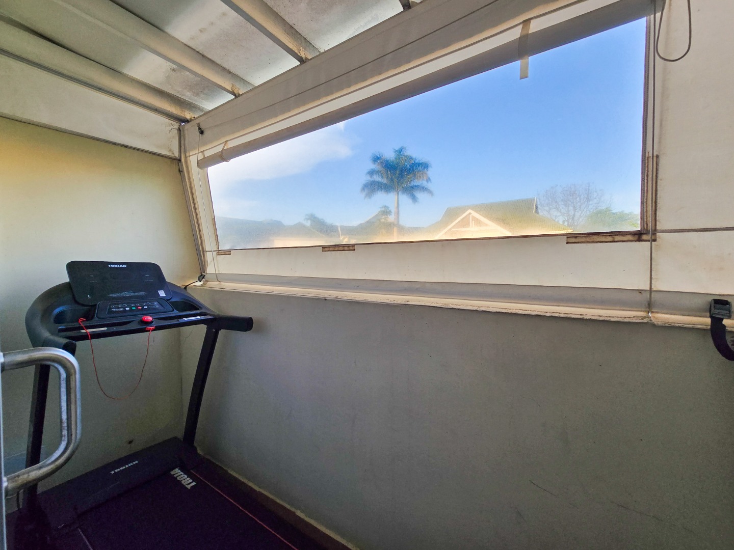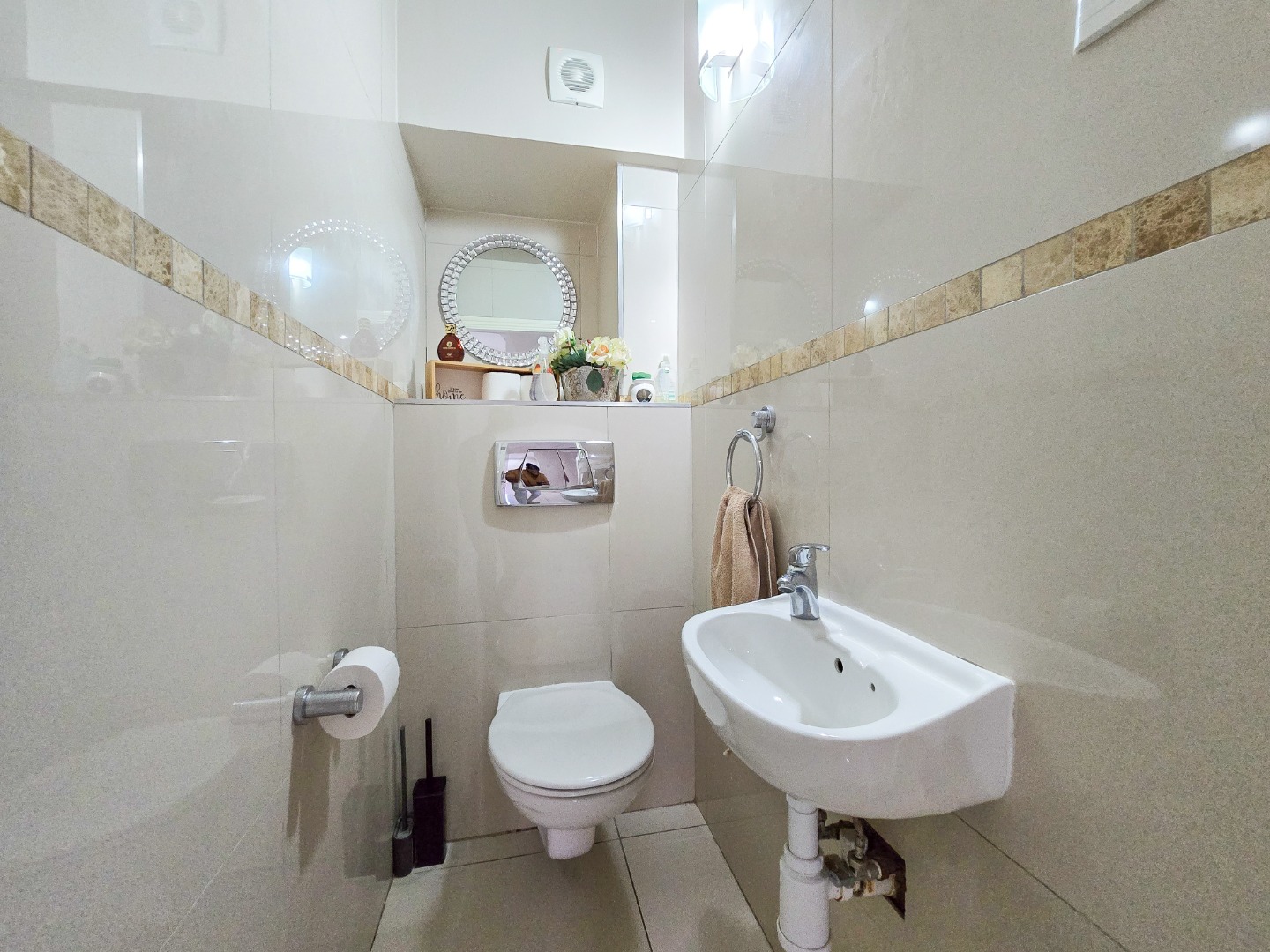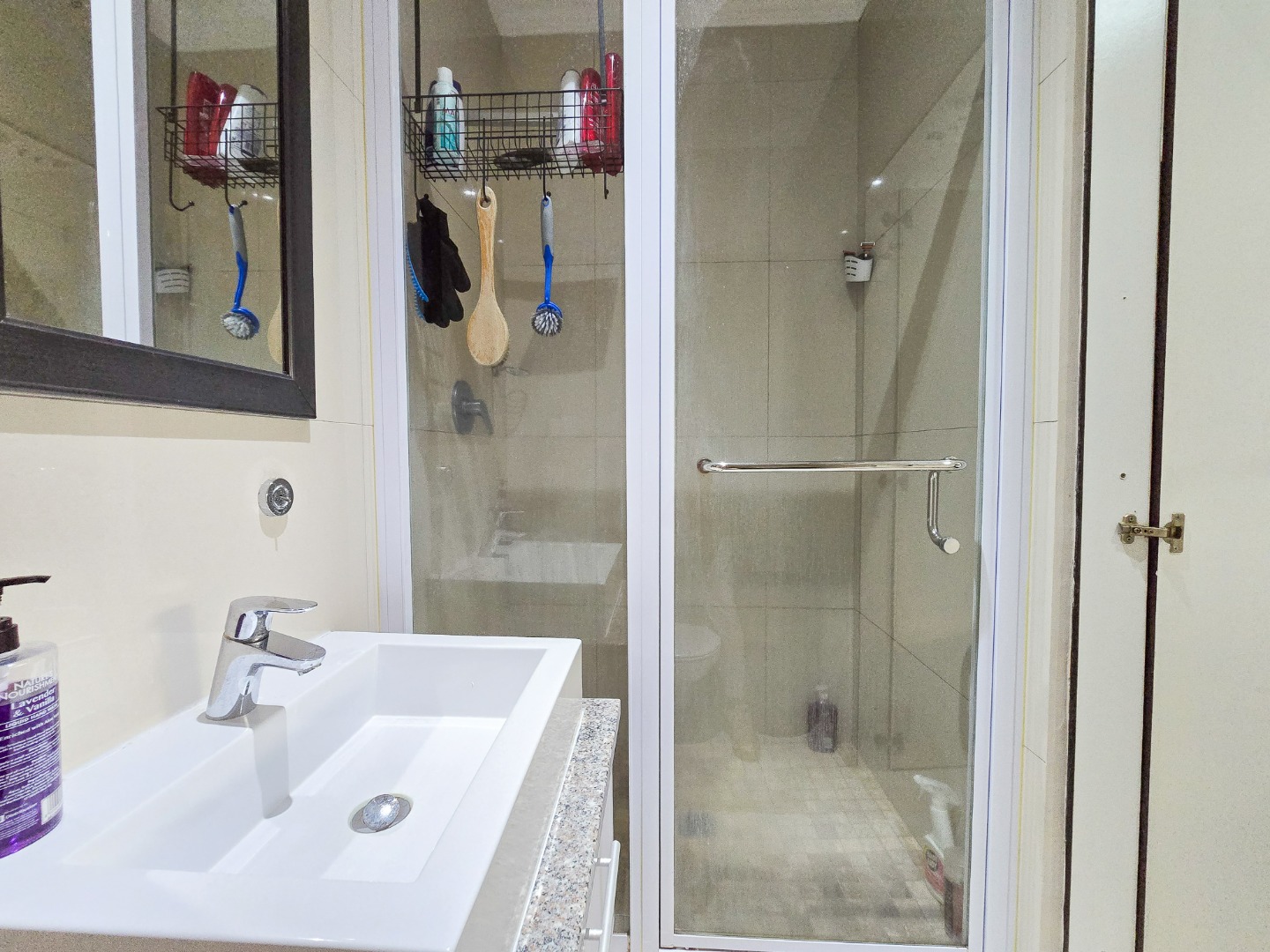 Upstairs, you’ll find three spacious bedrooms, all with built-in cupboards and laminate flooring. The master bedroom boasts a private en-suite bathroom with shower, toilet, and basin, as well as a balcony fitted with additional cupboards and a retractable canvas screen for added comfort on windy days. A full family bathroom with a shower, bathtub, and basin services the additional bedrooms.