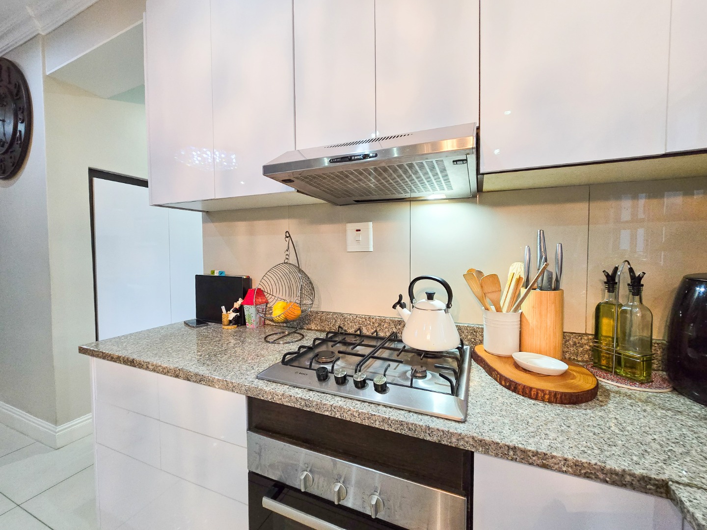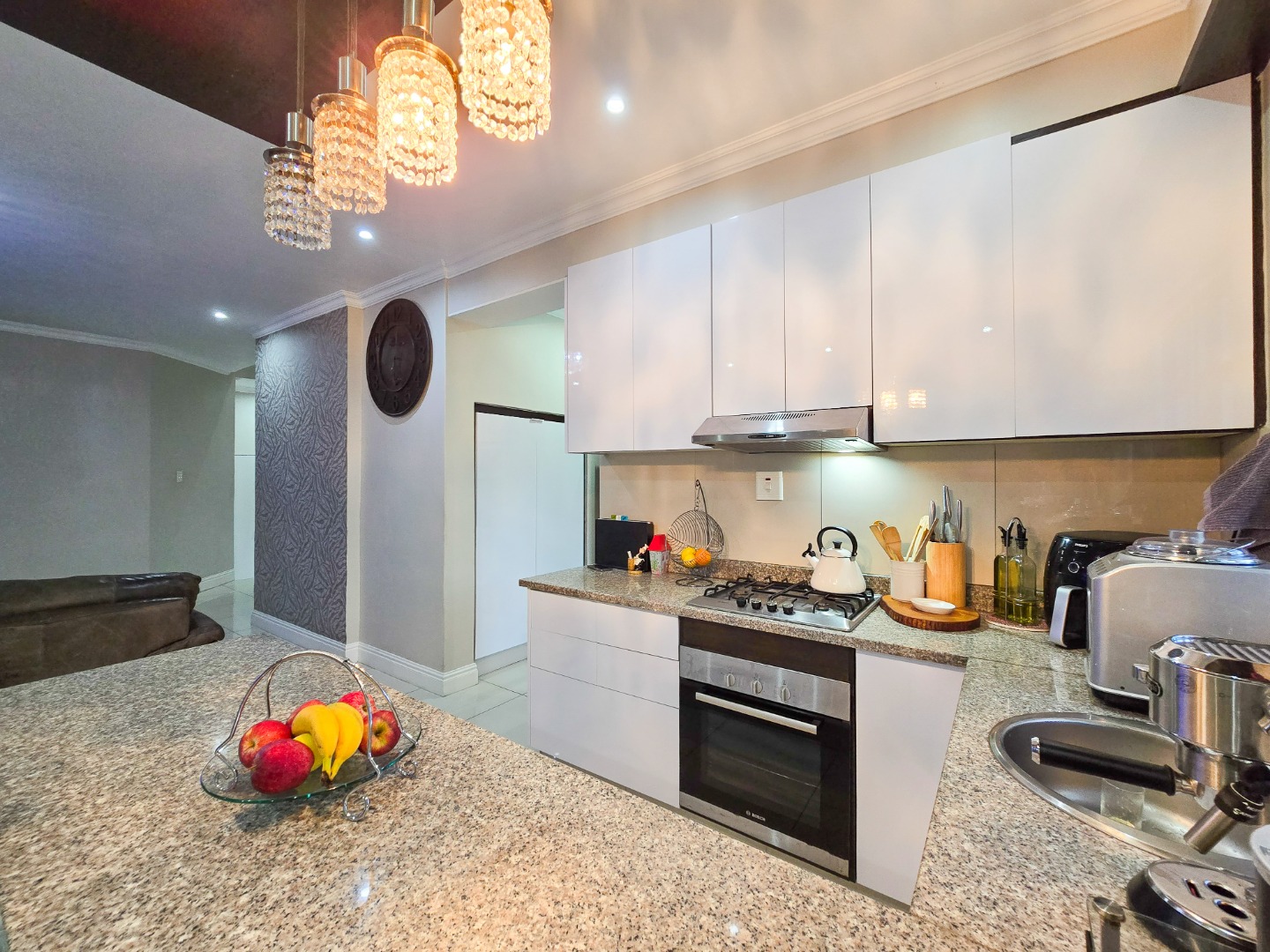 Step inside and be captivated by the elegant and spacious layout. The ground floor features a bright and airy lounge with tiled flooring, seamlessly flowing into a modern, open-plan kitchen and dining area. The kitchen is fully fitted with high-gloss built-in cupboards, granite countertops, a gas hob, electric oven, and a separate scullery with space for a double-door fridge and plumbing for both a dishwasher and washing machine.