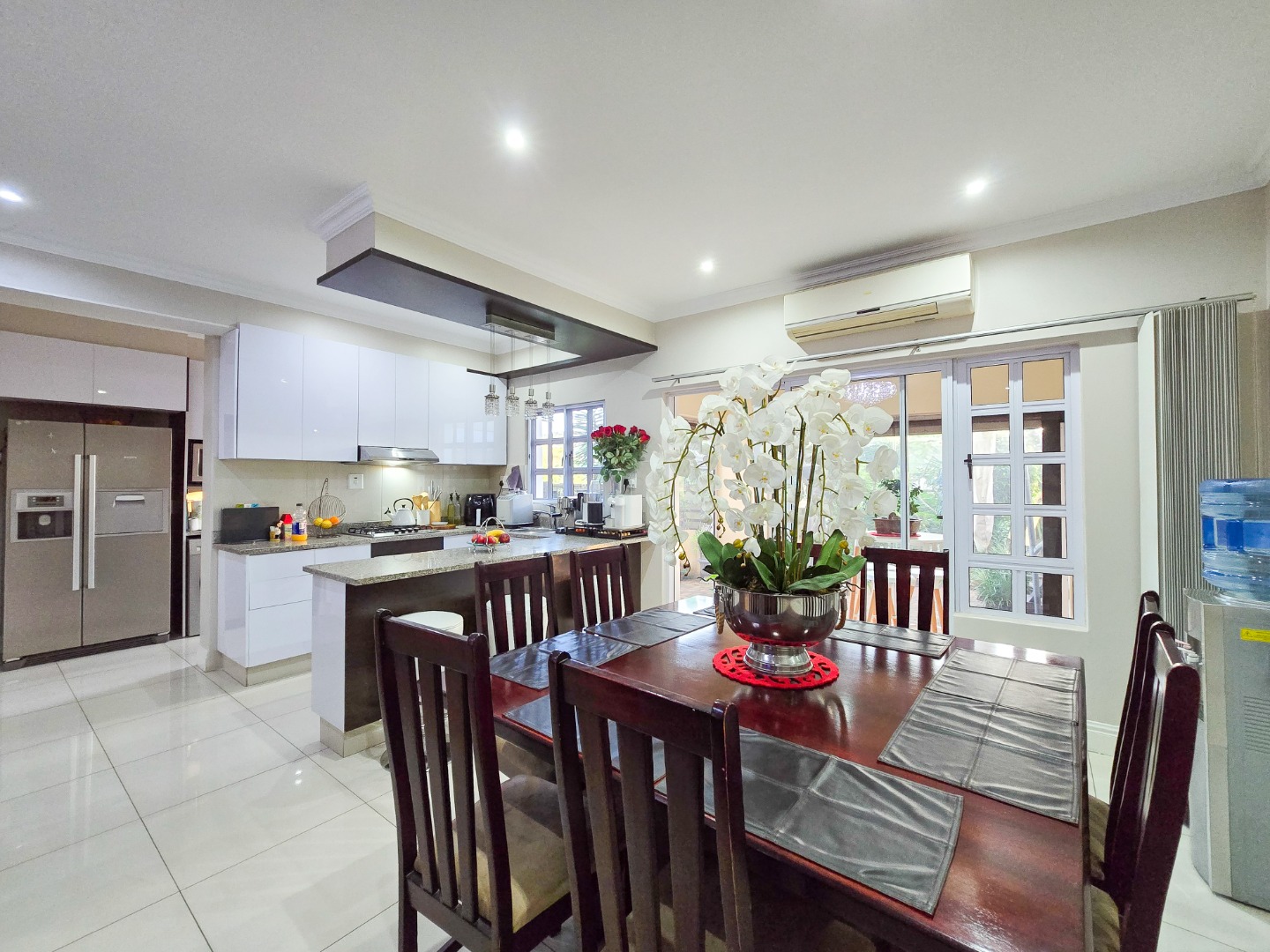 The dining area opens onto a semi-covered patio, perfect for alfresco dining or relaxing while enjoying the beautiful paved garden surrounded by lush greenery—a serene retreat to unwind and watch the sunset. A guest loo is conveniently located downstairs for visitors.