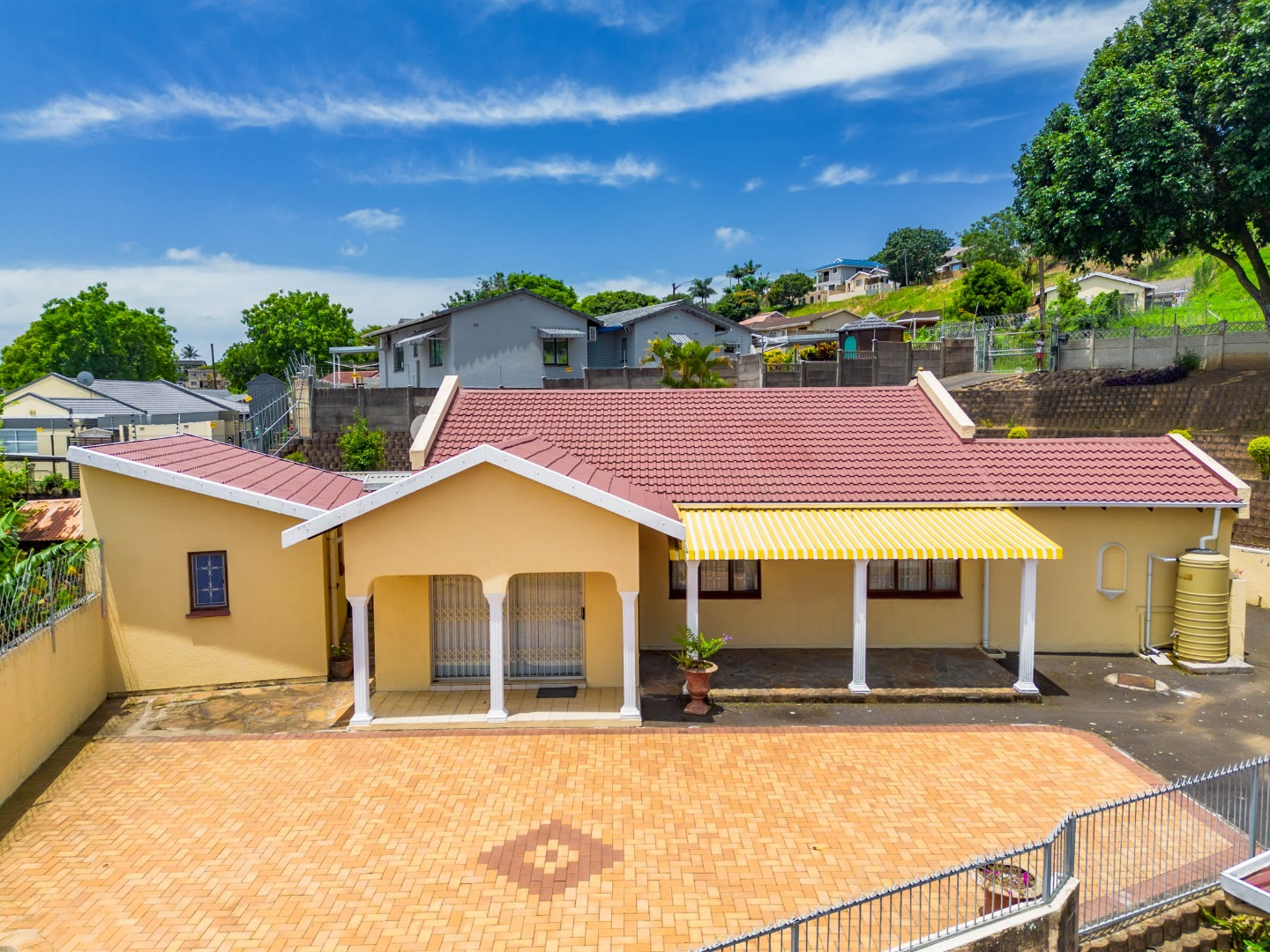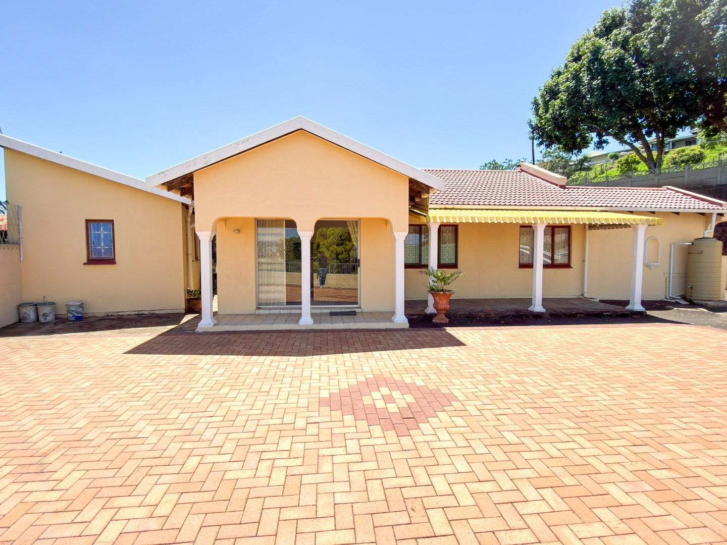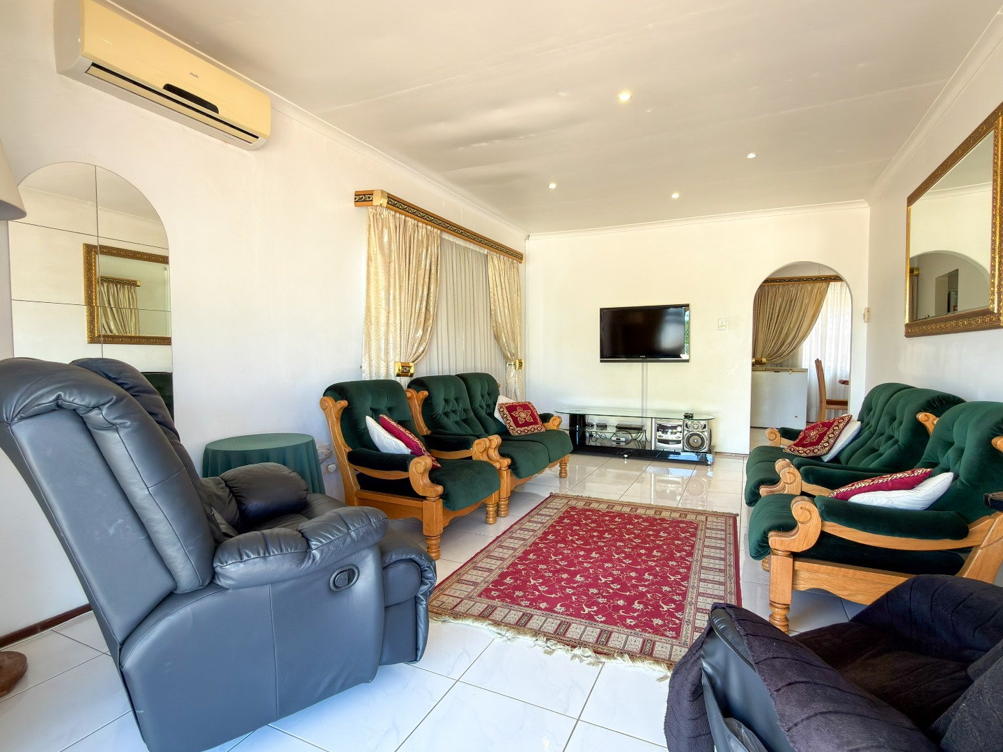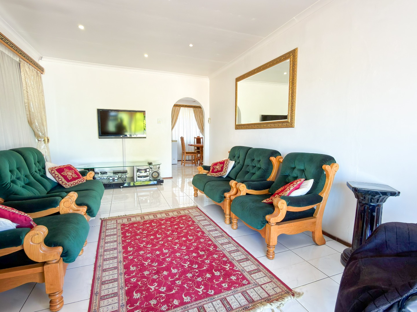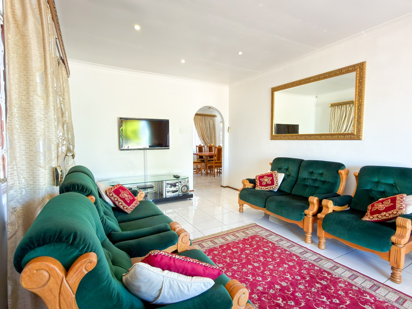 A long driveway leads directly to the garage and parking area, positioned close to the home—making unloading groceries quick and effortless, with easy access straight to the kitchen. Inside, you are greeted by a generous dining area that flows seamlessly into the well-appointed kitchen and bright, airy lounge. The lounge is filled with natural light and opens onto a spacious entertainment area, perfect for hosting family gatherings and social occasions. A semi-covered patio adds to the outdoor appeal, providing a relaxed space to unwind or entertain.