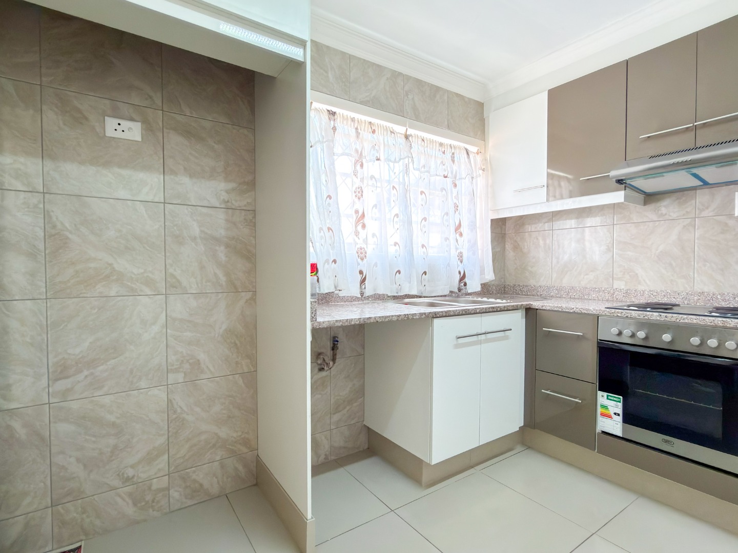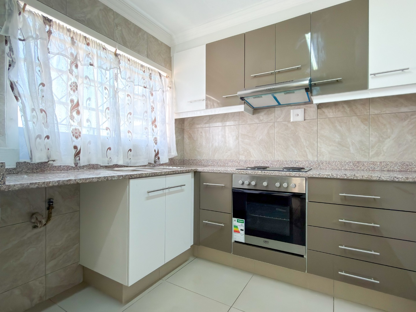 Downstairs offers two bedrooms and one bathroom, with the entire area fully tiled. The kitchen is fitted with built-in cupboards, a hob, oven, and stove.
