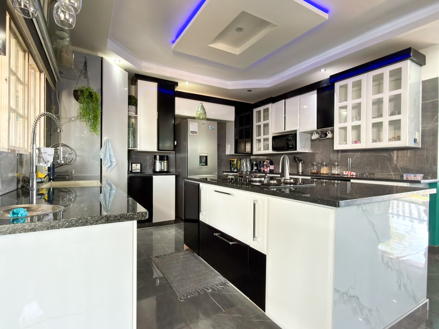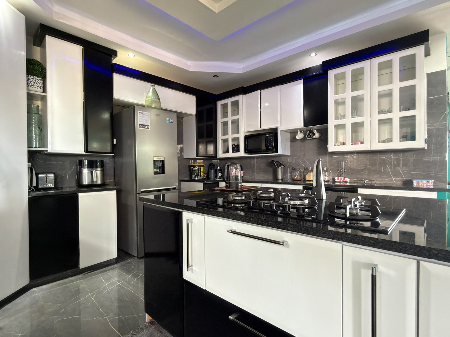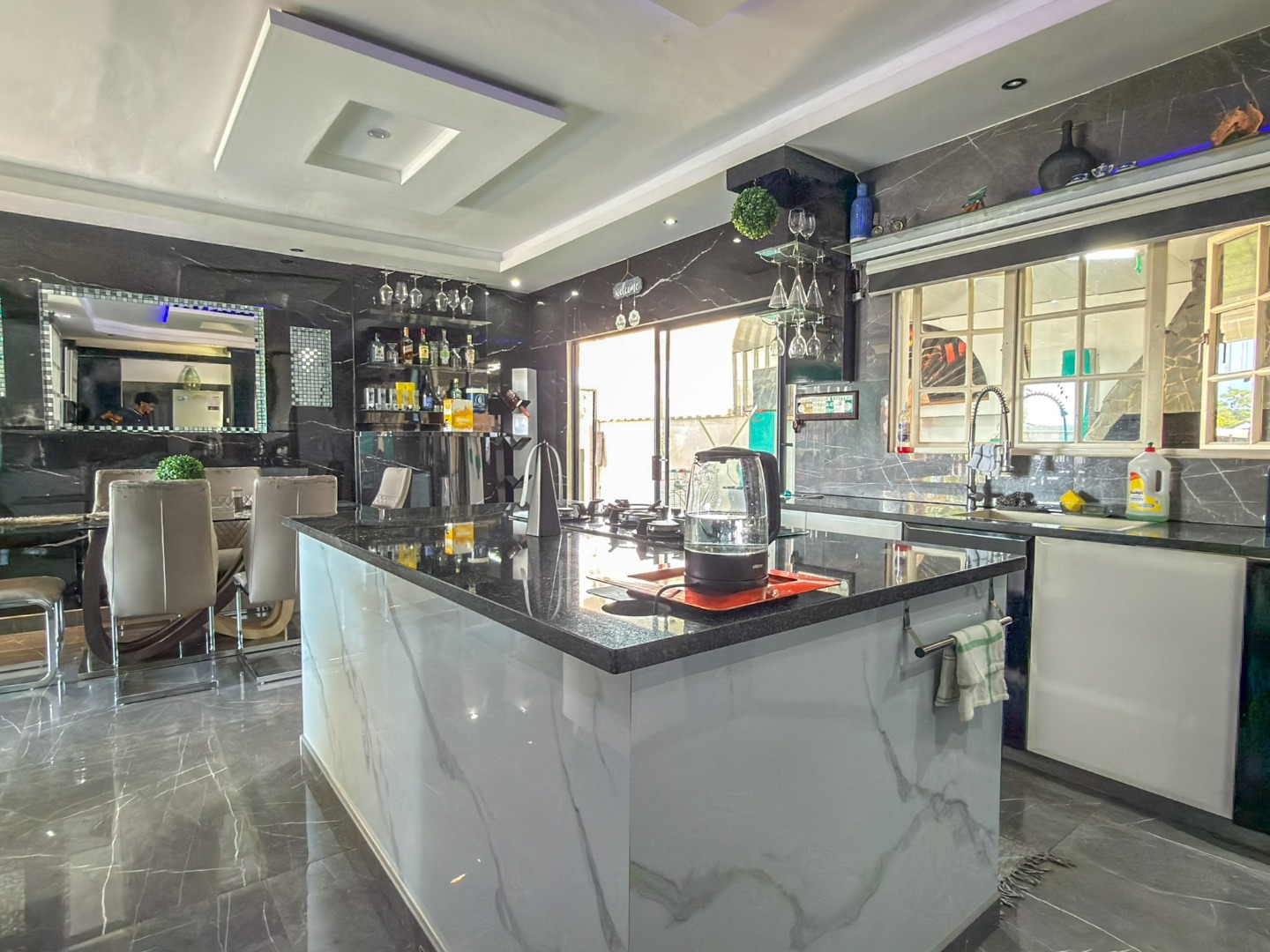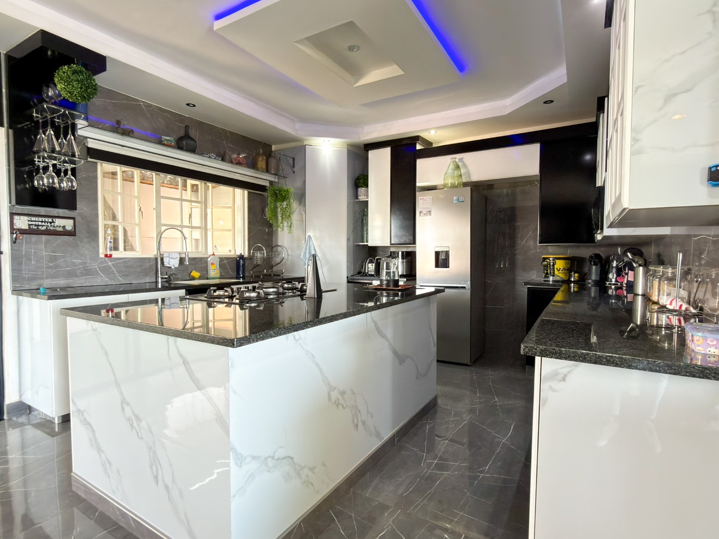 The large, modern kitchen is in pristine condition and serves as the heart of the home. It features striking LED strip lighting and downlights, a centre island, high-gloss built-in cupboards, granite countertops, a gas hob, and space for a double-door fridge. The open-plan design seamlessly connects the kitchen, lounge, and dining area, making family interaction and entertaining effortless.