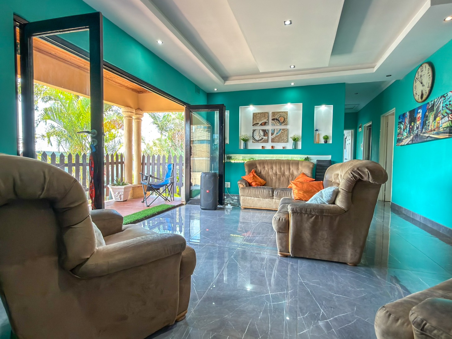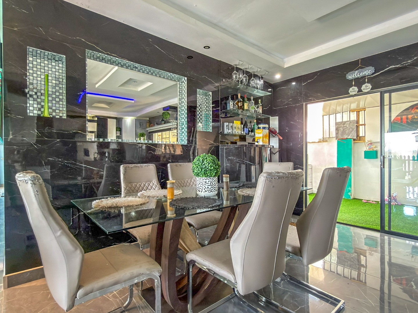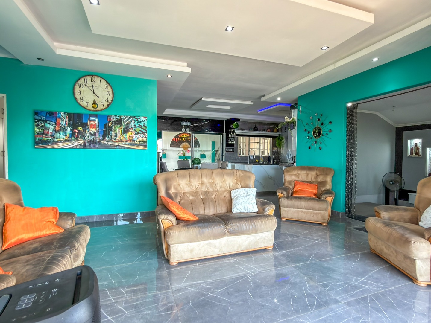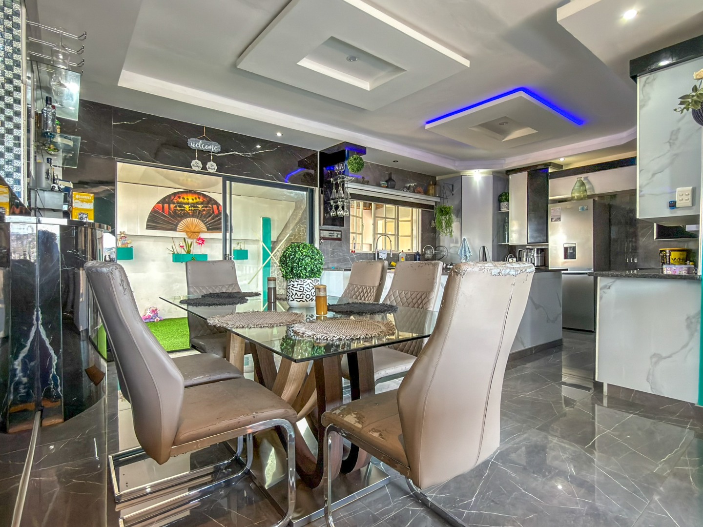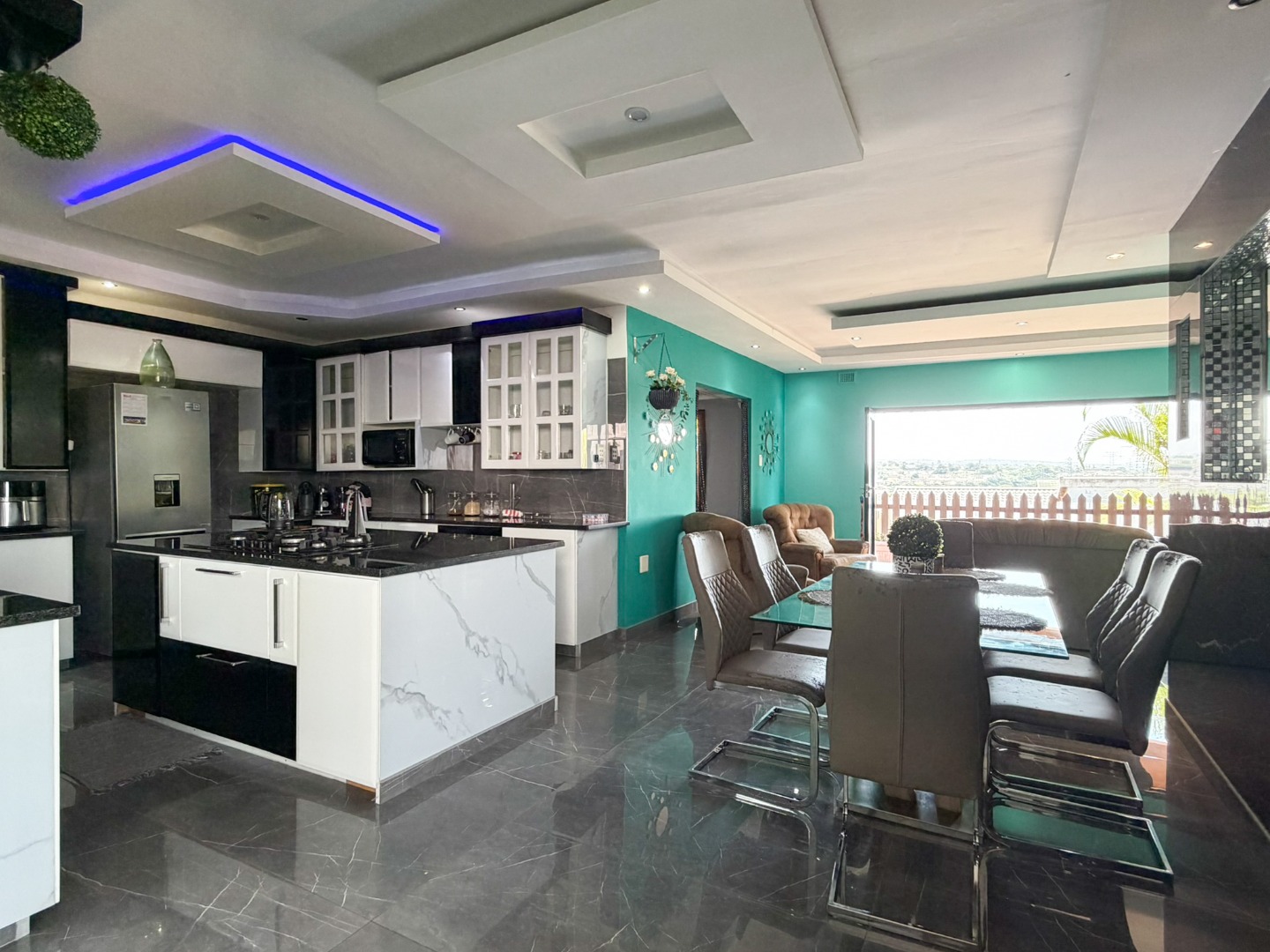 The large, modern kitchen is in pristine condition and serves as the heart of the home. It features striking LED strip lighting and downlights, a centre island, high-gloss built-in cupboards, granite countertops, a gas hob, and space for a double-door fridge. The open-plan design seamlessly connects the kitchen, lounge, and dining area, making family interaction and entertaining effortless.