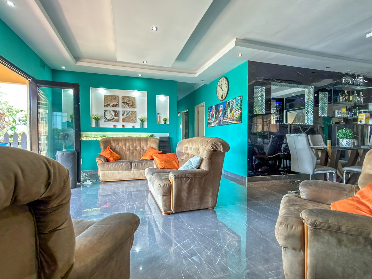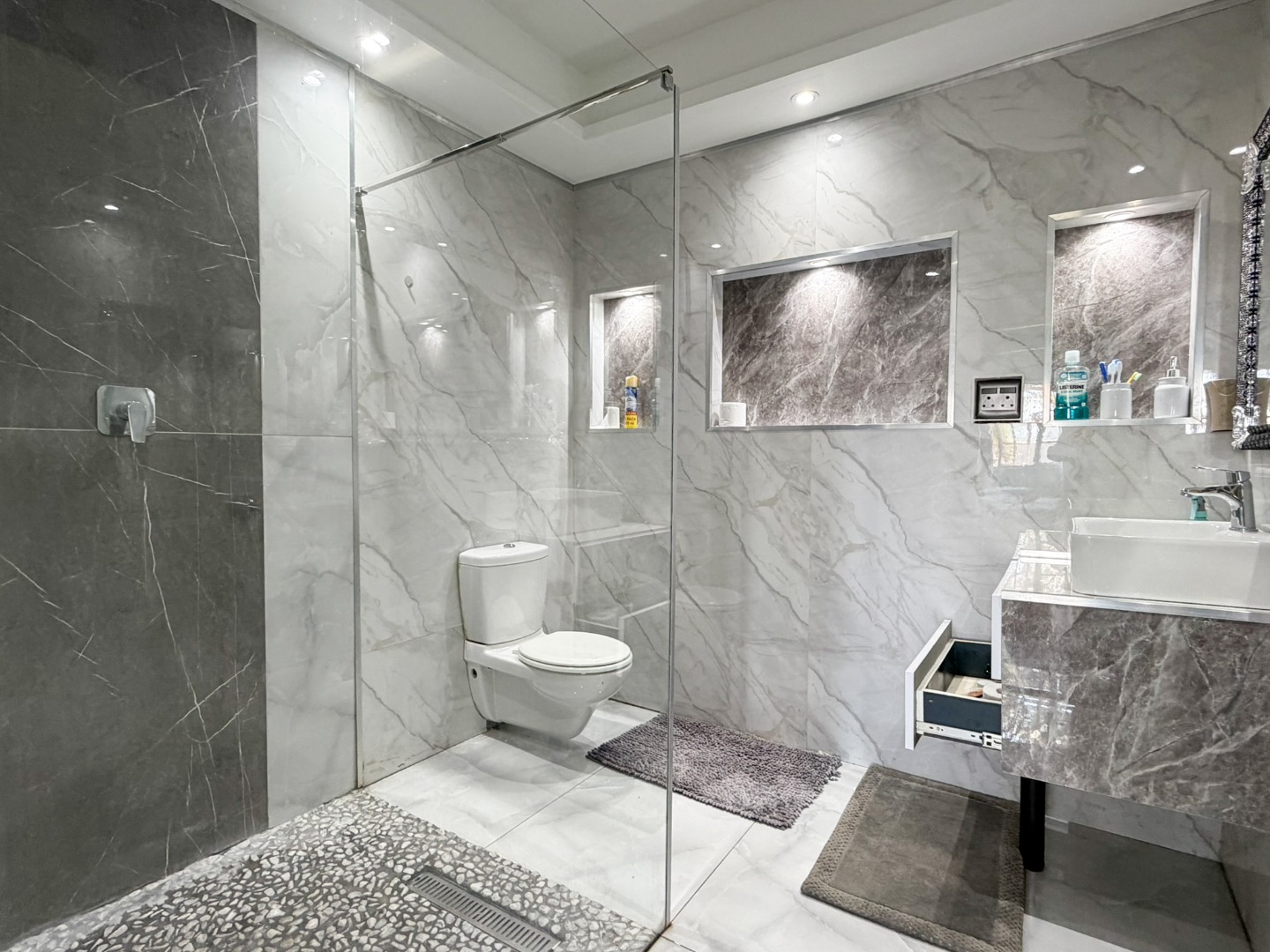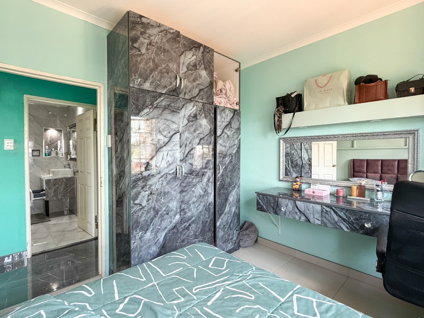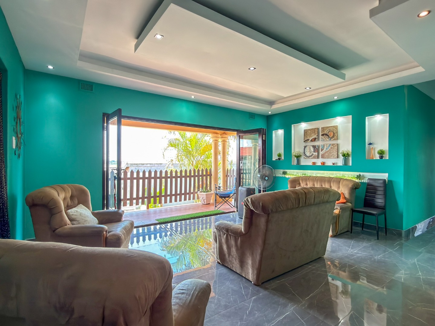 The large, modern kitchen is in pristine condition and serves as the heart of the home. It features striking LED strip lighting and downlights, a centre island, high-gloss built-in cupboards, granite countertops, a gas hob, and space for a double-door fridge. The open-plan design seamlessly connects the kitchen, lounge, and dining area, making family interaction and entertaining effortless.