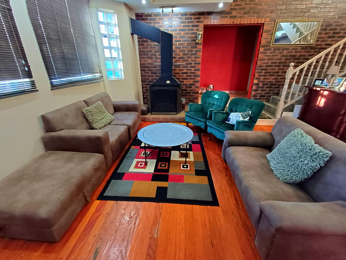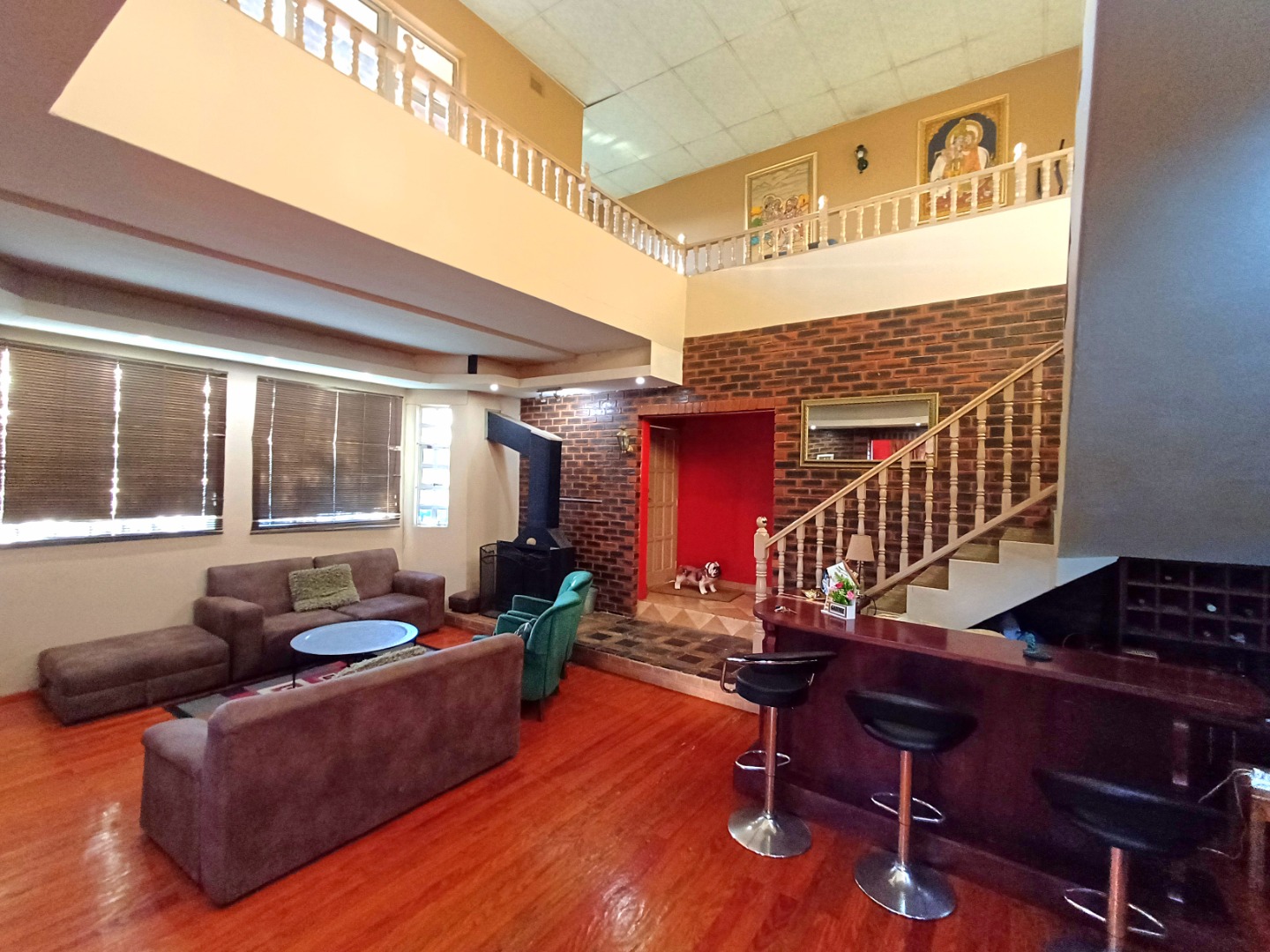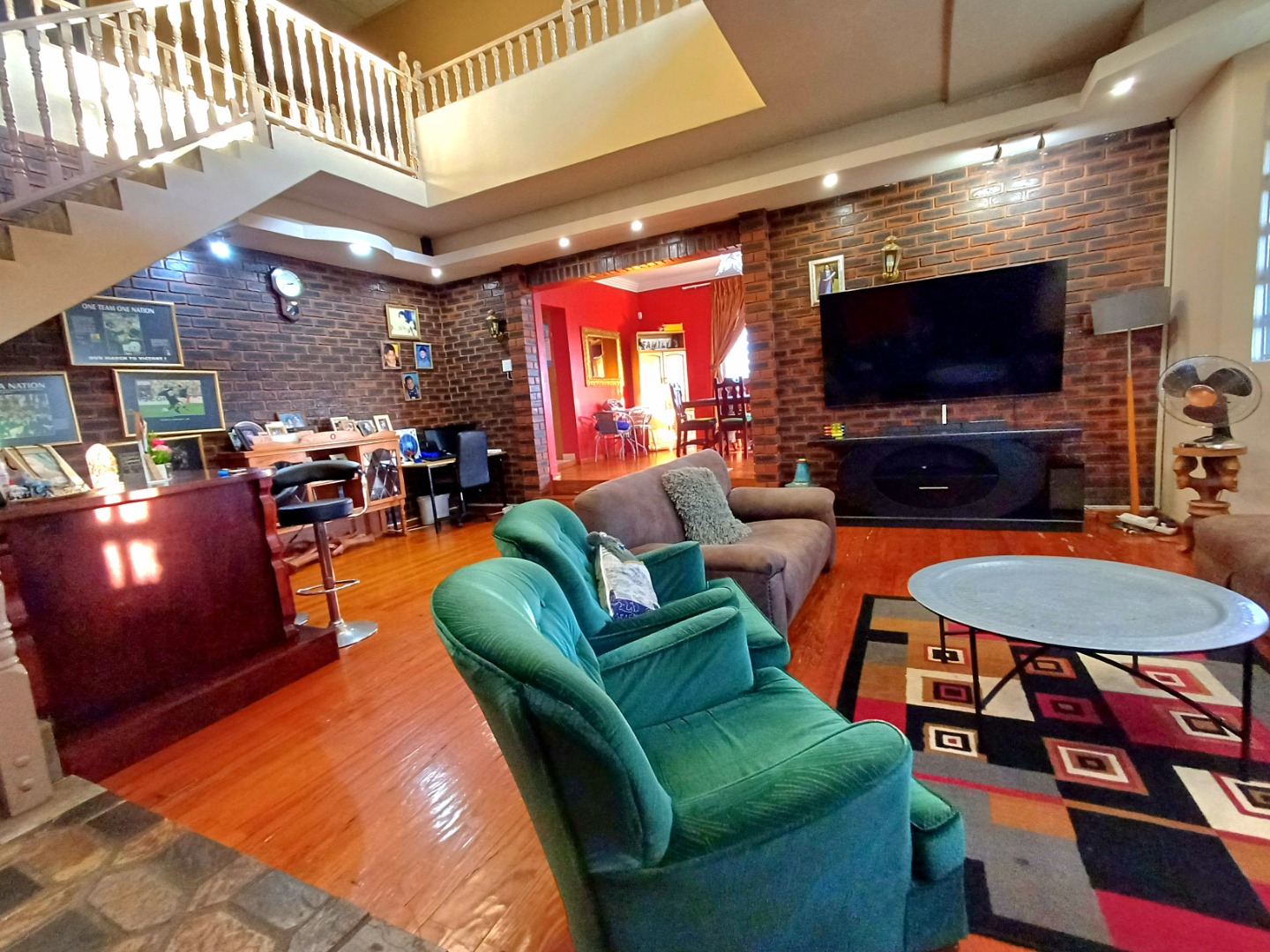 Step into a beautifully designed dining room that seamlessly connects to a gourmet kitchen, complete with custom lighting and a separate scullery—perfect for entertaining and everyday living. The heart of the home is the huge lounge area, featuring an open bar and a cozy fireplace, creating an inviting atmosphere for family gatherings or social events.