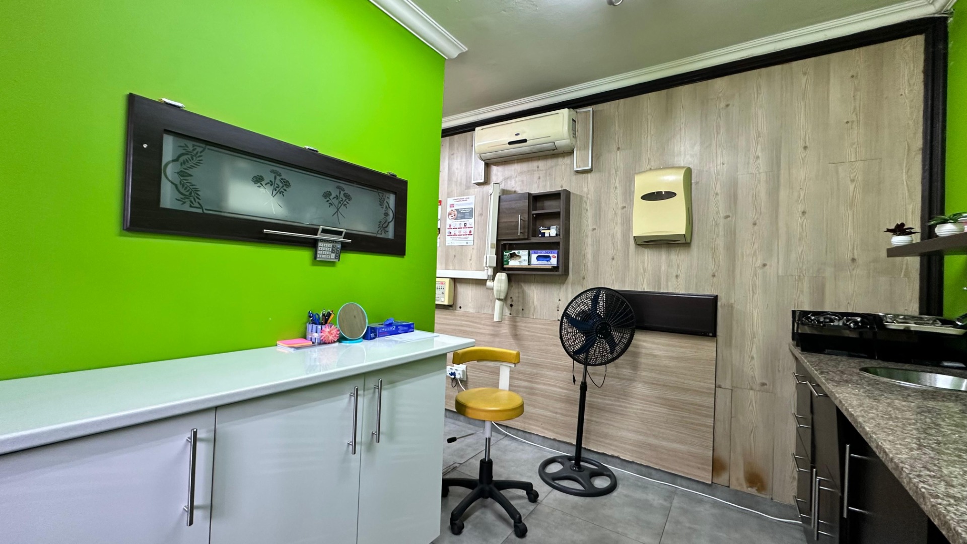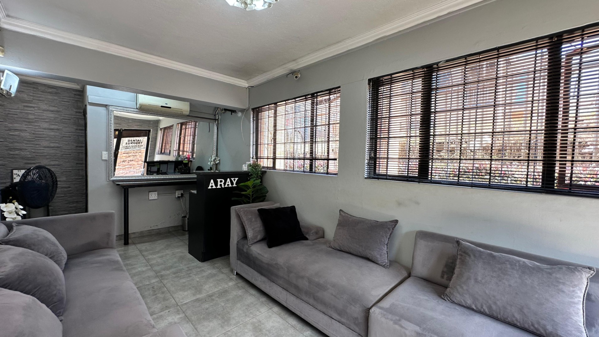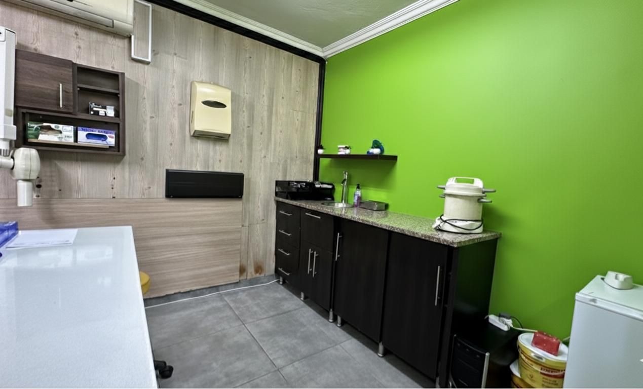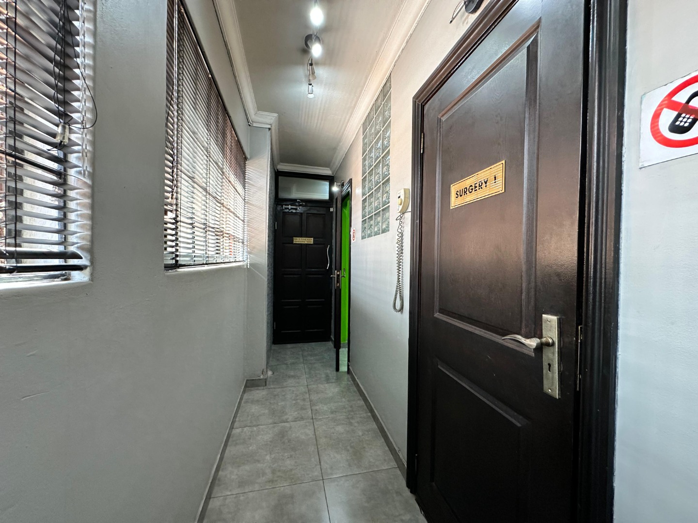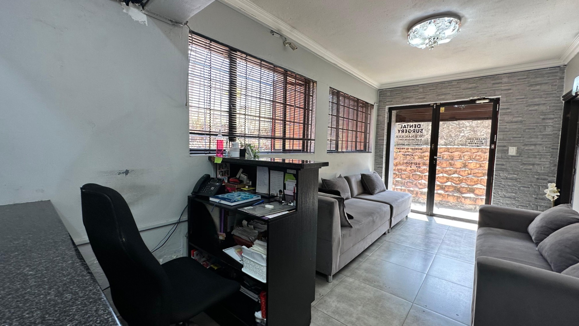 The interior boasts a modern and inviting reception and waiting area, featuring comfortable seating, contemporary grey aesthetics, and a professional reception desk. The layout includes two dedicated rooms, perfectly suited as consultation or treatment spaces, one of which is equipped with essential medical infrastructure and bright, functional lighting. A well-appointed kitchen area provides dark cabinetry, a sink, and space for appliances, catering to staff needs and operational requirements. The property also includes a functional bathroom.