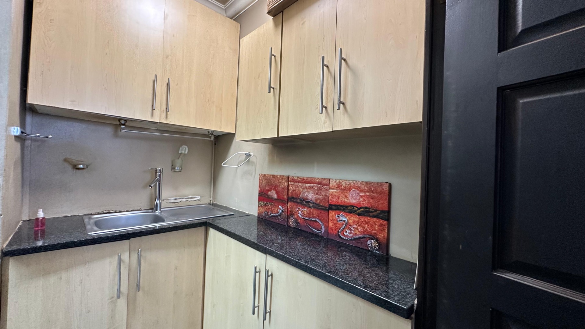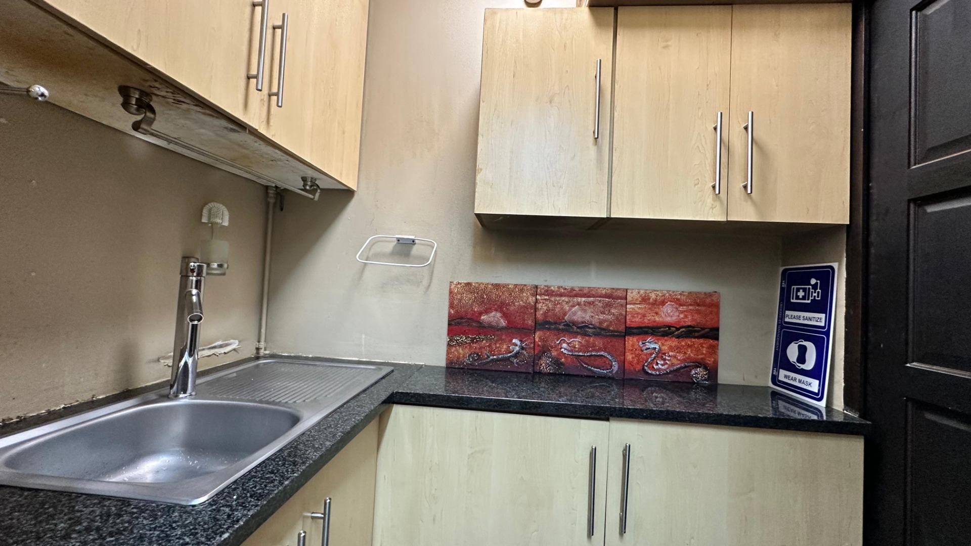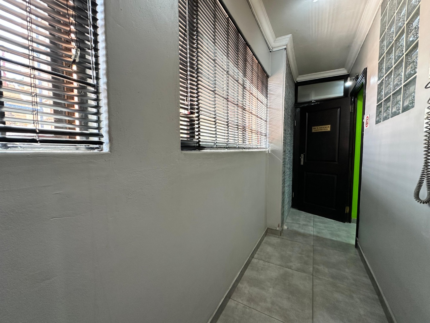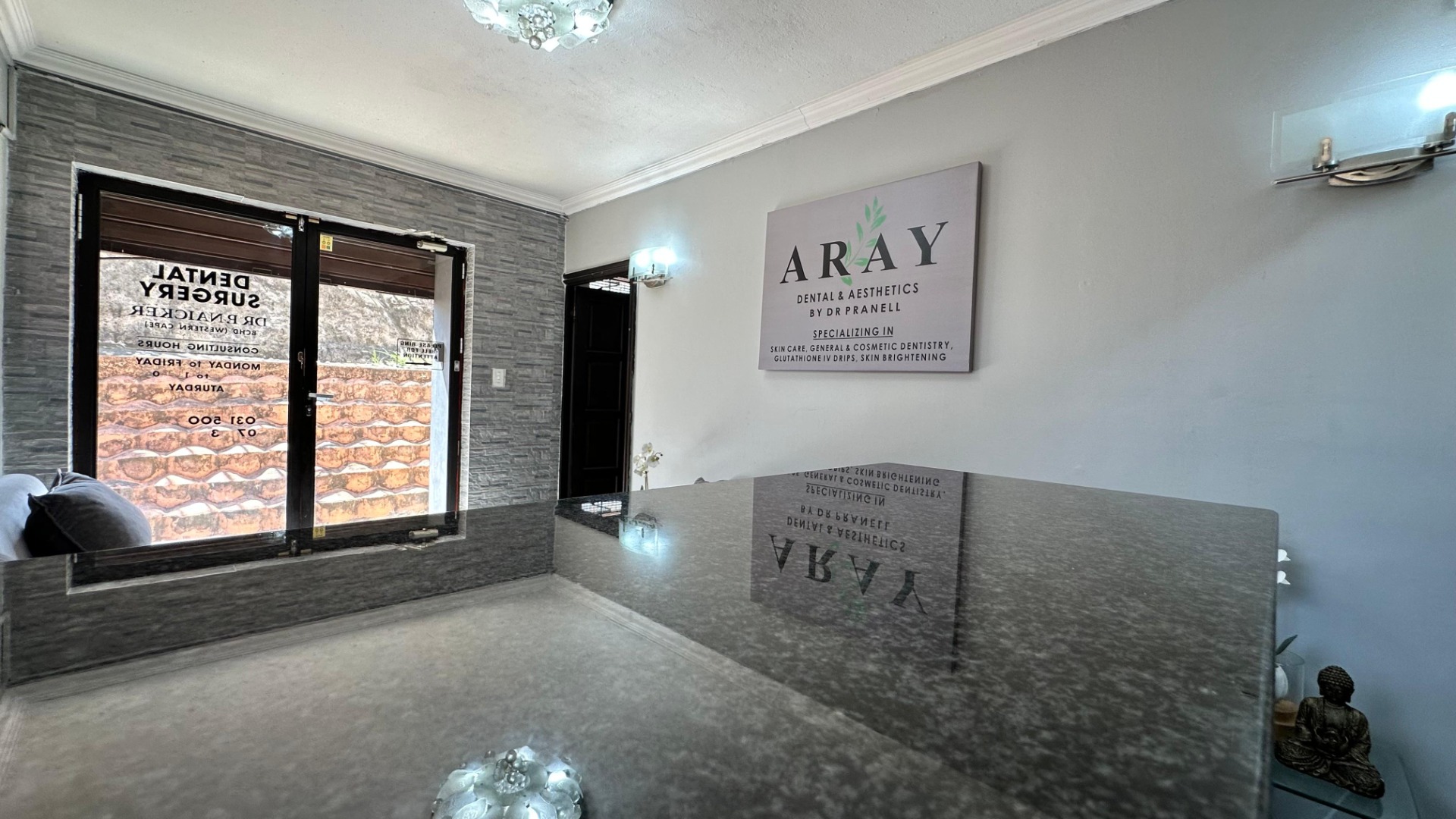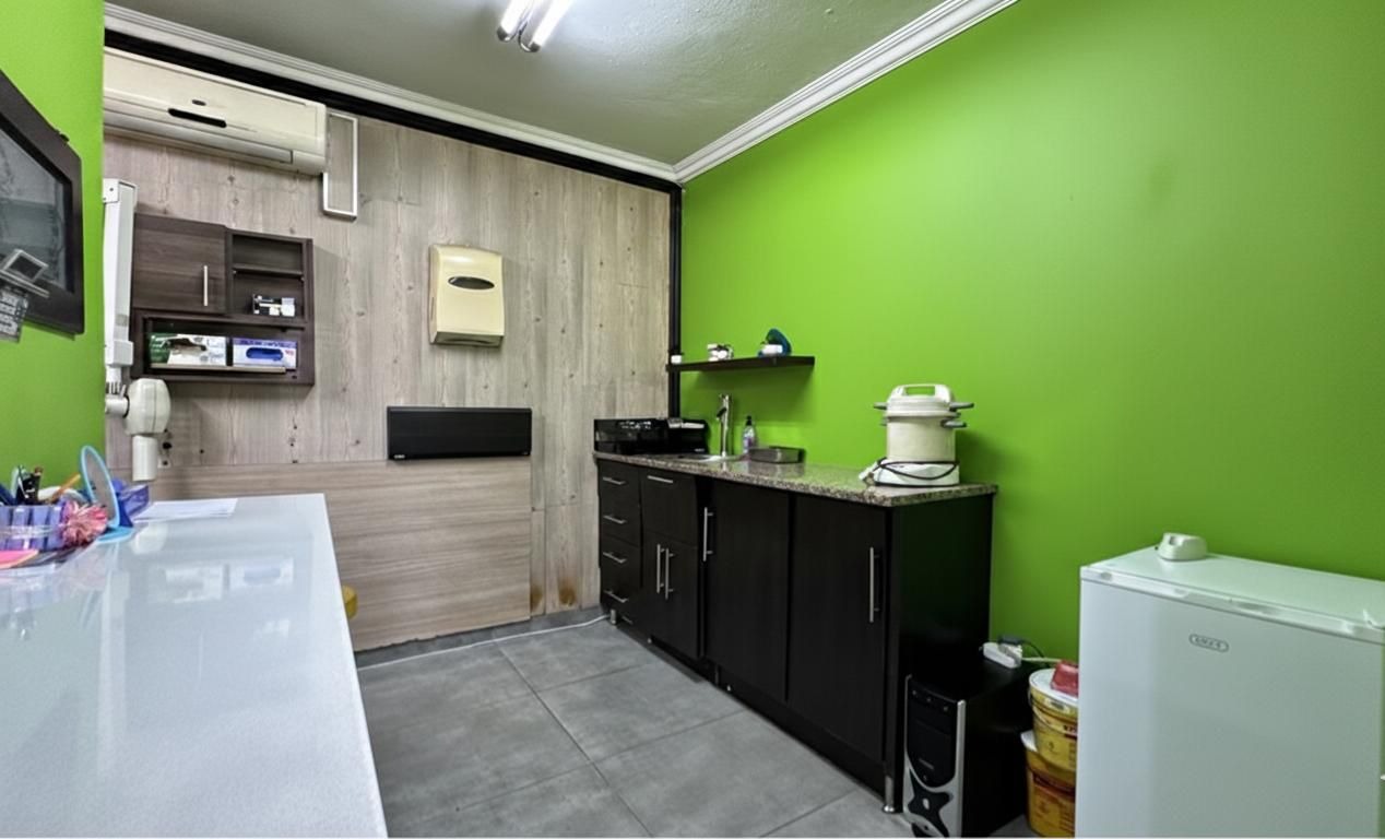 The interior boasts a modern and inviting reception and waiting area, featuring comfortable seating, contemporary grey aesthetics, and a professional reception desk. The layout includes two dedicated rooms, perfectly suited as consultation or treatment spaces, one of which is equipped with essential medical infrastructure and bright, functional lighting. A well-appointed kitchen area provides dark cabinetry, a sink, and space for appliances, catering to staff needs and operational requirements. The property also includes a functional bathroom.