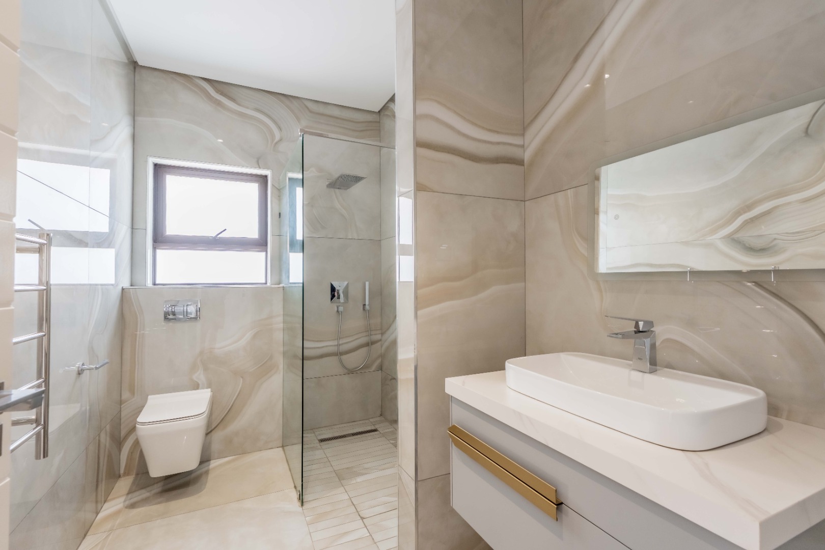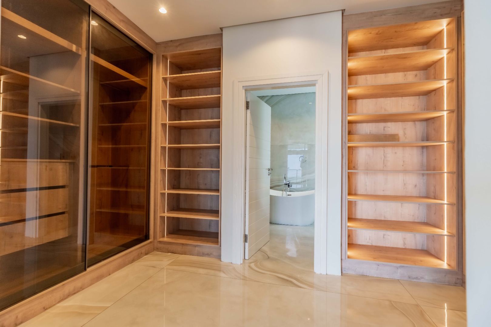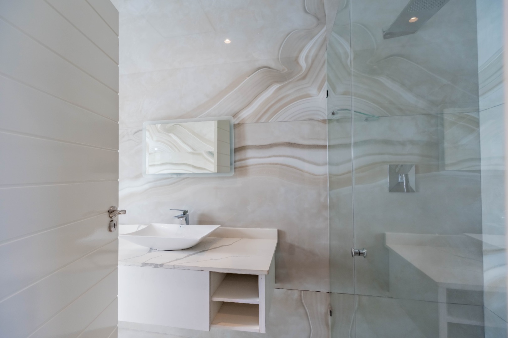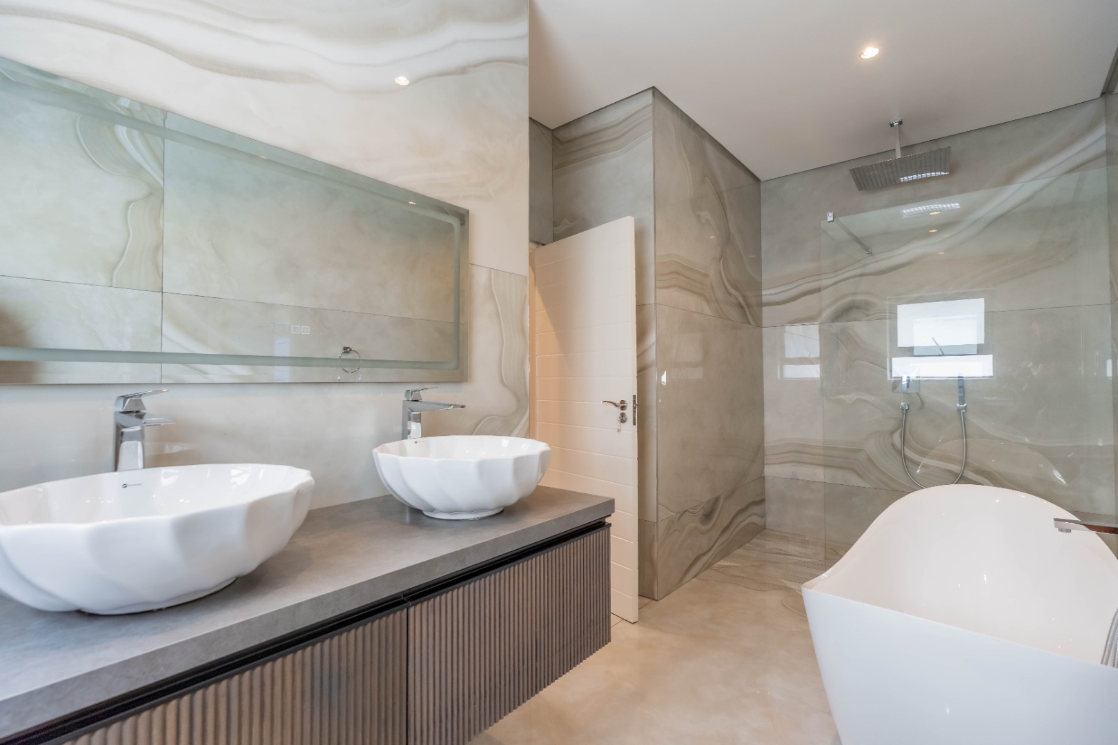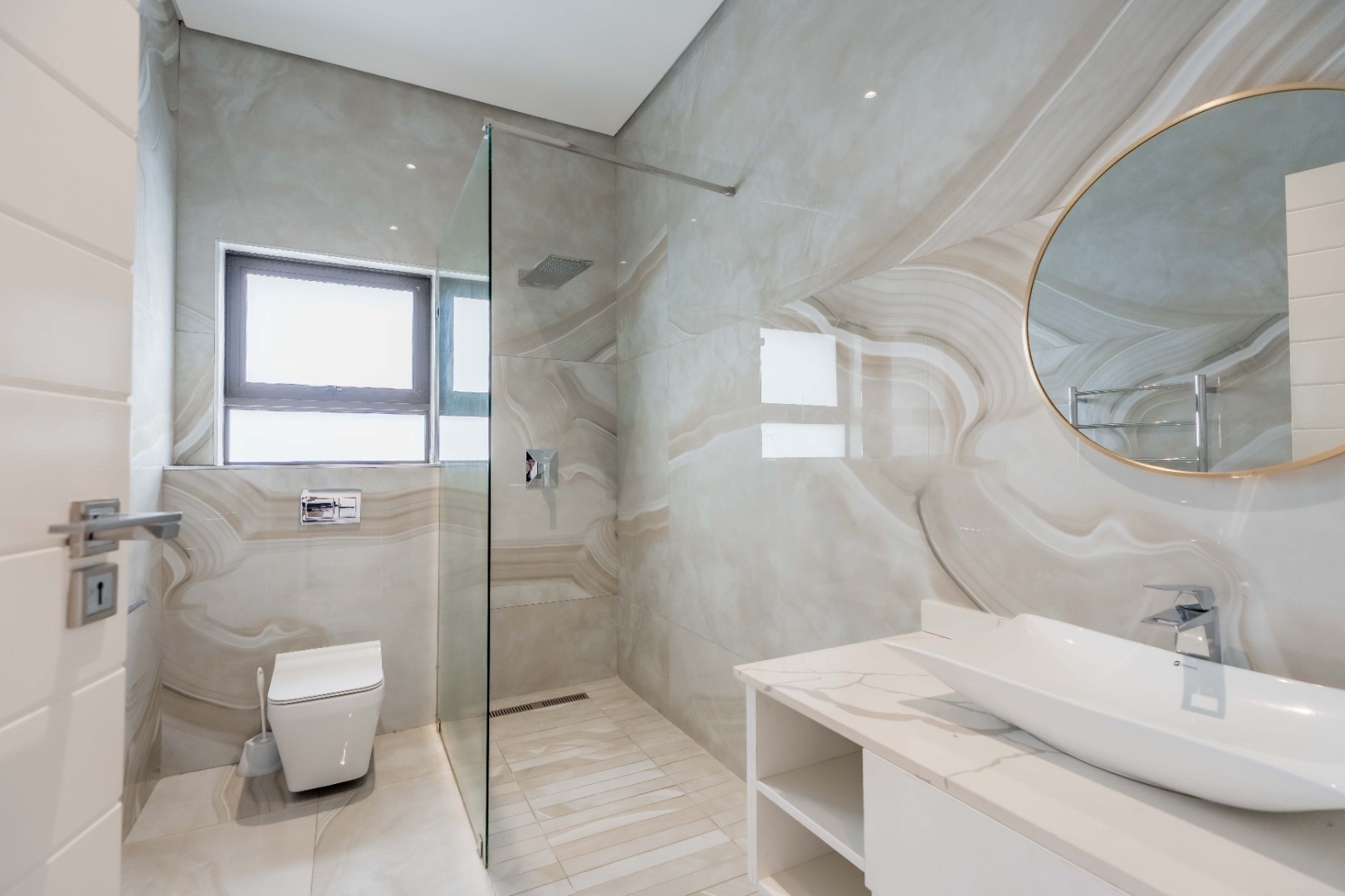 Double volume entrance with Koi pond . On this level you have a guest room and bathroom, study and guest loo ,lounge ,dining room -leads out to the patio with stunning sea views, pool and garden .