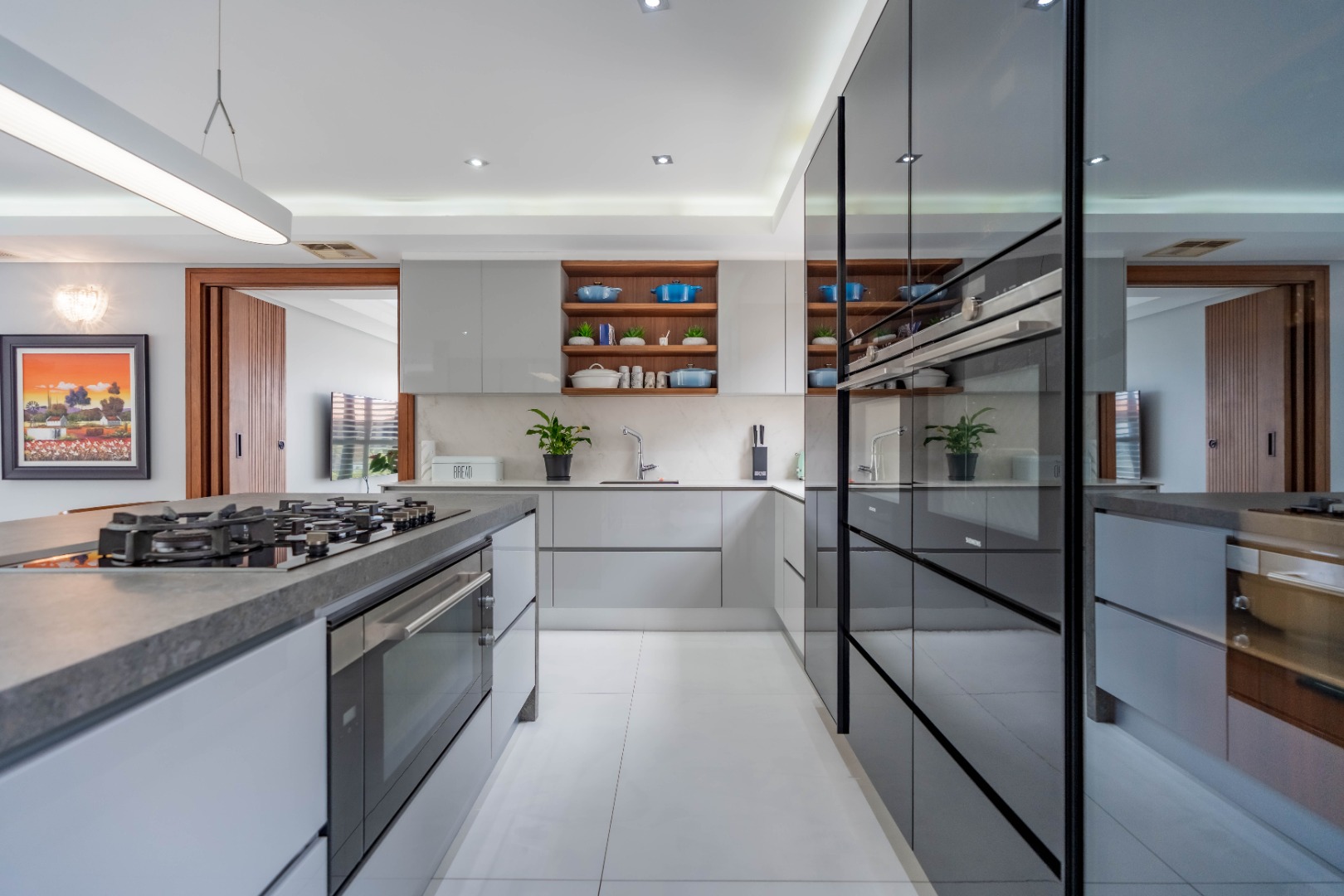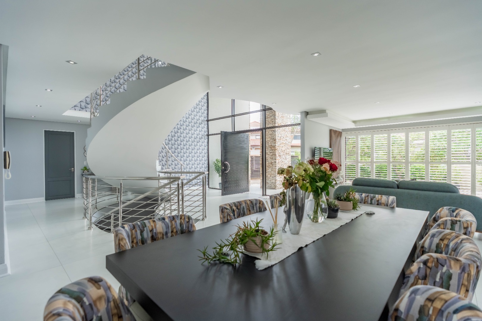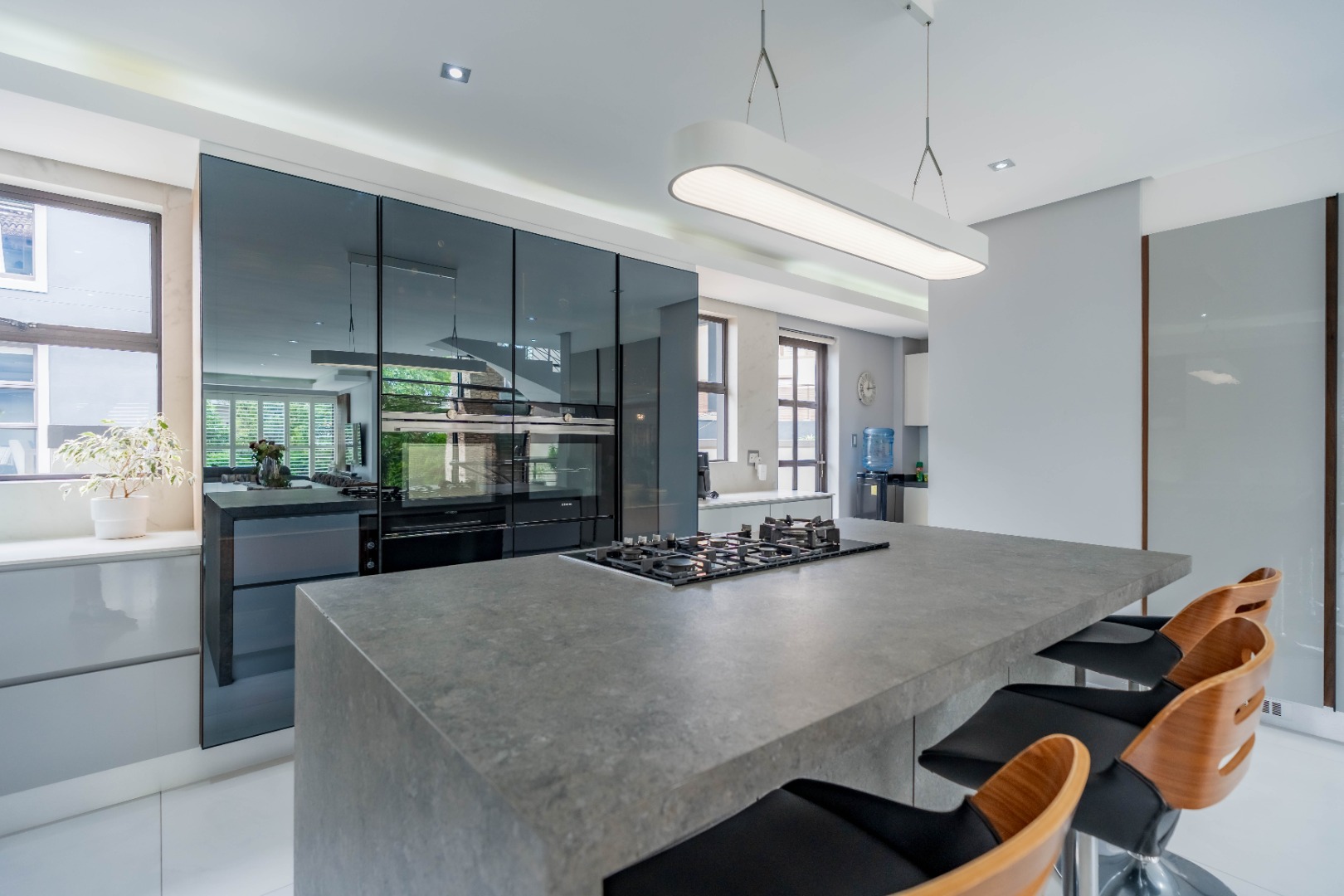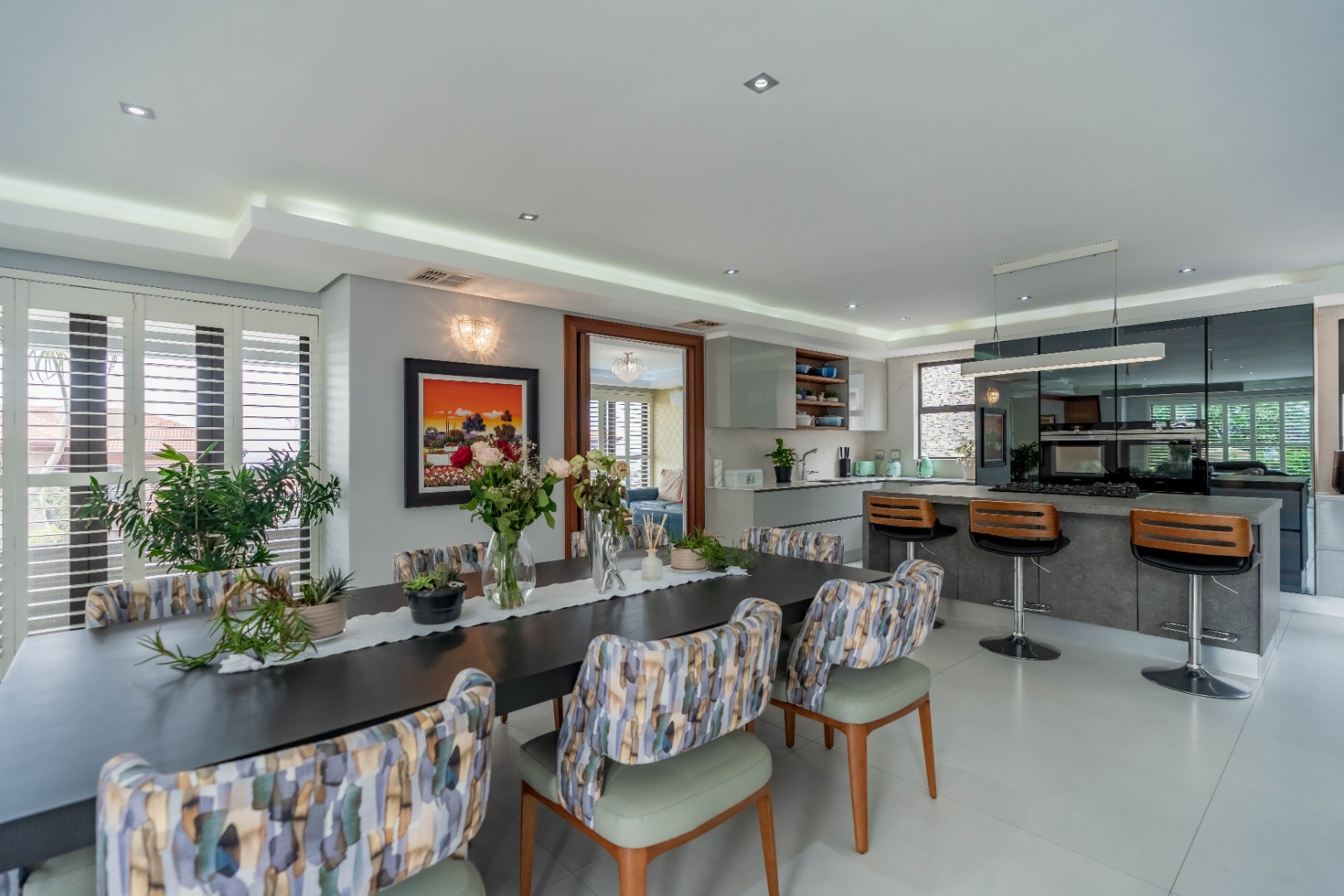 The kitchen is sleek and well-appointed, complete with a centre island, breakfast nook, Siemens appliances, integrated fridge/freezer, 5-plate gas hob, eye-level oven, and under-counter oven. Subtle details like fitted lighting in glass display cupboards add a refined touch, while the living spaces flow effortlessly for easy everyday living and entertaining.