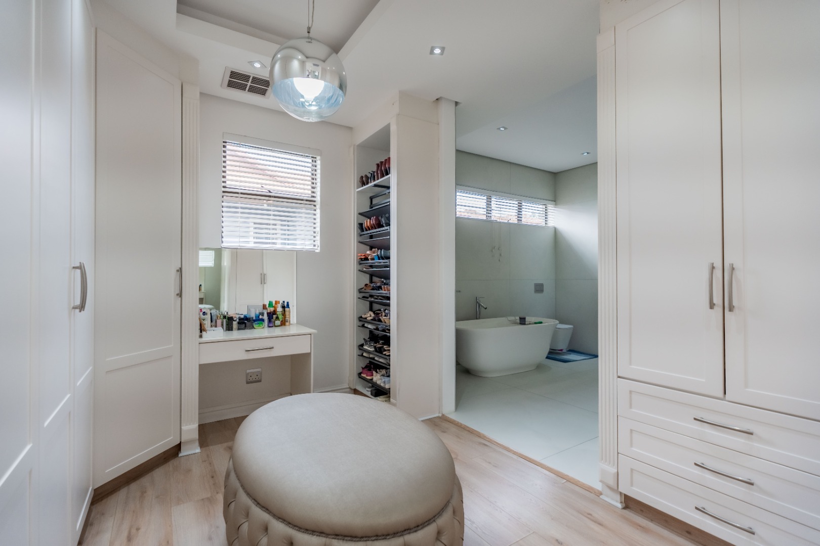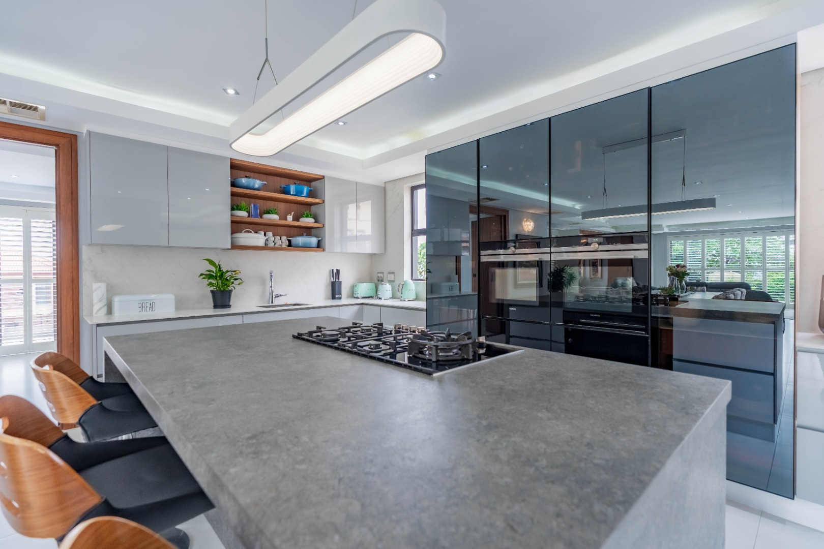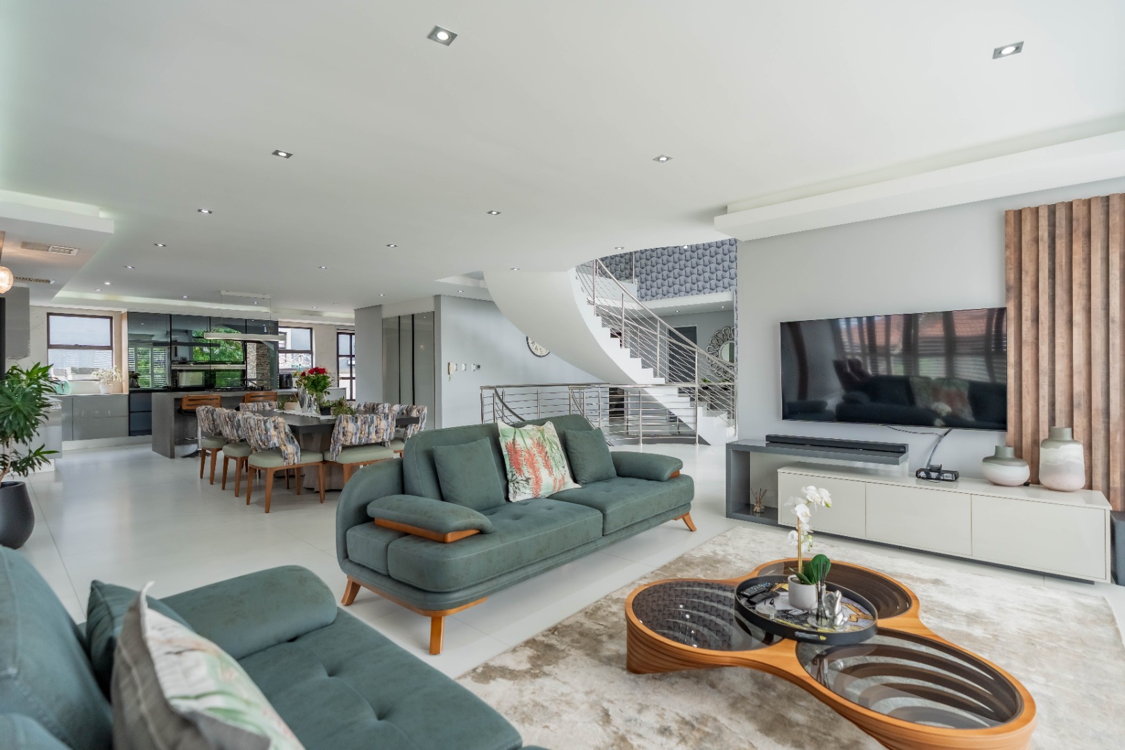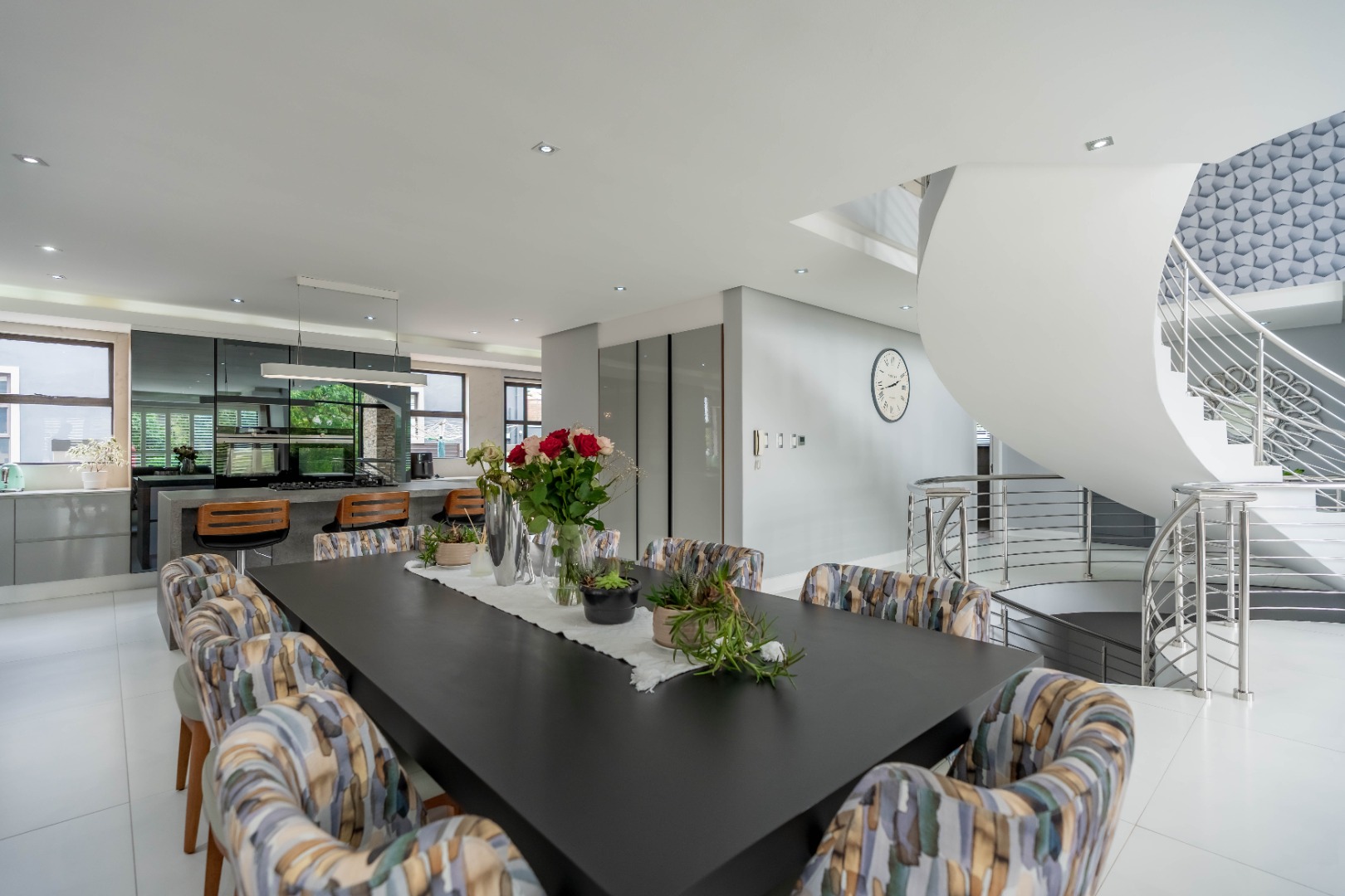 The kitchen is sleek and well-appointed, complete with a centre island, breakfast nook, Siemens appliances, integrated fridge/freezer, 5-plate gas hob, eye-level oven, and under-counter oven. Subtle details like fitted lighting in glass display cupboards add a refined touch, while the living spaces flow effortlessly for easy everyday living and entertaining.