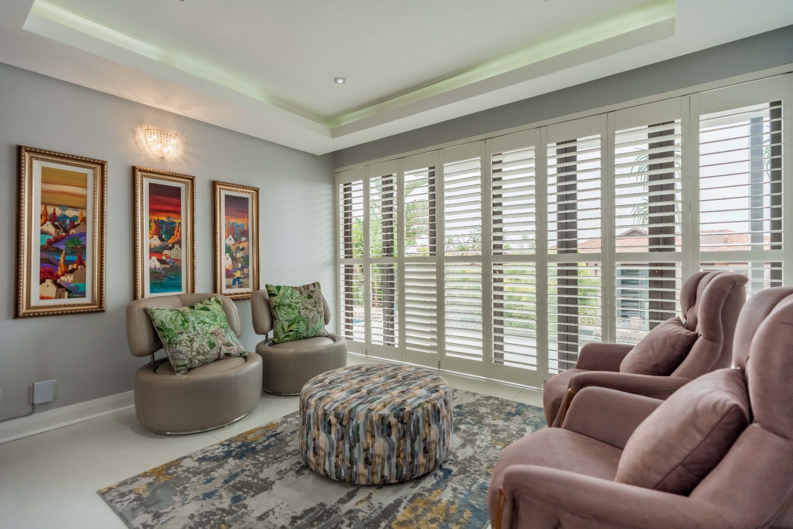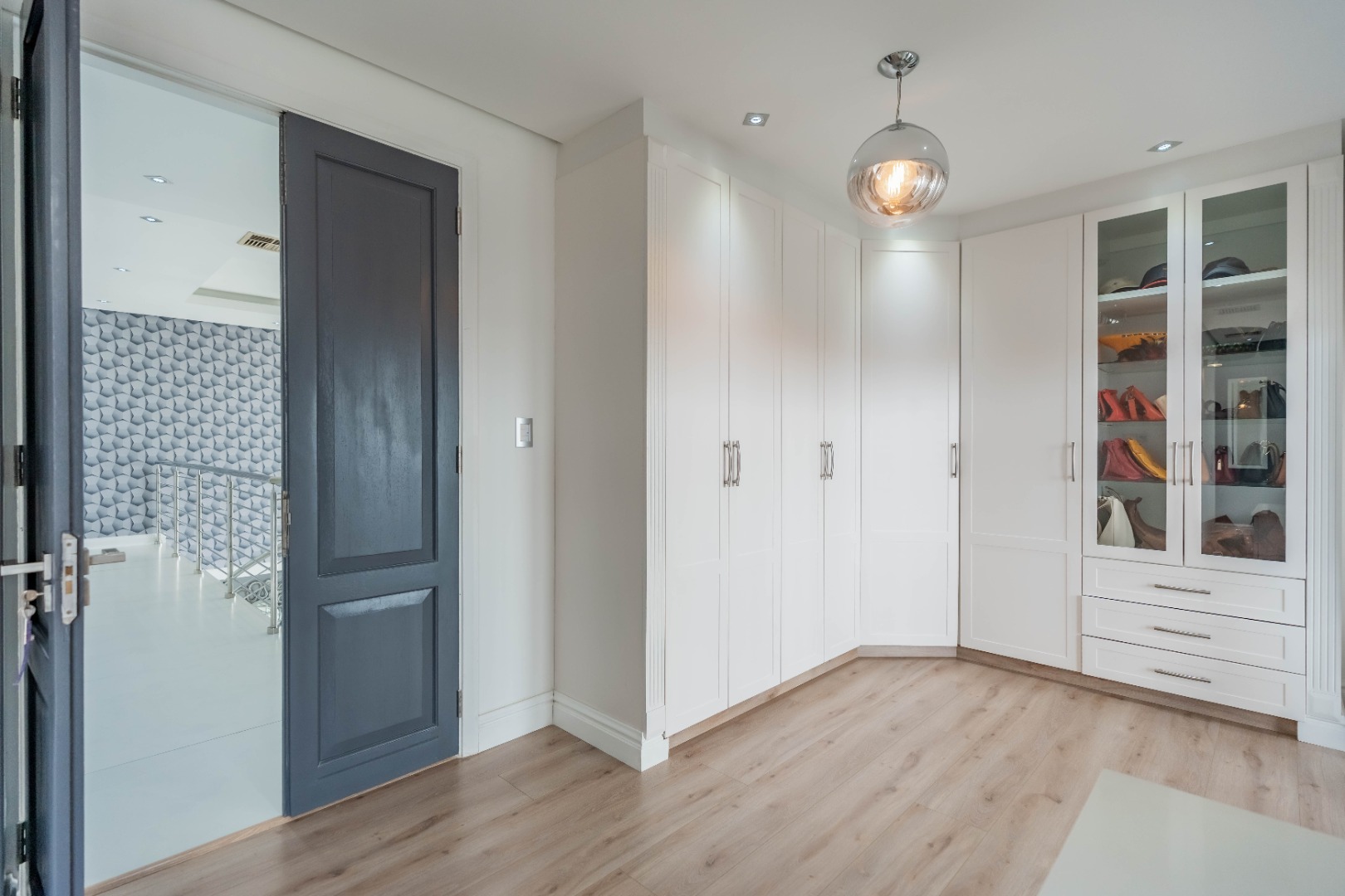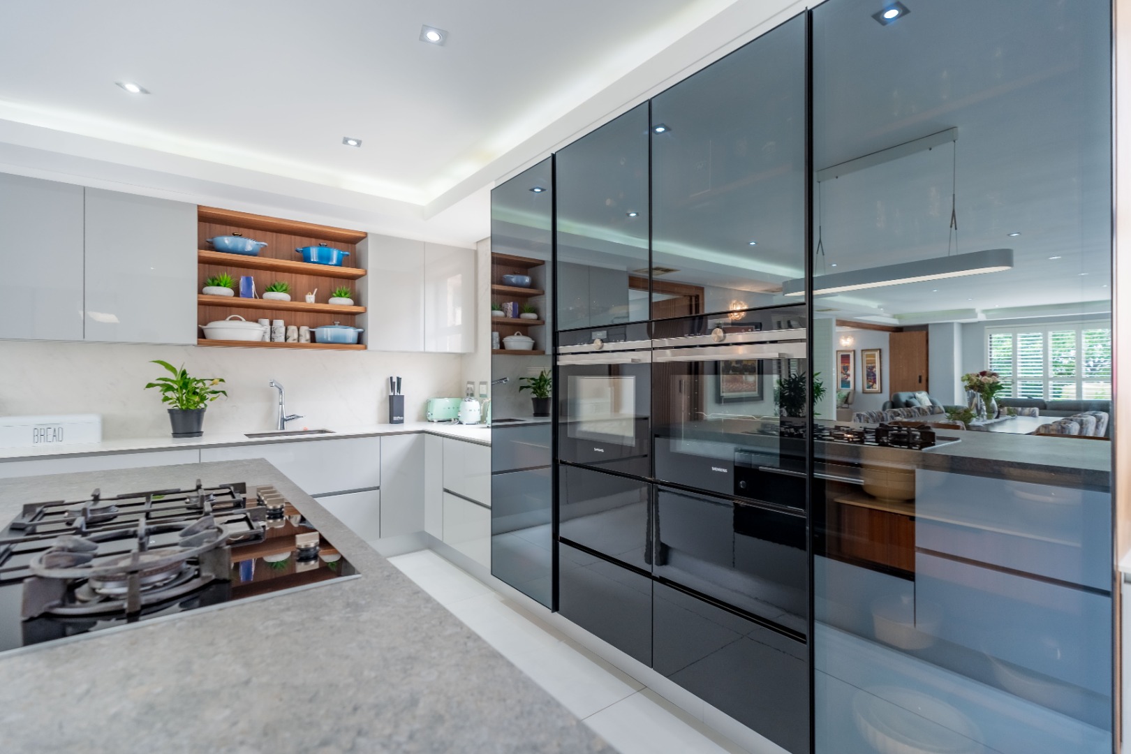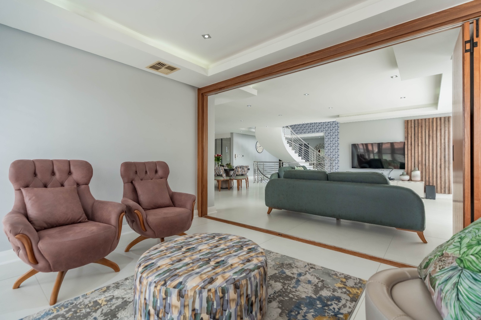 The kitchen is sleek and well-appointed, complete with a centre island, breakfast nook, Siemens appliances, integrated fridge/freezer, 5-plate gas hob, eye-level oven, and under-counter oven. Subtle details like fitted lighting in glass display cupboards add a refined touch, while the living spaces flow effortlessly for easy everyday living and entertaining.