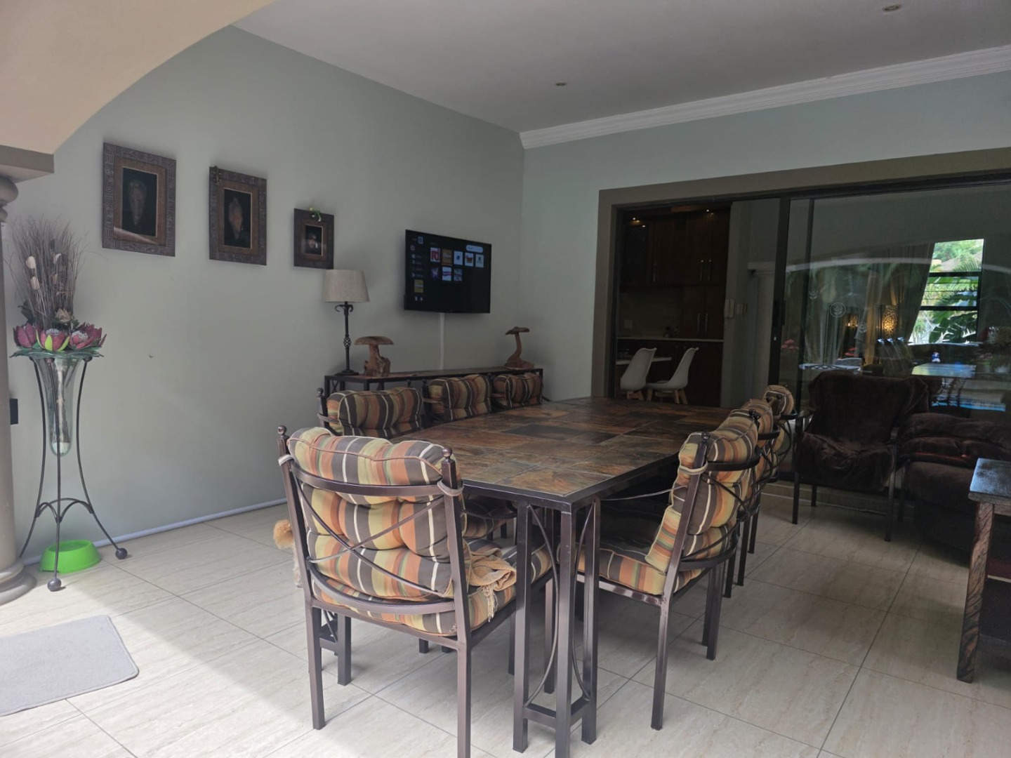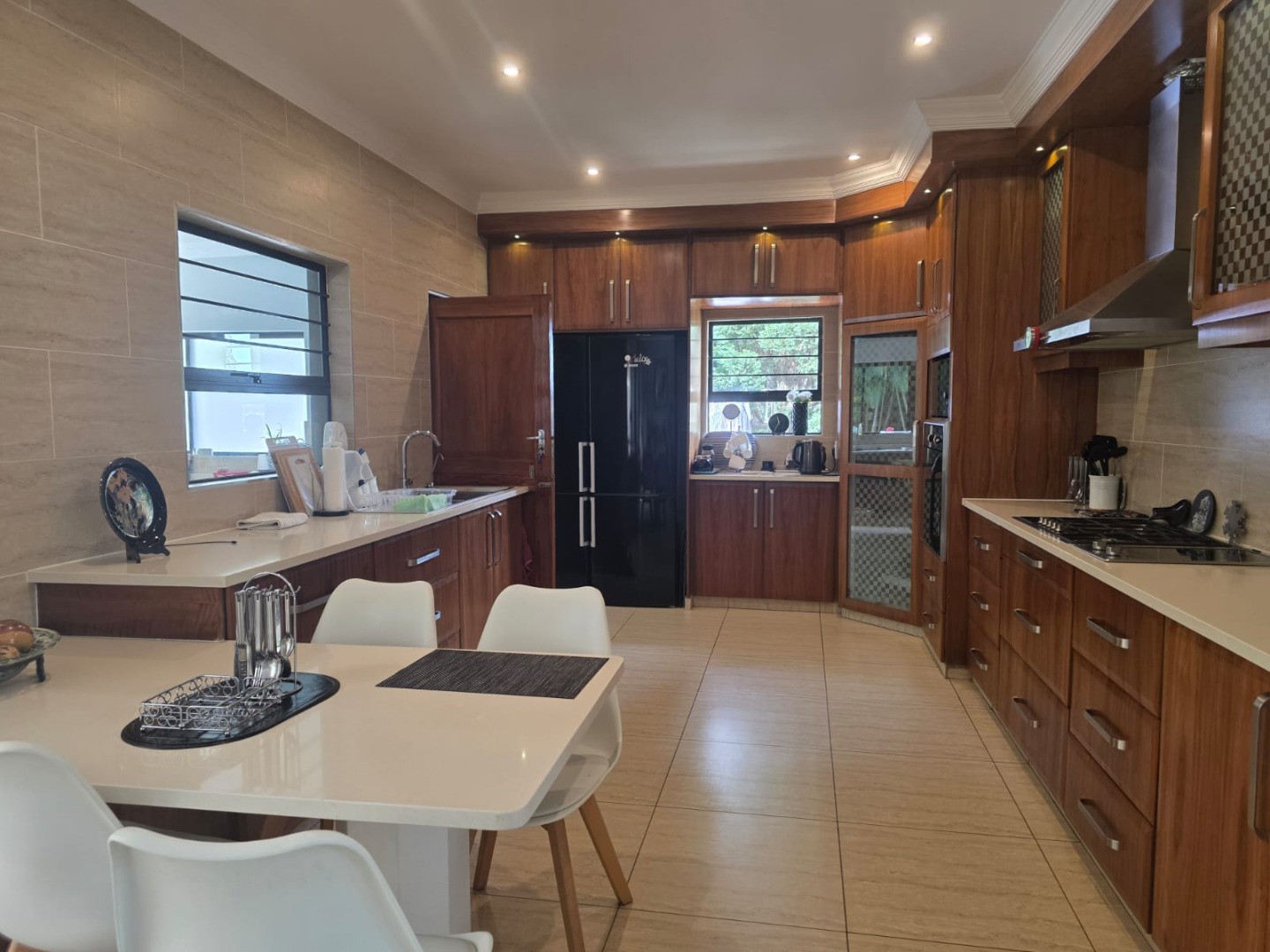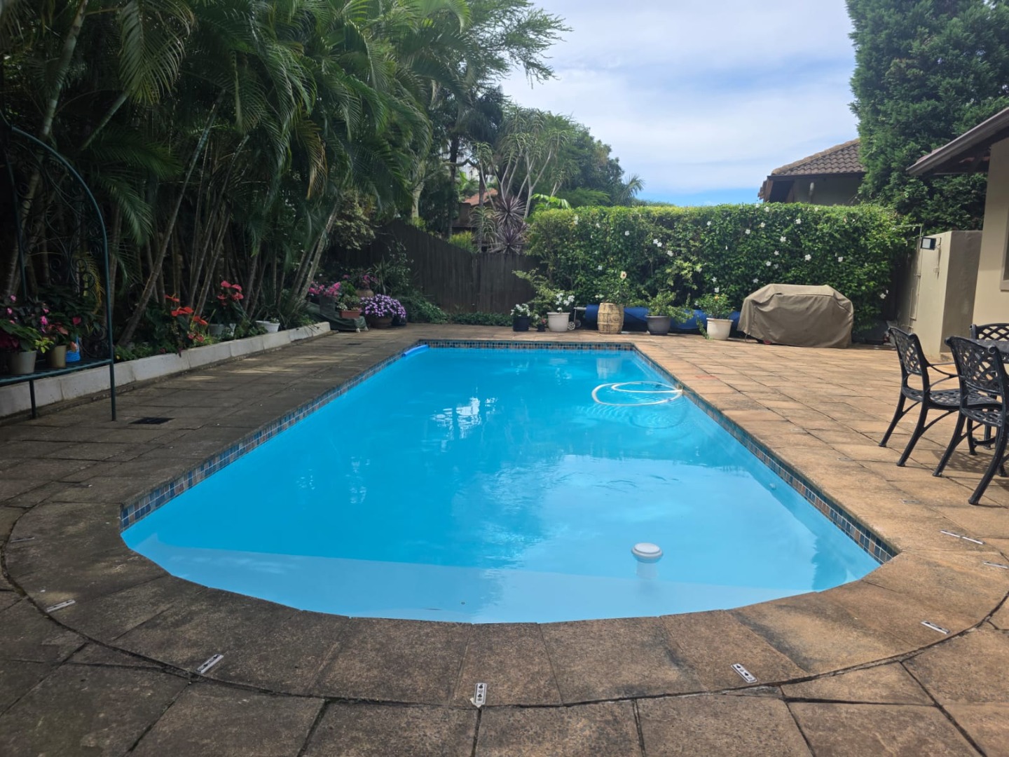 Designed for relaxed living, the open-plan layout flows seamlessly from the living and dining areas into a well-appointed kitchen fitted with ample cupboards, gas hob, eye level oven, space for double door fridge and complemented by a generous separate scullery. The living spaces extend onto a covered entertainment patio overlooking a heated pool and lush tropical garden, creating the perfect setting for hosting family and friends.