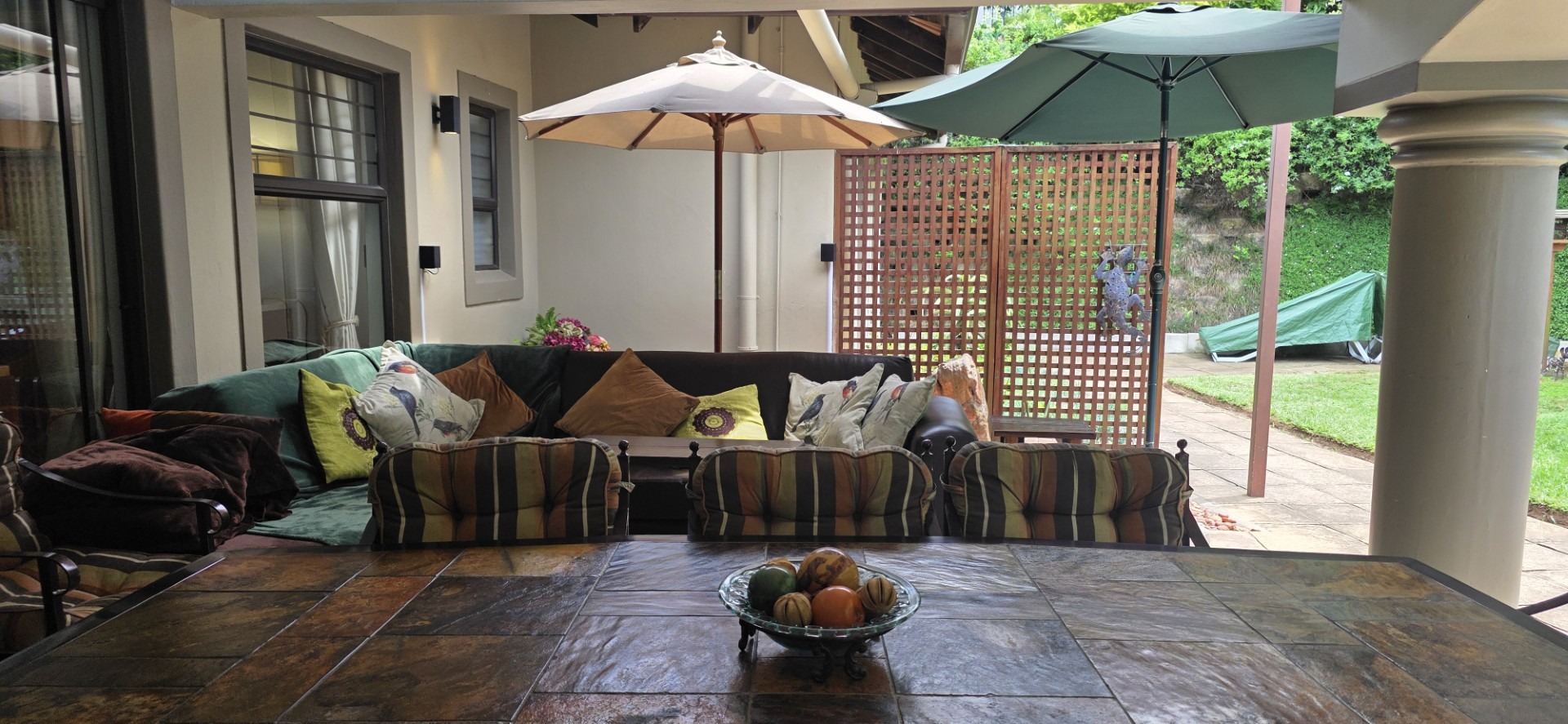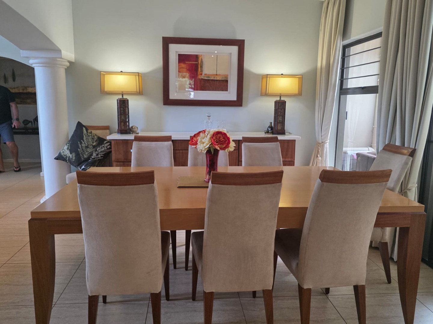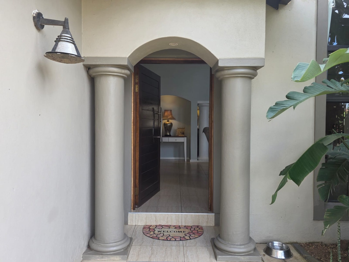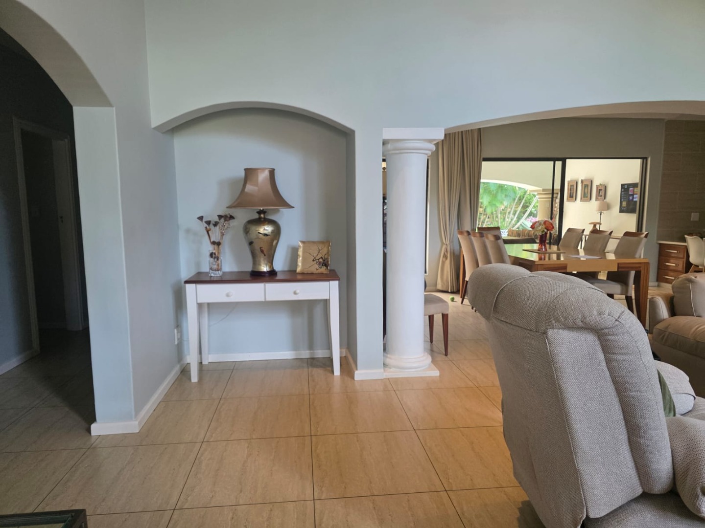 Designed for relaxed living, the open-plan layout flows seamlessly from the living and dining areas into a well-appointed kitchen fitted with ample cupboards, gas hob, eye level oven, space for double door fridge and complemented by a generous separate scullery. The living spaces extend onto a covered entertainment patio overlooking a heated pool and lush tropical garden, creating the perfect setting for hosting family and friends.