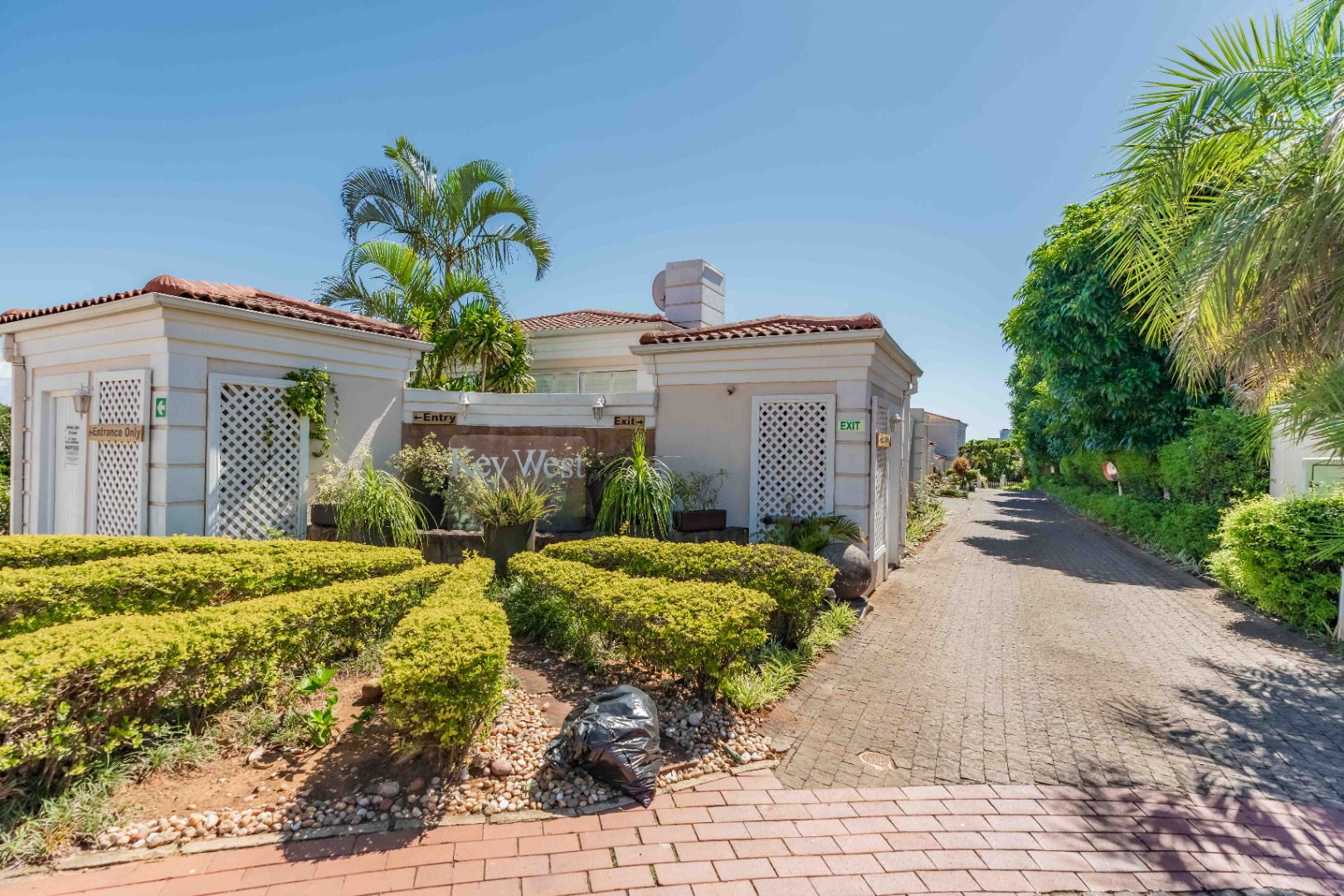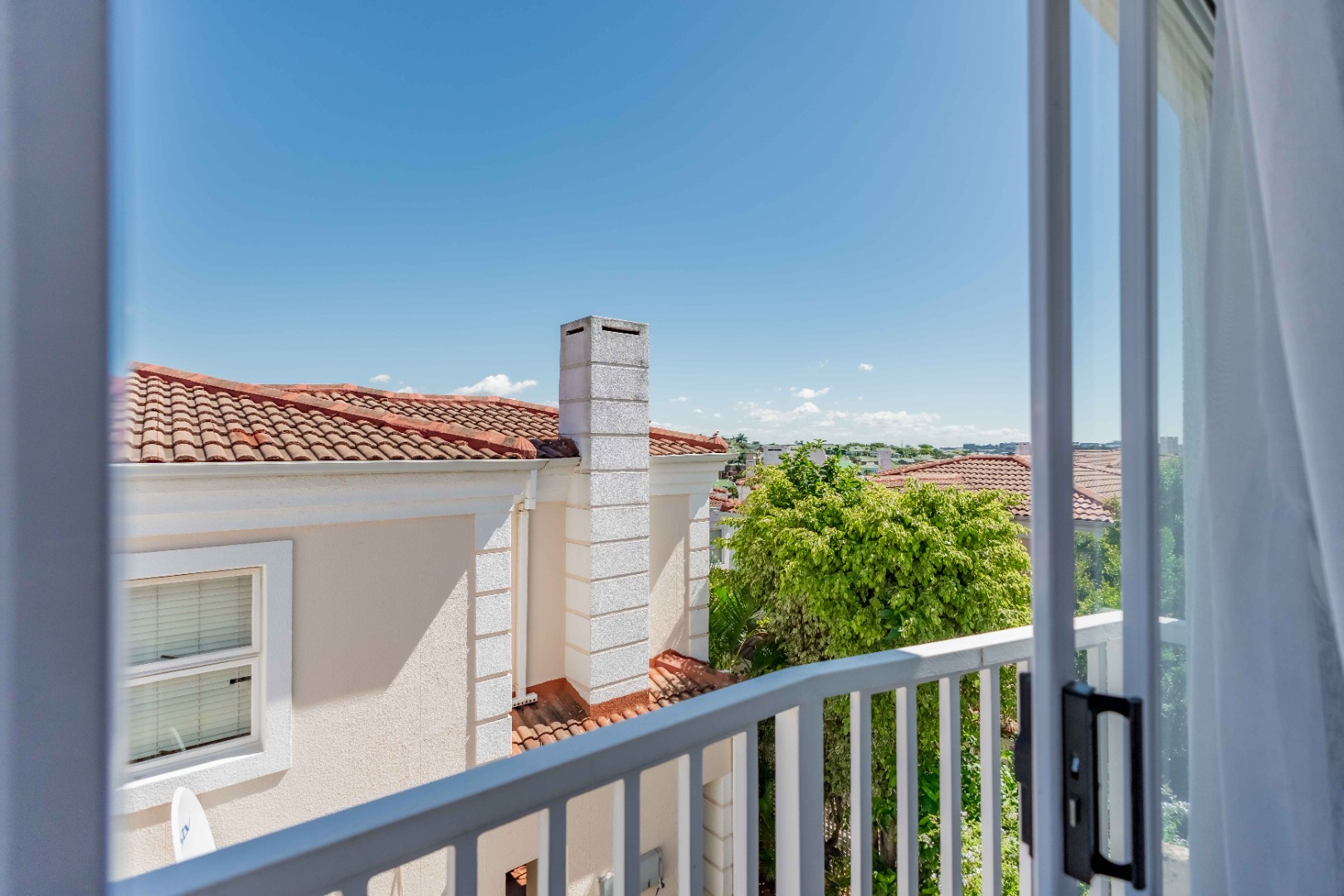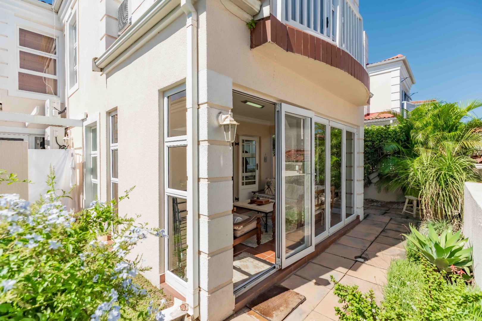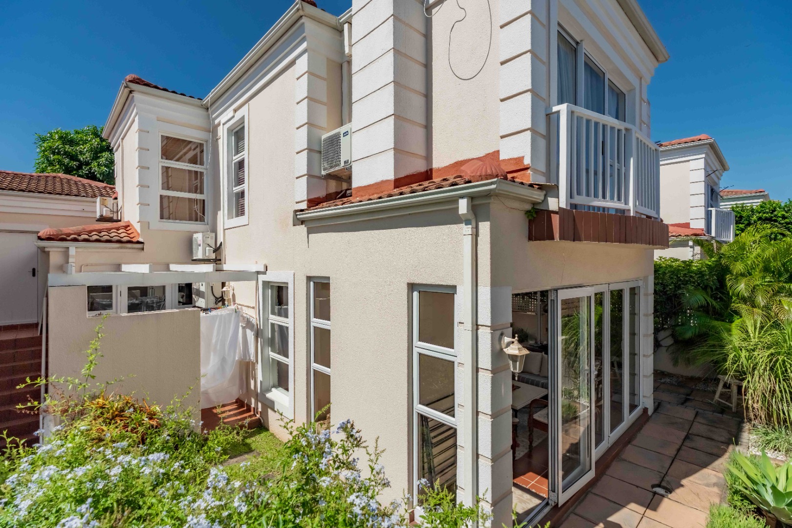 Spacious open plan living area comprising of dining, lounge, kitchen plumbed for dishwasher, separate scullery area with a door to the courtyard and garden. There is space for a built in braai on the patio where you can entertain or relax and enjoy the birdlife in the neat garden maintained by the complex. Upstairs are three bedrooms and two bathrooms. The main bedroom is large enough for a king size bed, has ample cupboard space, an en-suite bathroom and a private balcony. The family bathroom is shared and there is also a linen cupboard in the passage. There are two garages, one has a back door access to the garden and the other is plumbed for a washing machine. Visitors can park outside the garage or preferably just outside the complex. Entrance is from Umhlanga Rocks Drive, past Saxony Shopping Centre with Spar, Chemist various other shops, facilities and Engen Garage with Woolworths Foods. The estate has state of the art security with monitored cameras, guard patrols, residents have biometric access and all visitors require security codes. La Lucia Business Parks, La Lucia Mall, Padel and Tennis Courts, Virgin Active and a variety of top schools and