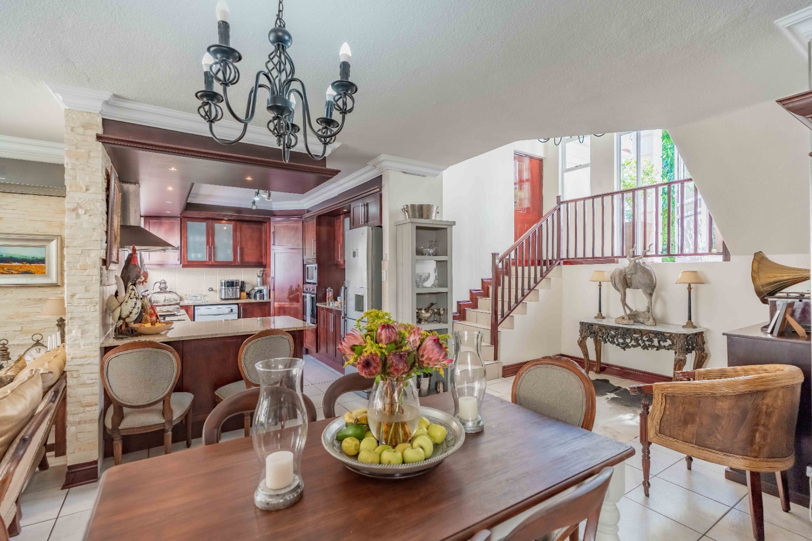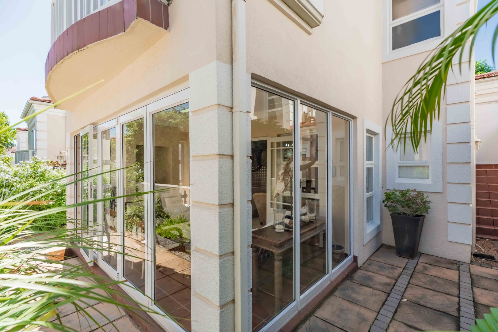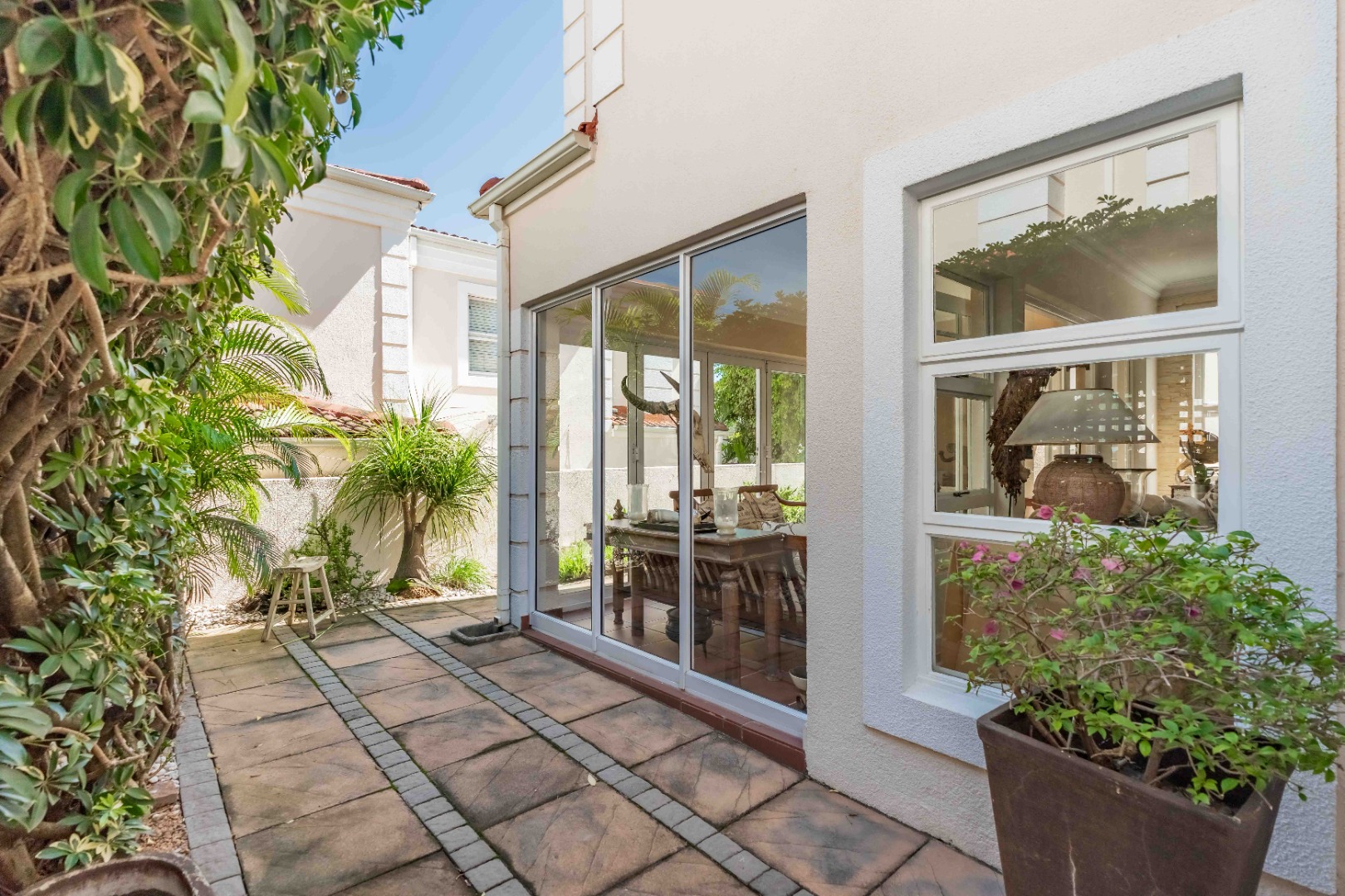 Spacious open plan living area comprising of dining, lounge, kitchen plumbed for dishwasher, separate scullery area with a door to the courtyard and garden. There is space for a built in braai on the patio where you can entertain or relax and enjoy the birdlife in the neat garden maintained by the complex. Upstairs are three bedrooms and two bathrooms. The main bedroom is large enough for a king size bed, has ample cupboard space, an en-suite bathroom and a private balcony. The family bathroom is shared and there is also a linen cupboard in the passage. There are two garages, one has a back door access to the garden and the other is plumbed for a washing machine. Visitors can park outside the garage or preferably just outside the complex. Entrance is from Umhlanga Rocks Drive, past Saxony Shopping Centre with Spar, Chemist various other shops, facilities and Engen Garage with Woolworths Foods. The estate has state of the art security with monitored cameras, guard patrols, residents have biometric access and all visitors require security codes. La Lucia Business Parks, La Lucia Mall, Padel and Tennis Courts, Virgin Active and a variety of top schools and