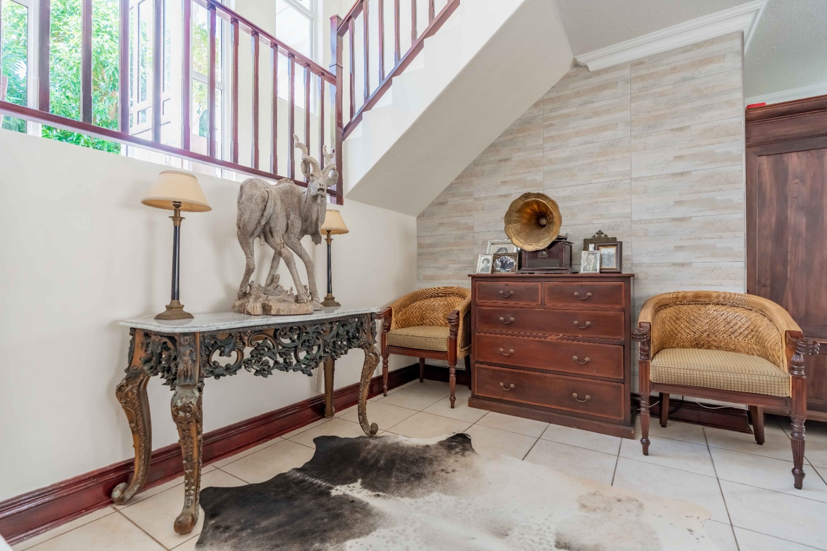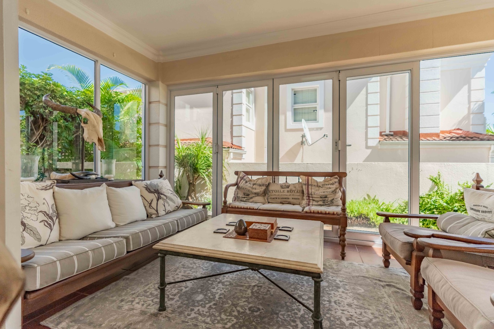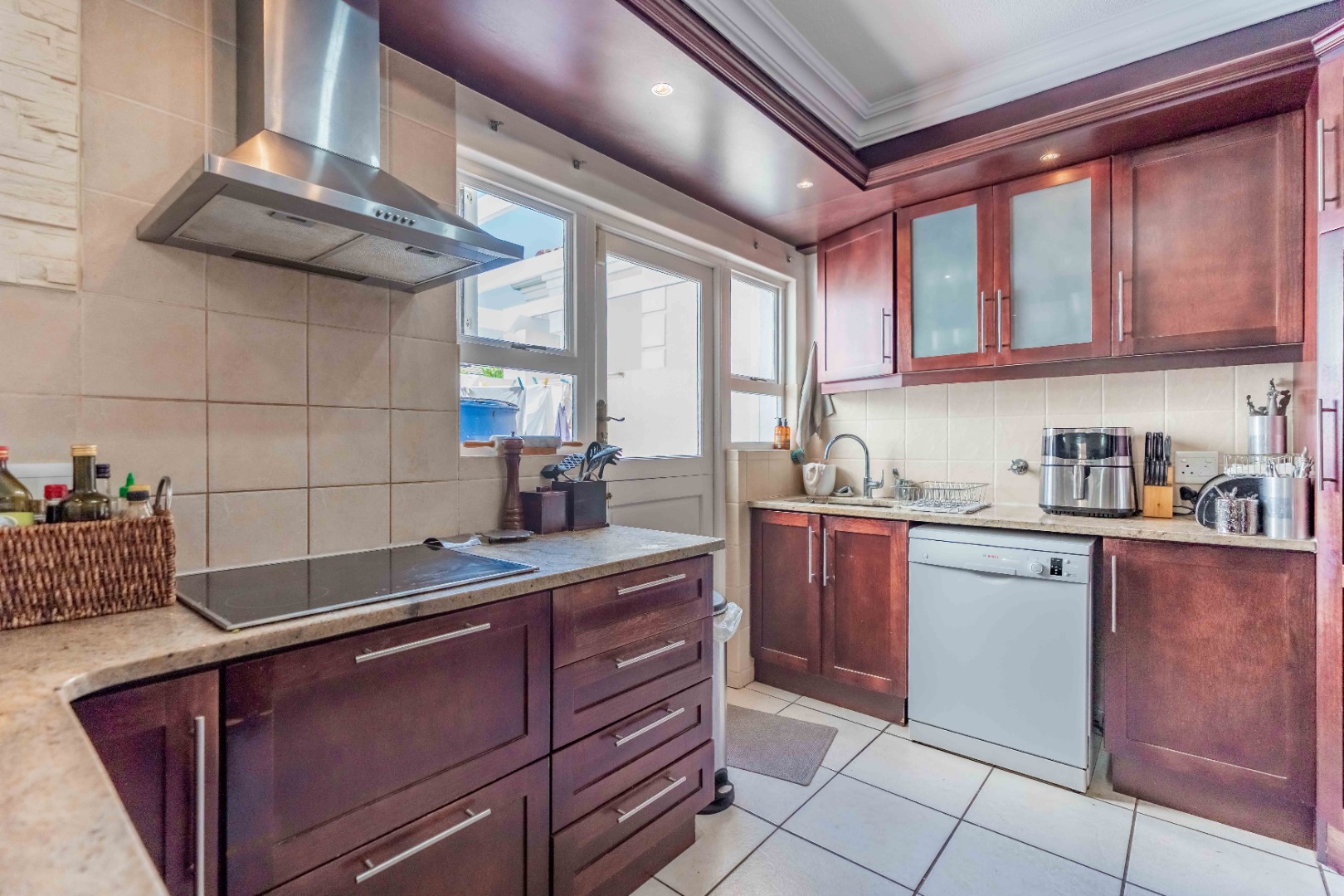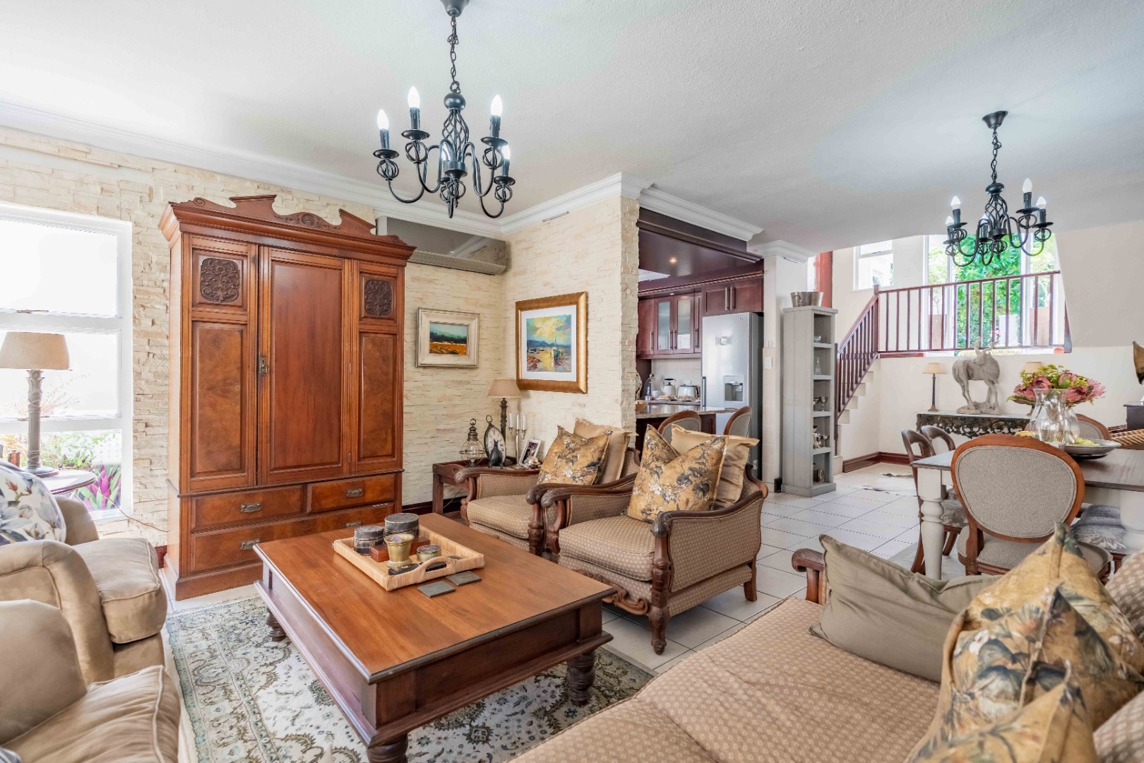 Spacious open plan living area comprising of dining, lounge, kitchen plumbed for dishwasher, separate scullery area with a door to the courtyard and garden. There is space for a built in braai on the patio where you can entertain or relax and enjoy the birdlife in the neat garden maintained by the complex. Upstairs are three bedrooms and two bathrooms. The main bedroom is large enough for a king size bed, has ample cupboard space, an en-suite bathroom and a private balcony. The family bathroom is shared and there is also a linen cupboard in the passage. There are two garages, one has a back door access to the garden and the other is plumbed for a washing machine. Visitors can park outside the garage or preferably just outside the complex. Entrance is from Umhlanga Rocks Drive, past Saxony Shopping Centre with Spar, Chemist various other shops, facilities and Engen Garage with Woolworths Foods. The estate has state of the art security with monitored cameras, guard patrols, residents have biometric access and all visitors require security codes. La Lucia Business Parks, La Lucia Mall, Padel and Tennis Courts, Virgin Active and a variety of top schools and