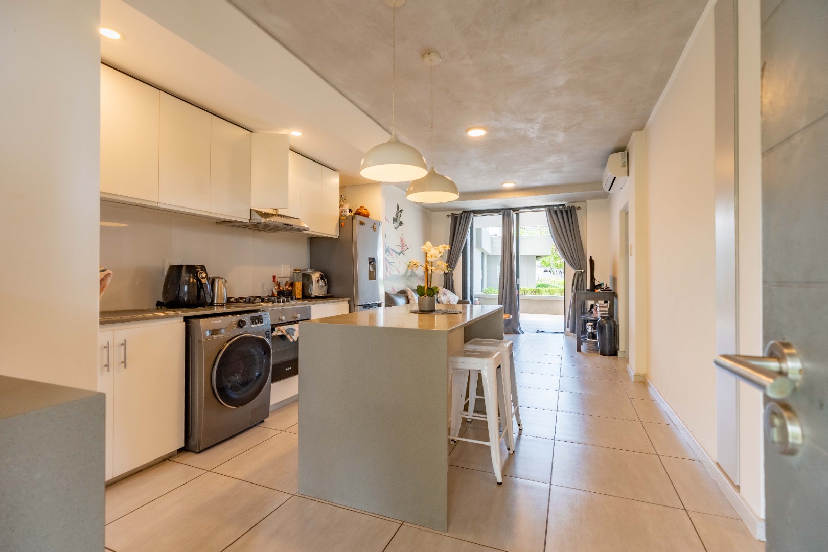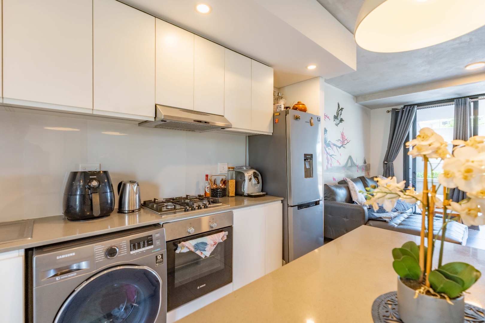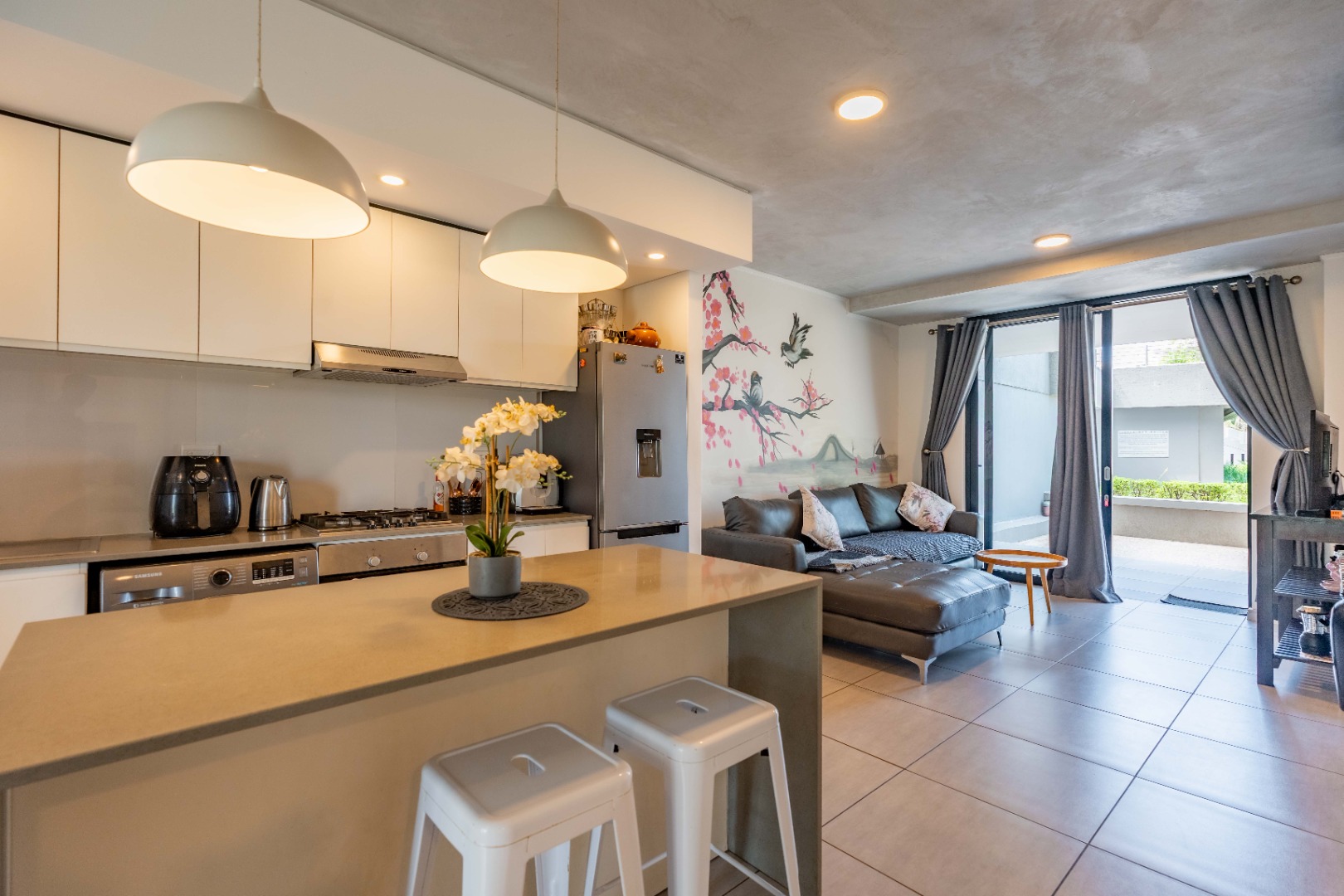 Open-plan living area flows seamlessly from the lounge to the spacious private patio. Kitchen has a centre island, gas stove and plumbing for washing machine and dishwasher. The lounge has a lovely feature wall with a beautiful painting.