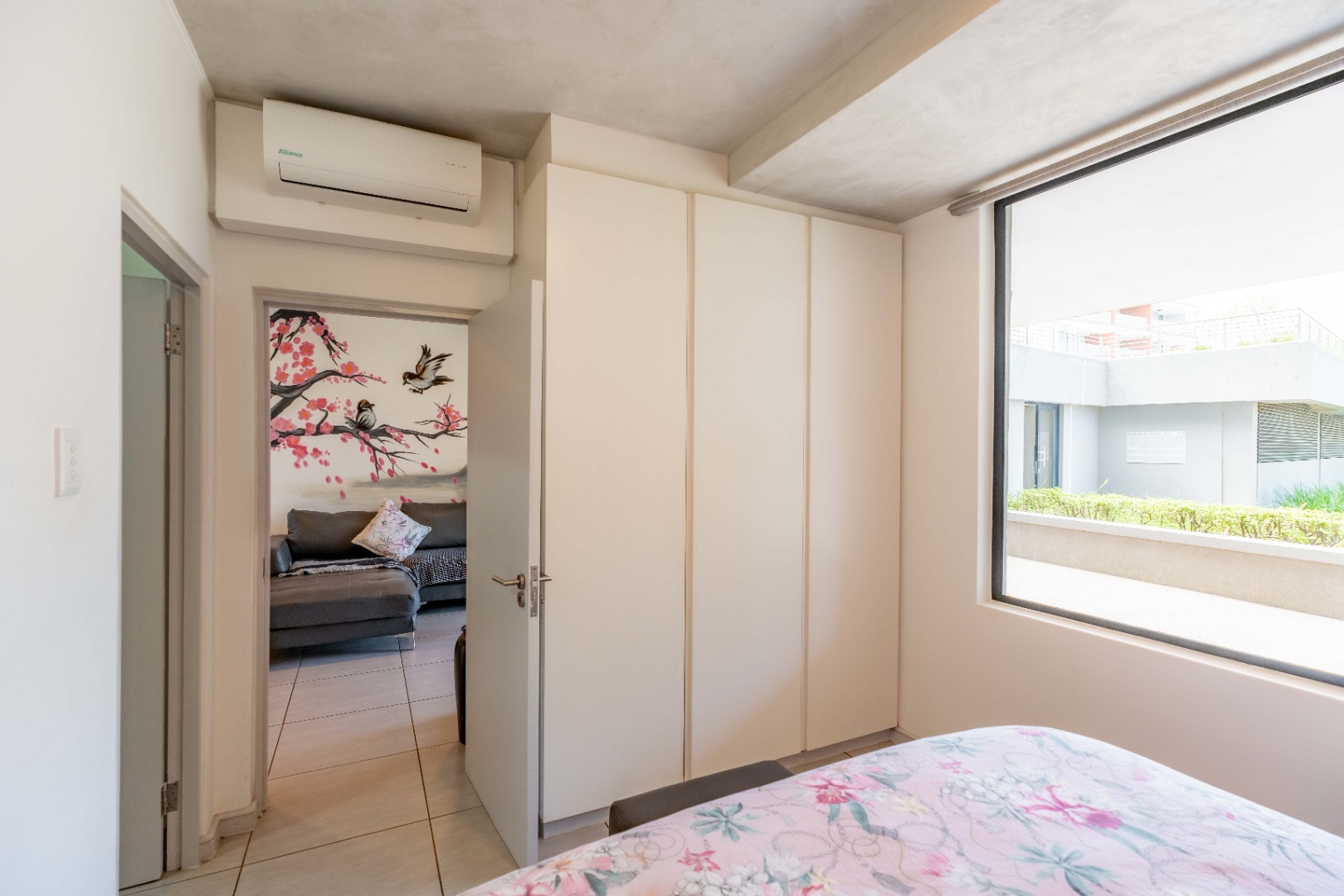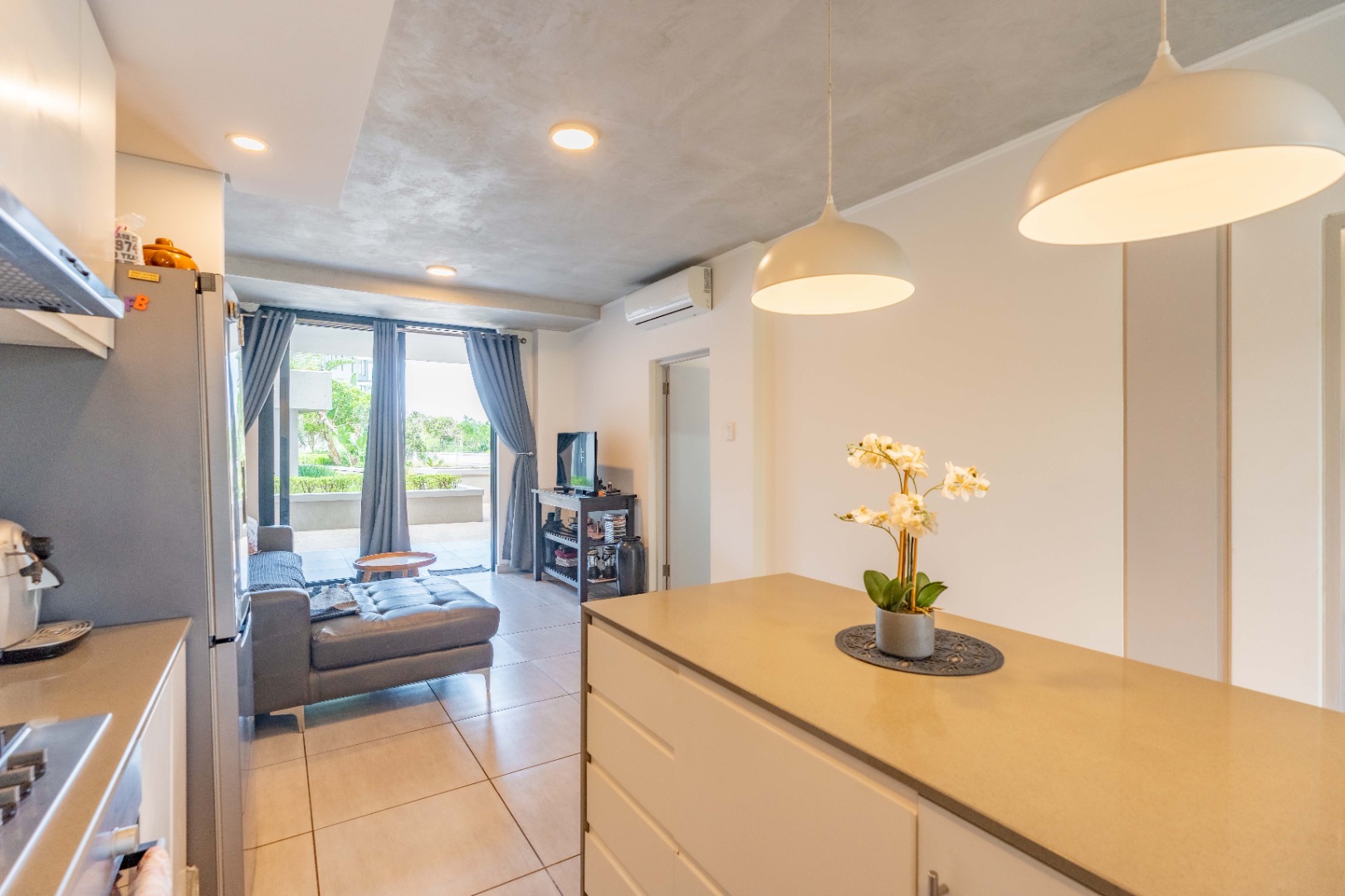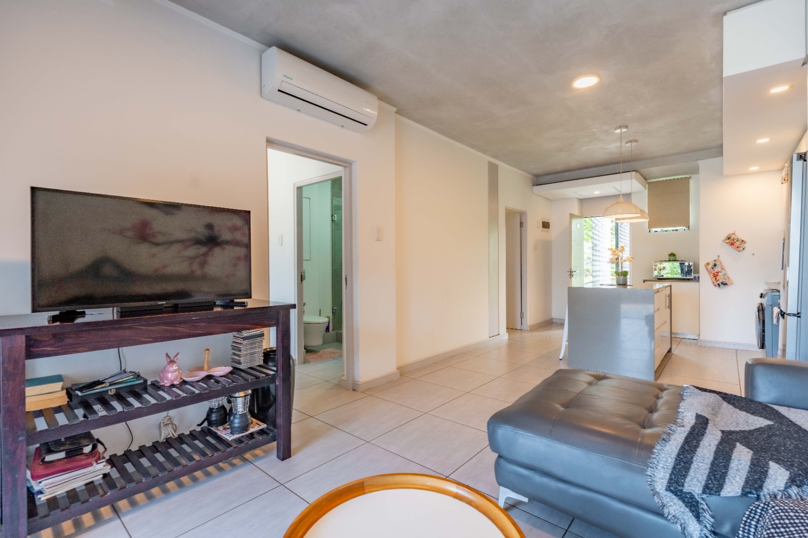 Open-plan living area flows seamlessly from the lounge to the spacious private patio. Kitchen has a centre island, gas stove and plumbing for washing machine and dishwasher. The lounge has a lovely feature wall with a beautiful painting.