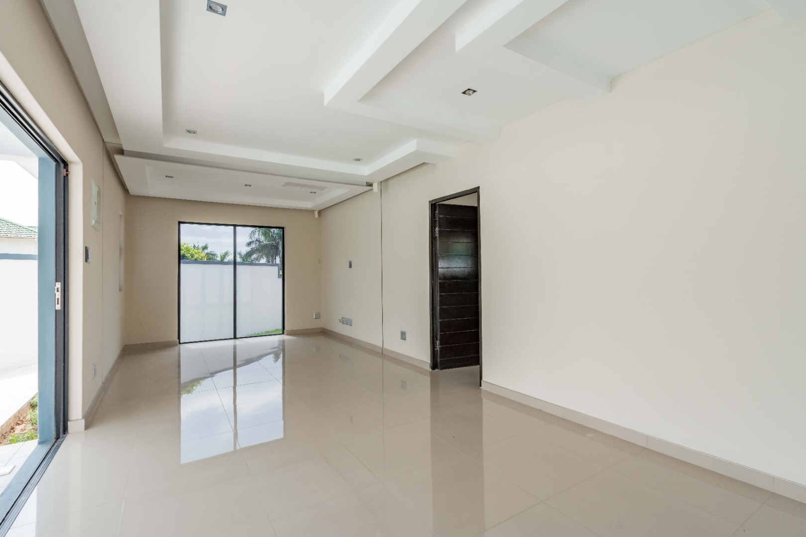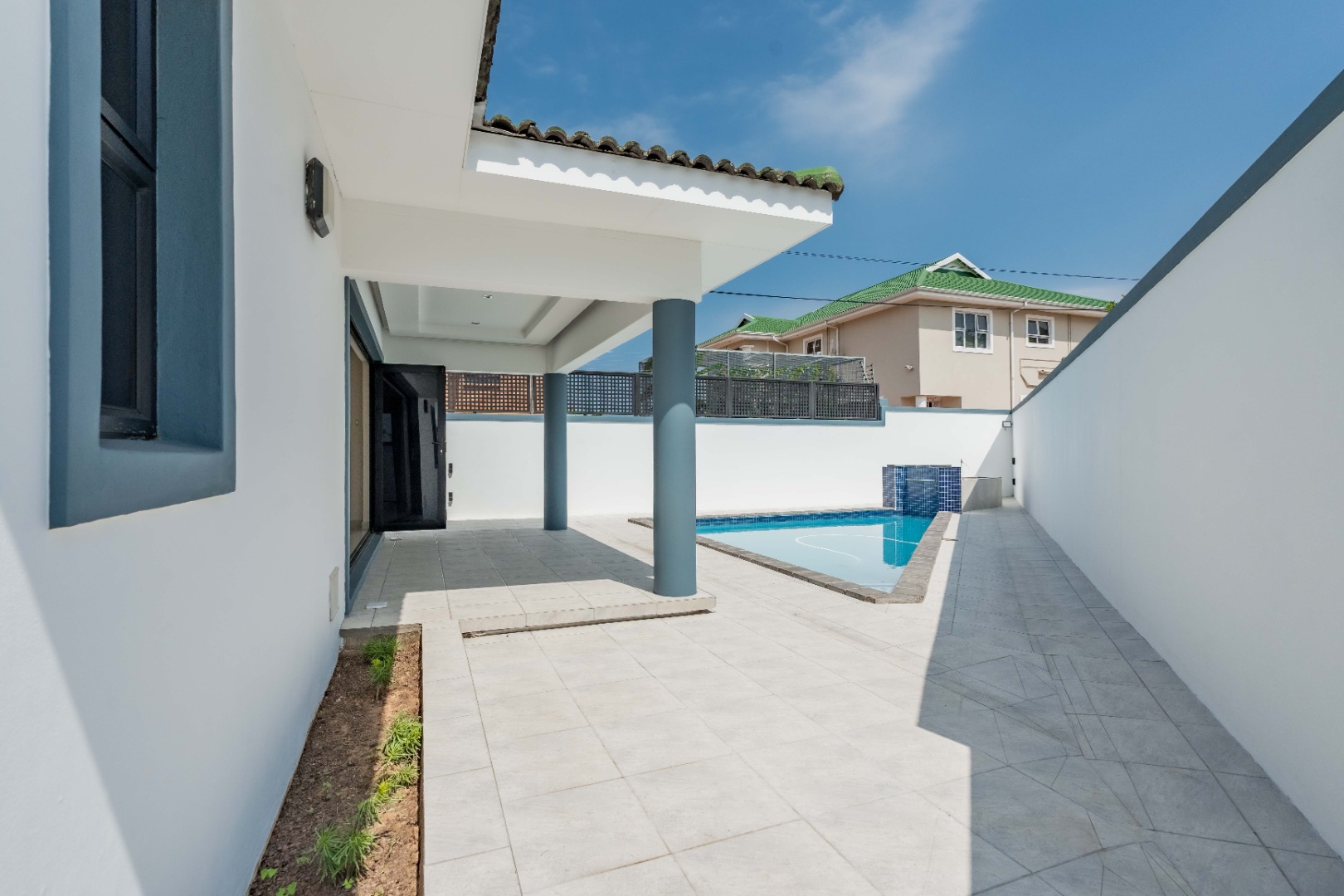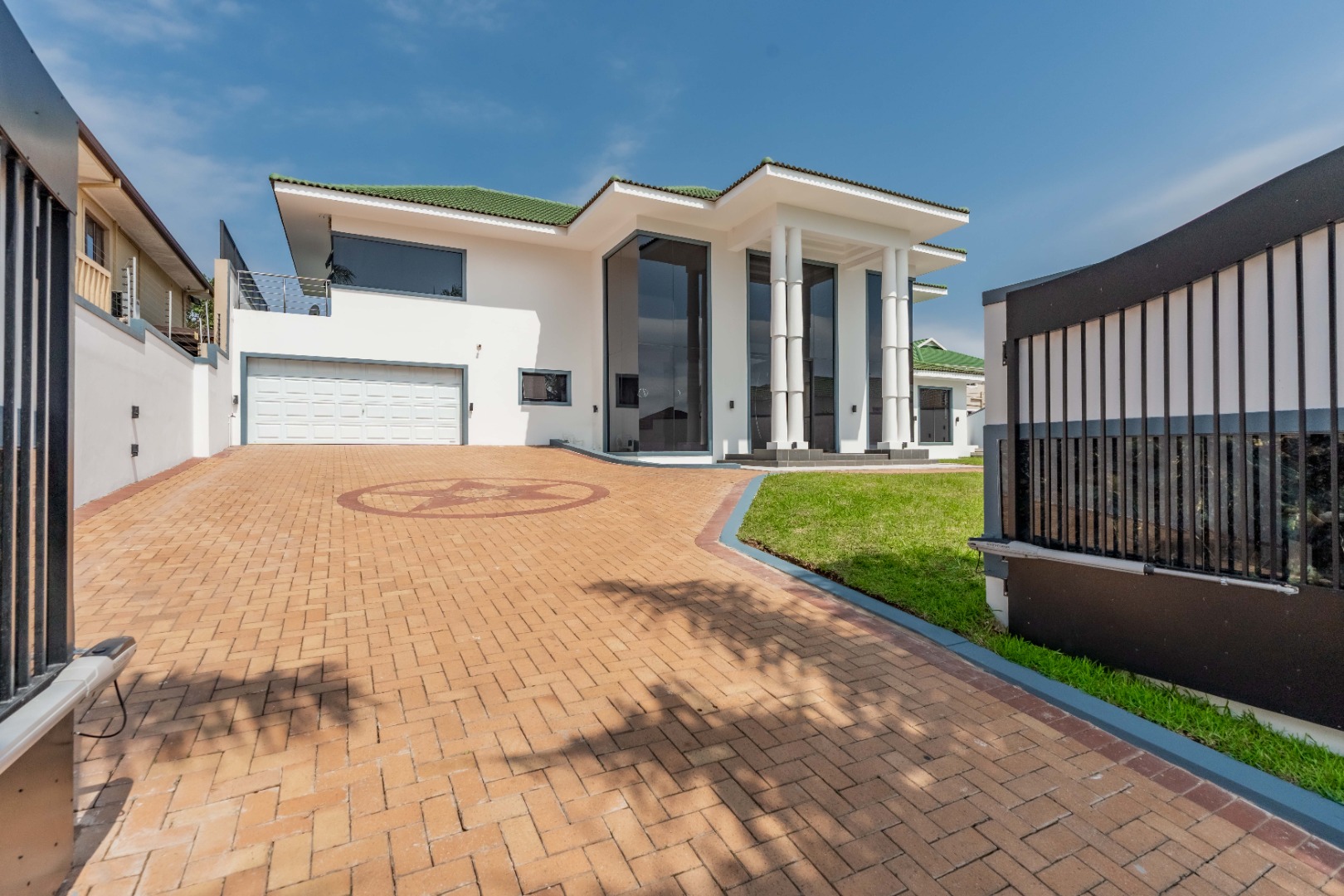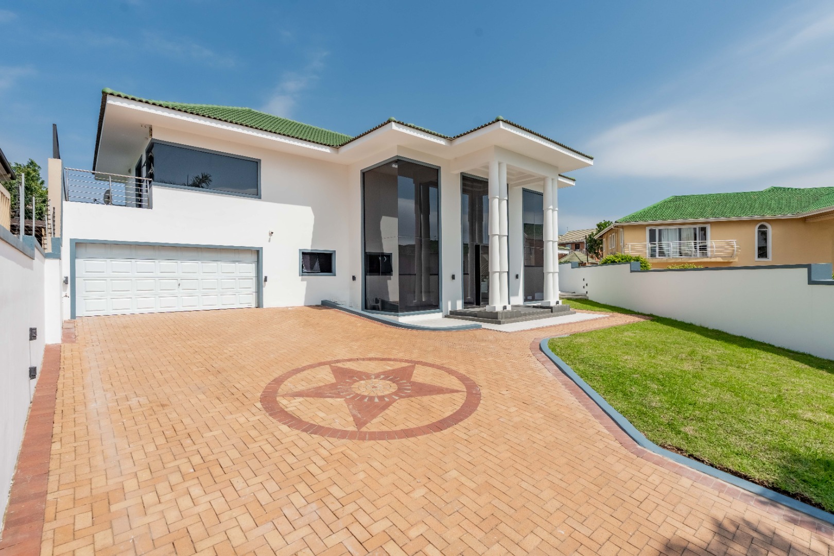 Upstairs are 3 spacious bedrooms with 3 en-suites and a study. The property is fully paved with a lovely garden section, double auto garage with direct access into the home and an excellent security system with beams on the property.
