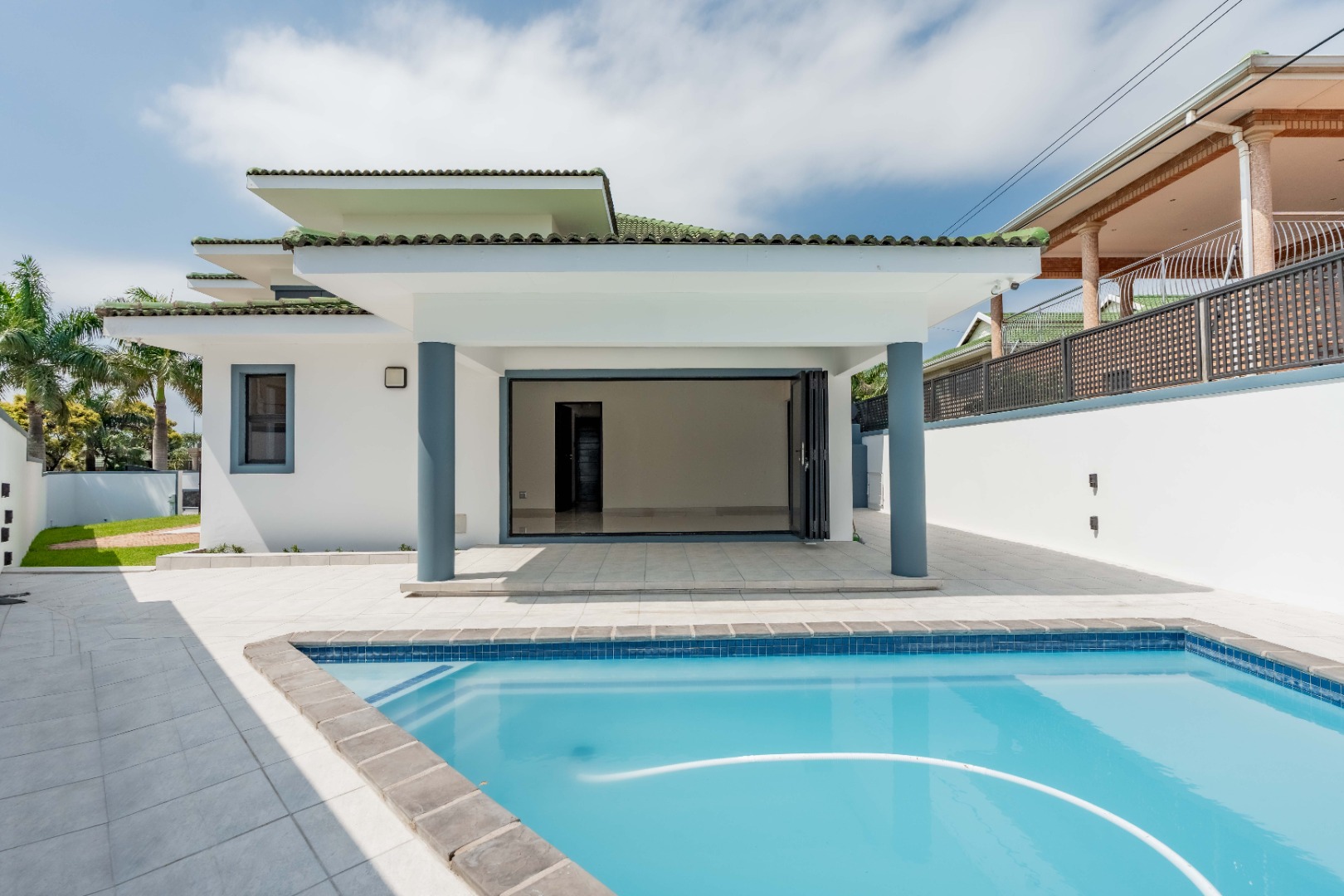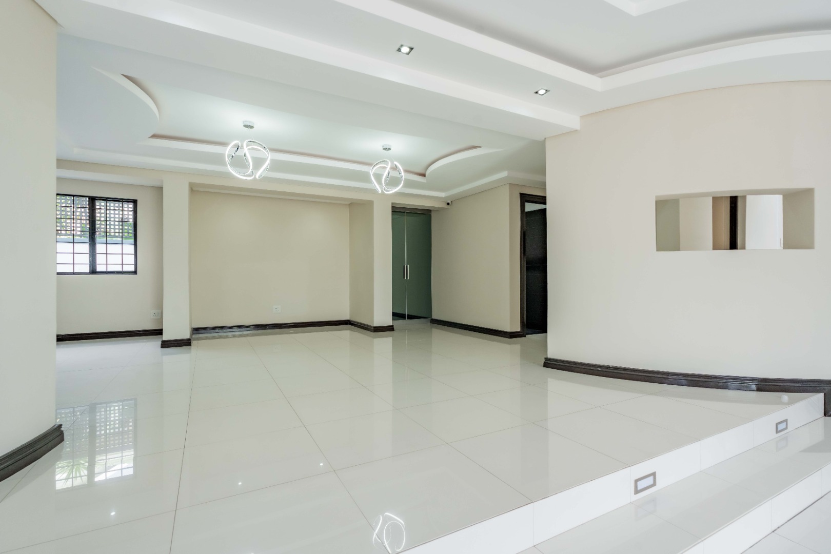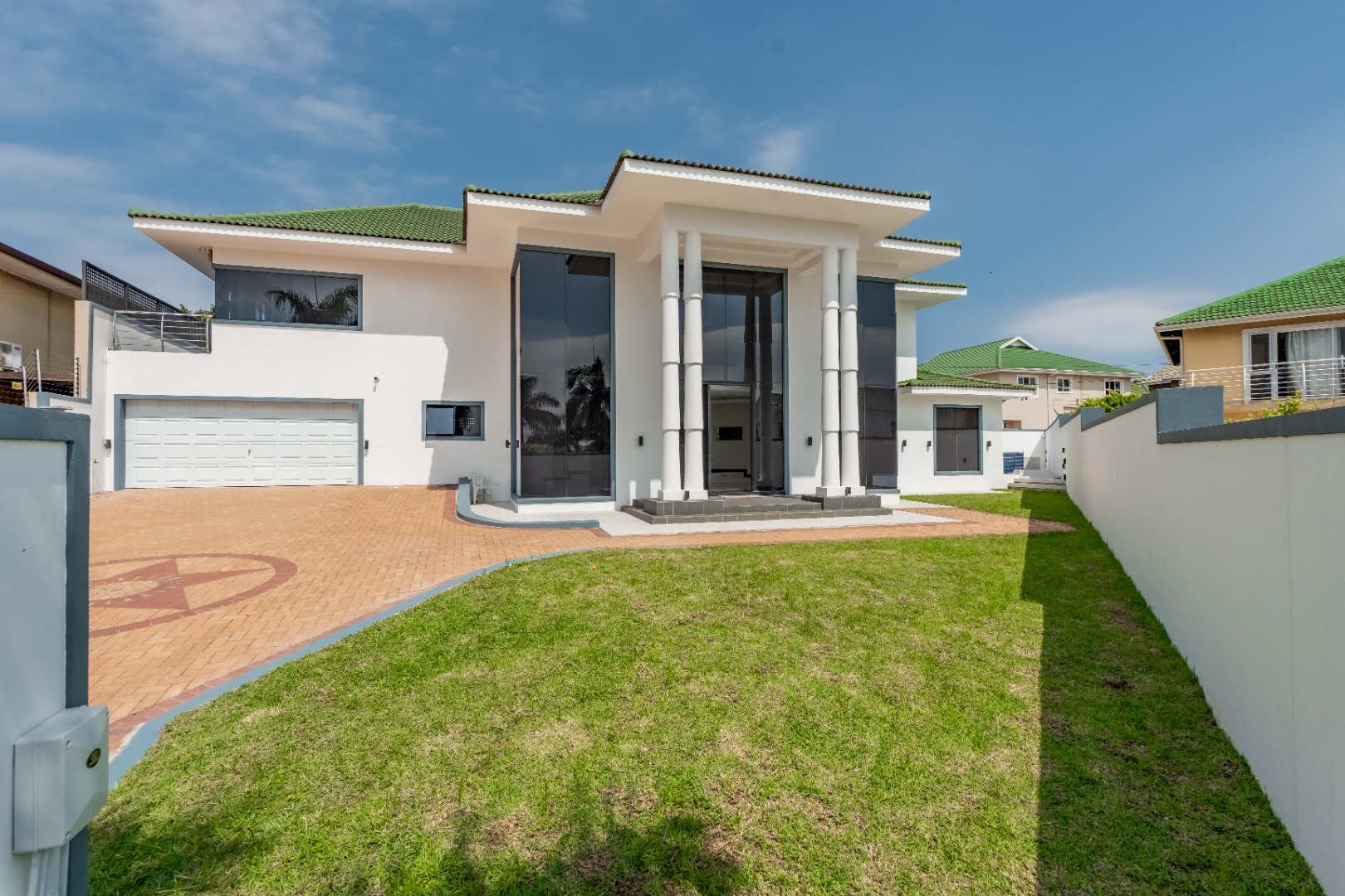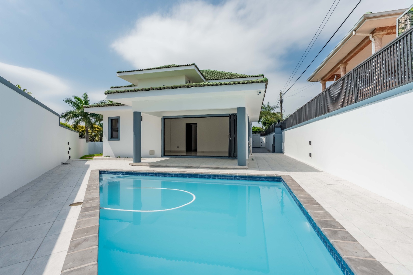 Upstairs are 3 spacious bedrooms with 3 en-suites and a study. The property is fully paved with a lovely garden section, double auto garage with direct access into the home and an excellent security system with beams on the property.