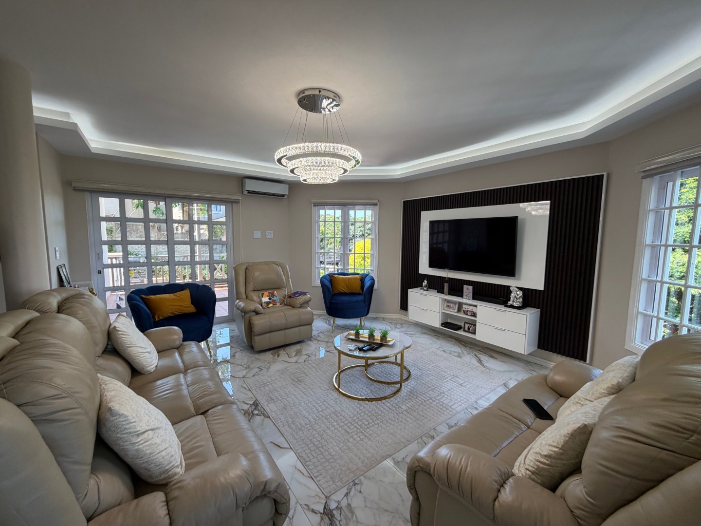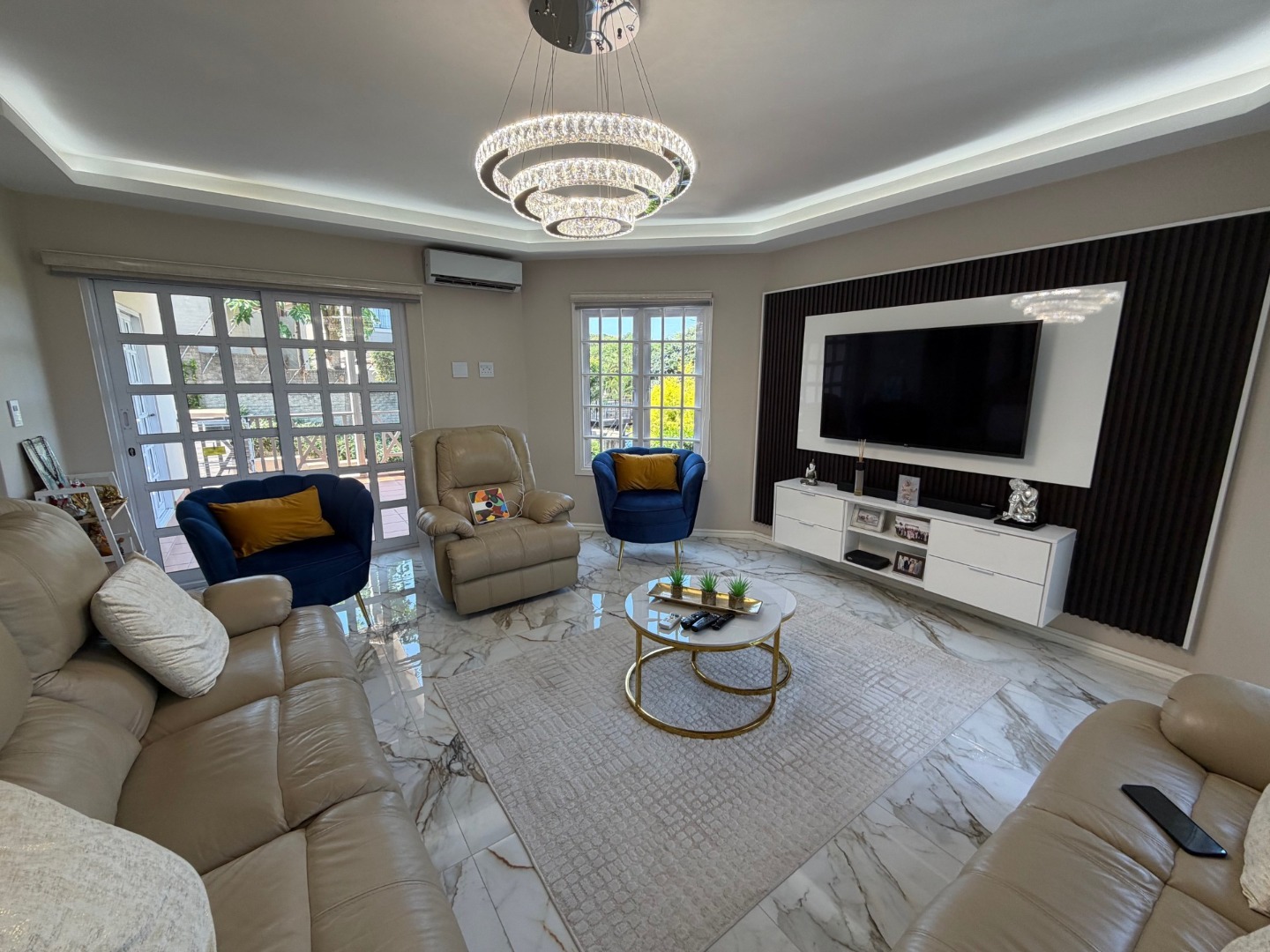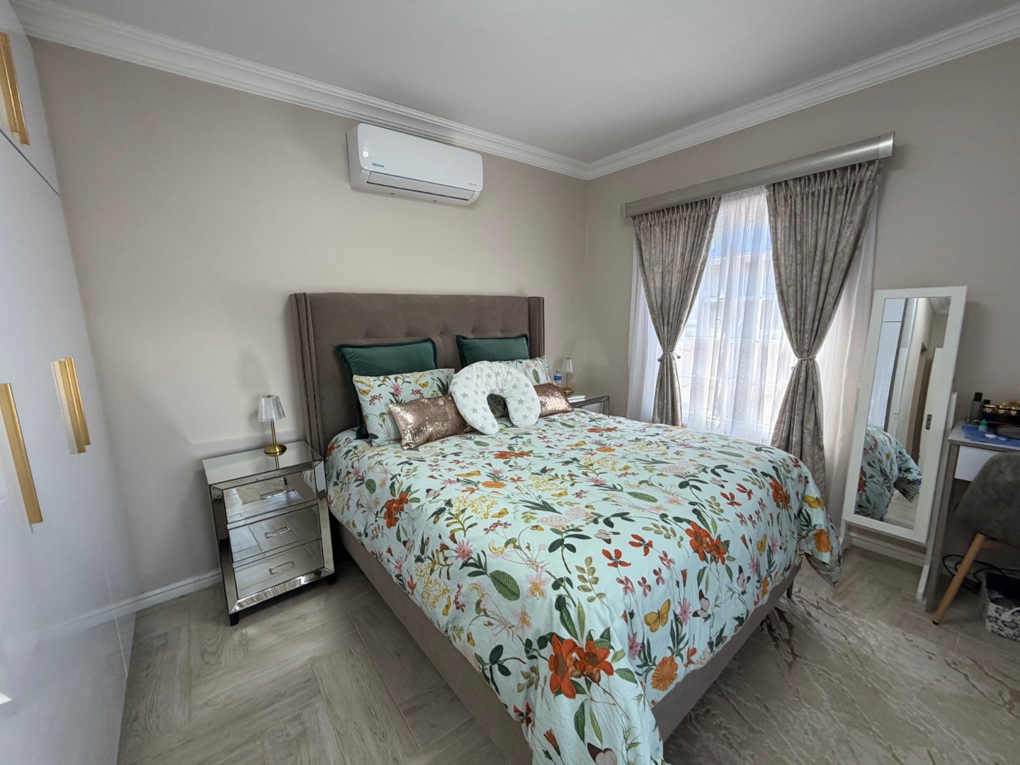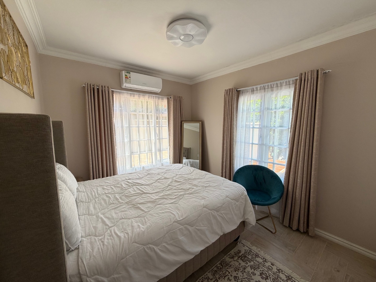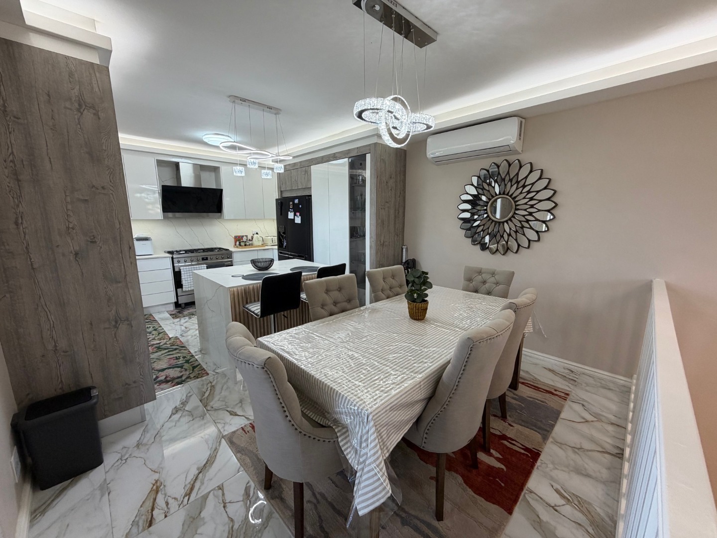 The modern kitchen features a 6-plate gas stove, ample cupboard space, and room for a dishwasher, flowing seamlessly into the dining area—perfect for everyday living and entertaining. All bedrooms are generously sized and fitted with air conditioning, ensuring year-round comfort.
