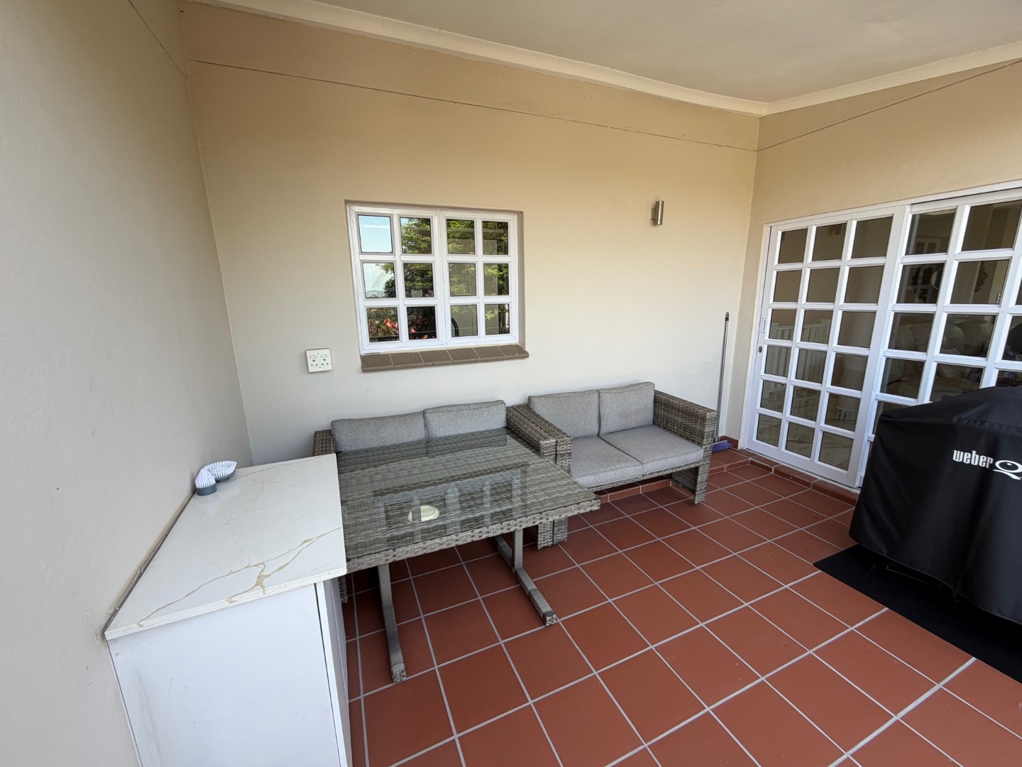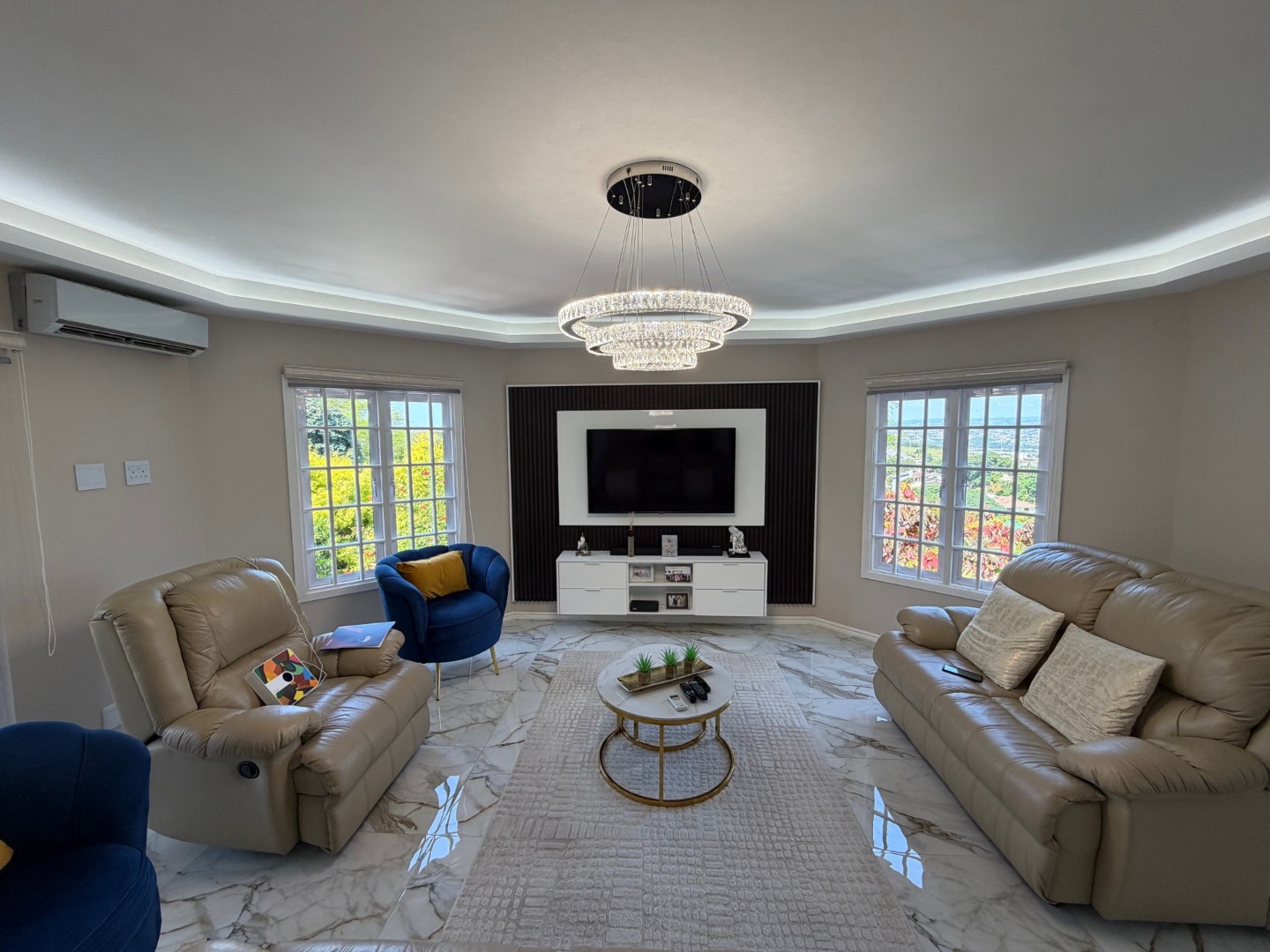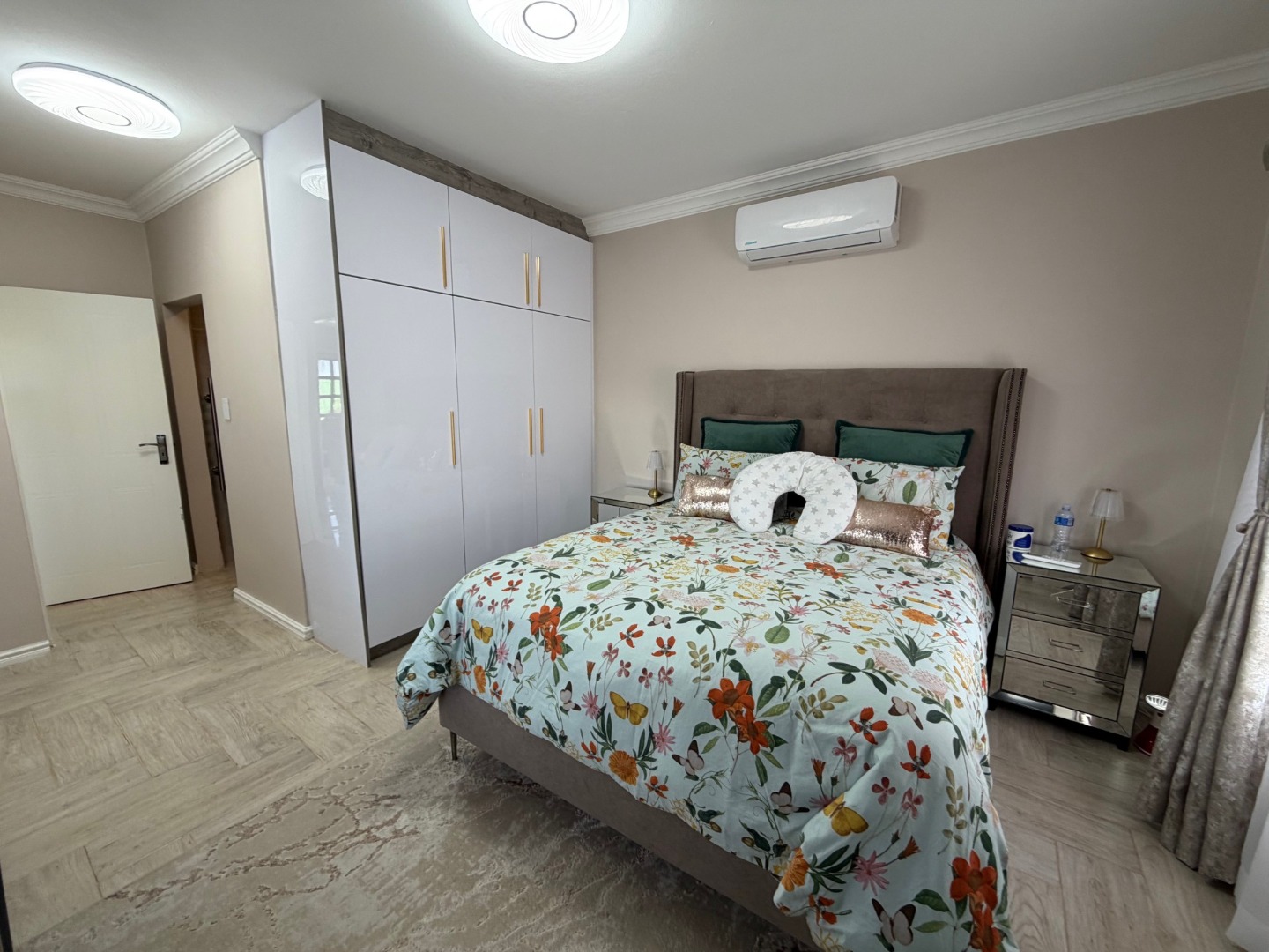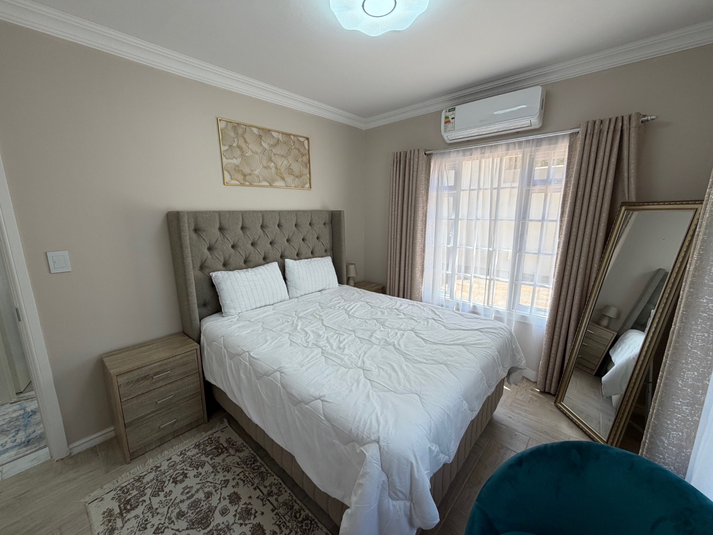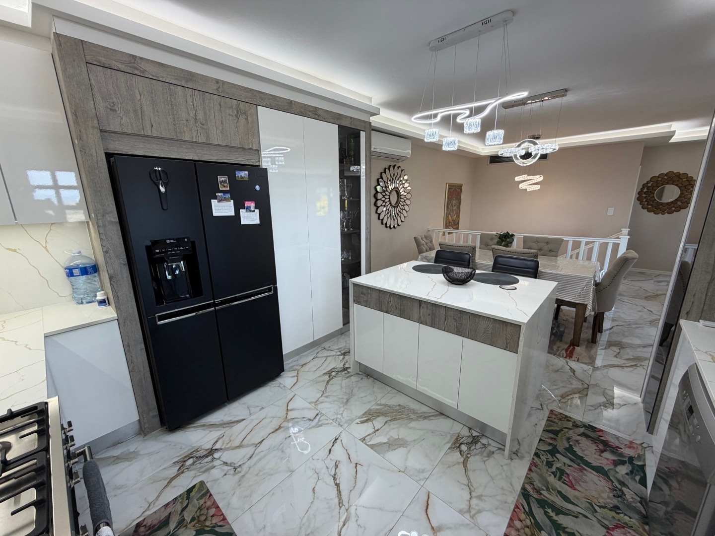 The modern kitchen features a 6-plate gas stove, ample cupboard space, and room for a dishwasher, flowing seamlessly into the dining area—perfect for everyday living and entertaining. All bedrooms are generously sized and fitted with air conditioning, ensuring year-round comfort.