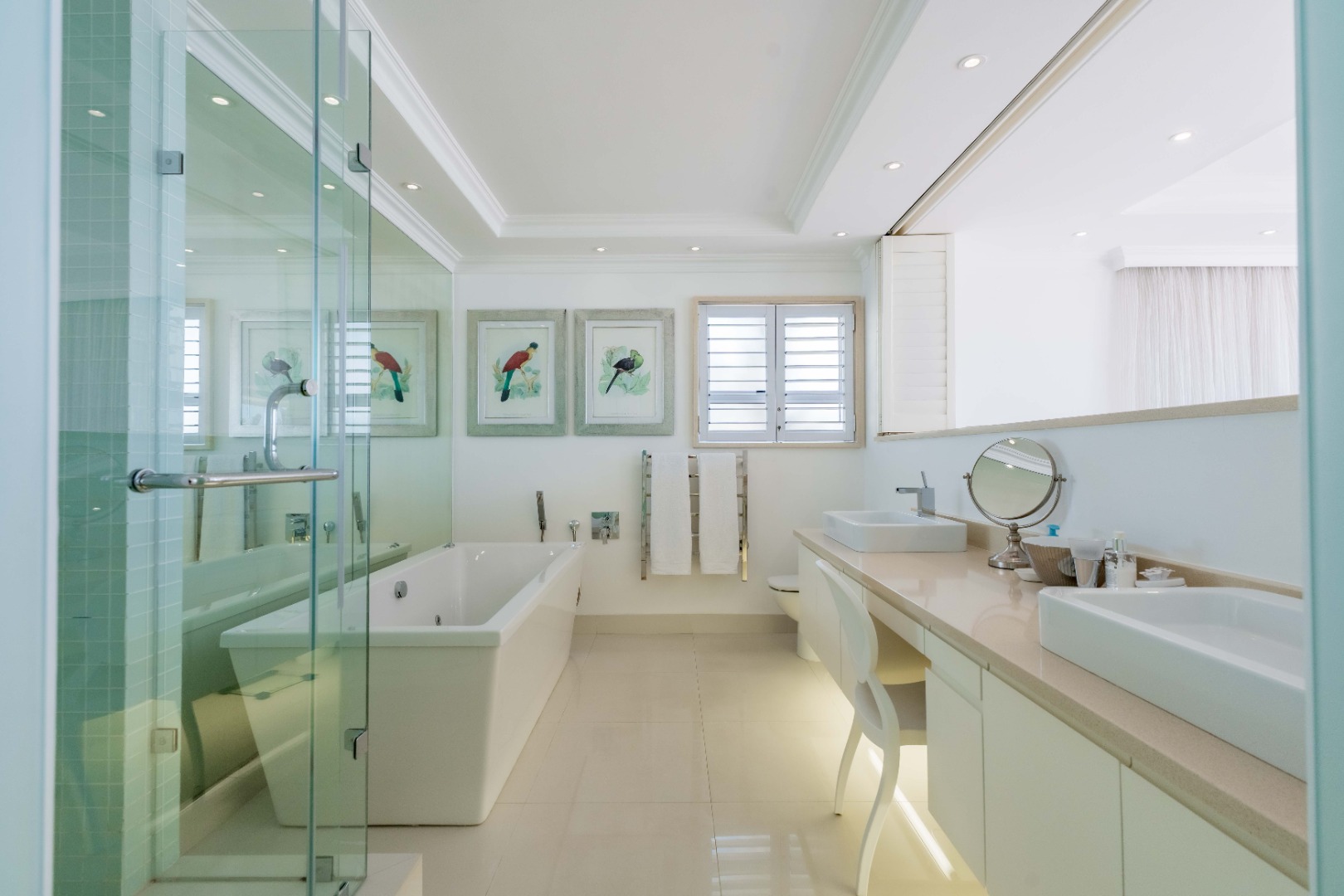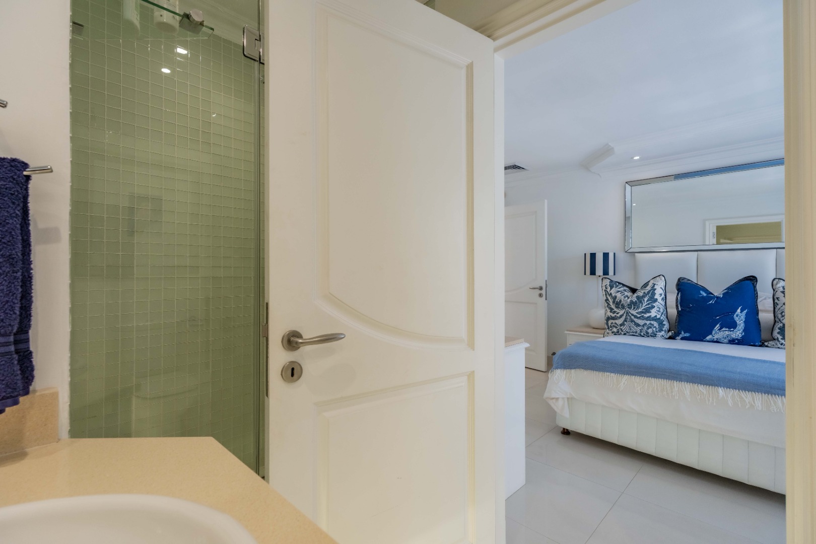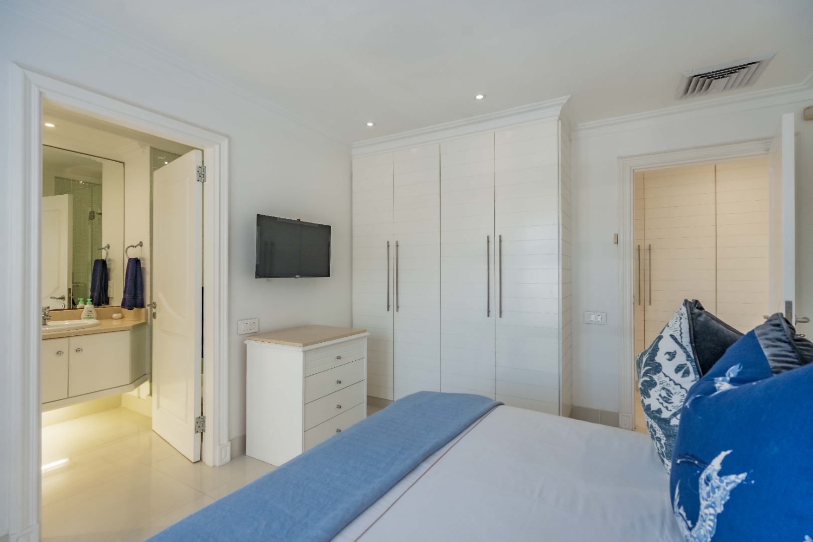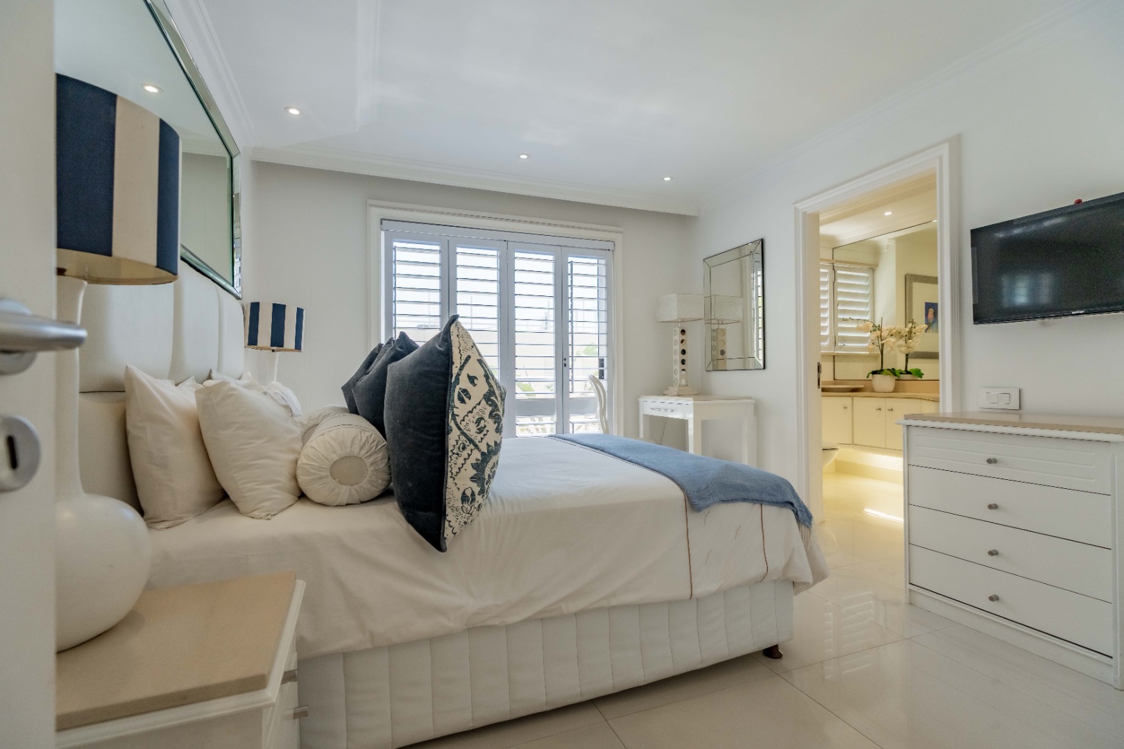 The beautiful master suite offers a luxurious escape, complete with a stunning en-suite bathroom featuring double basins, a bath, and a shower. Step out onto your own private patio to enjoy tranquil moments and fresh sea air.