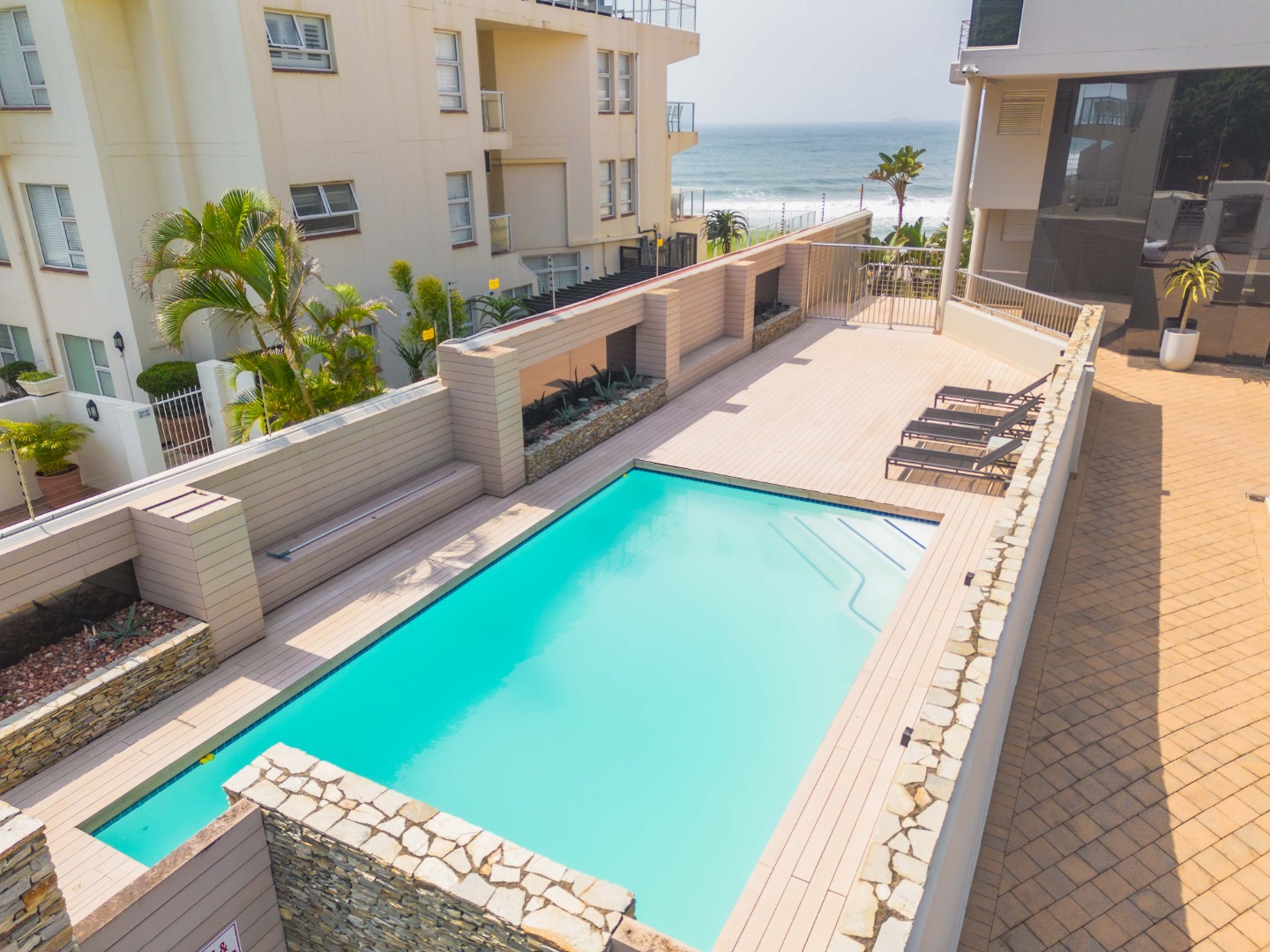 Residents can unwind in the communal pool area, which boasts inviting loungers on a wooden deck, two gas braais, and comfortable seating—perfect for entertaining guests or relaxing under the sun.