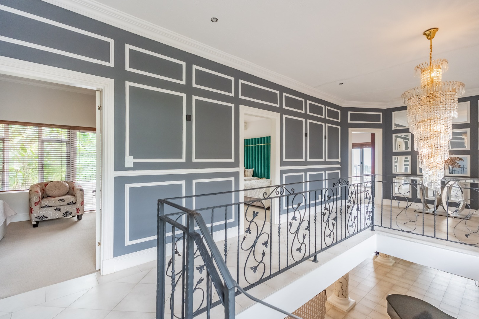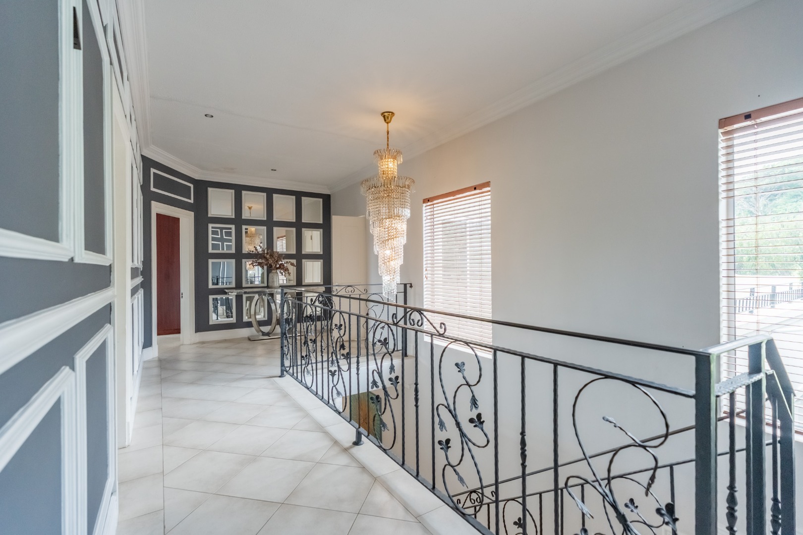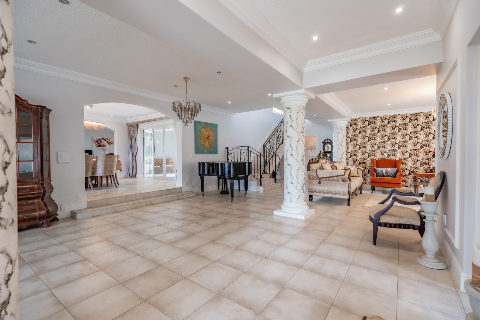 An impressive staircase with ornate balustrades and a striking chandelier leads to the expansive first floor, where four generously proportioned bedrooms and bathrooms are complemented by a relaxed pyjama lounge. Two large patios on this level offer direct access from the bedrooms and showcase uninterrupted sea views.