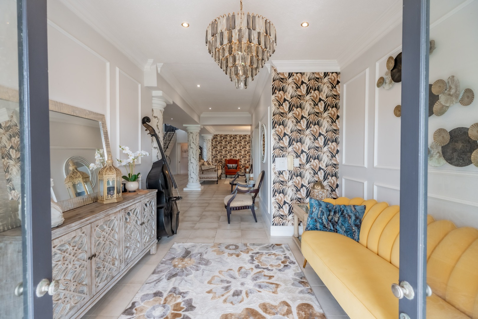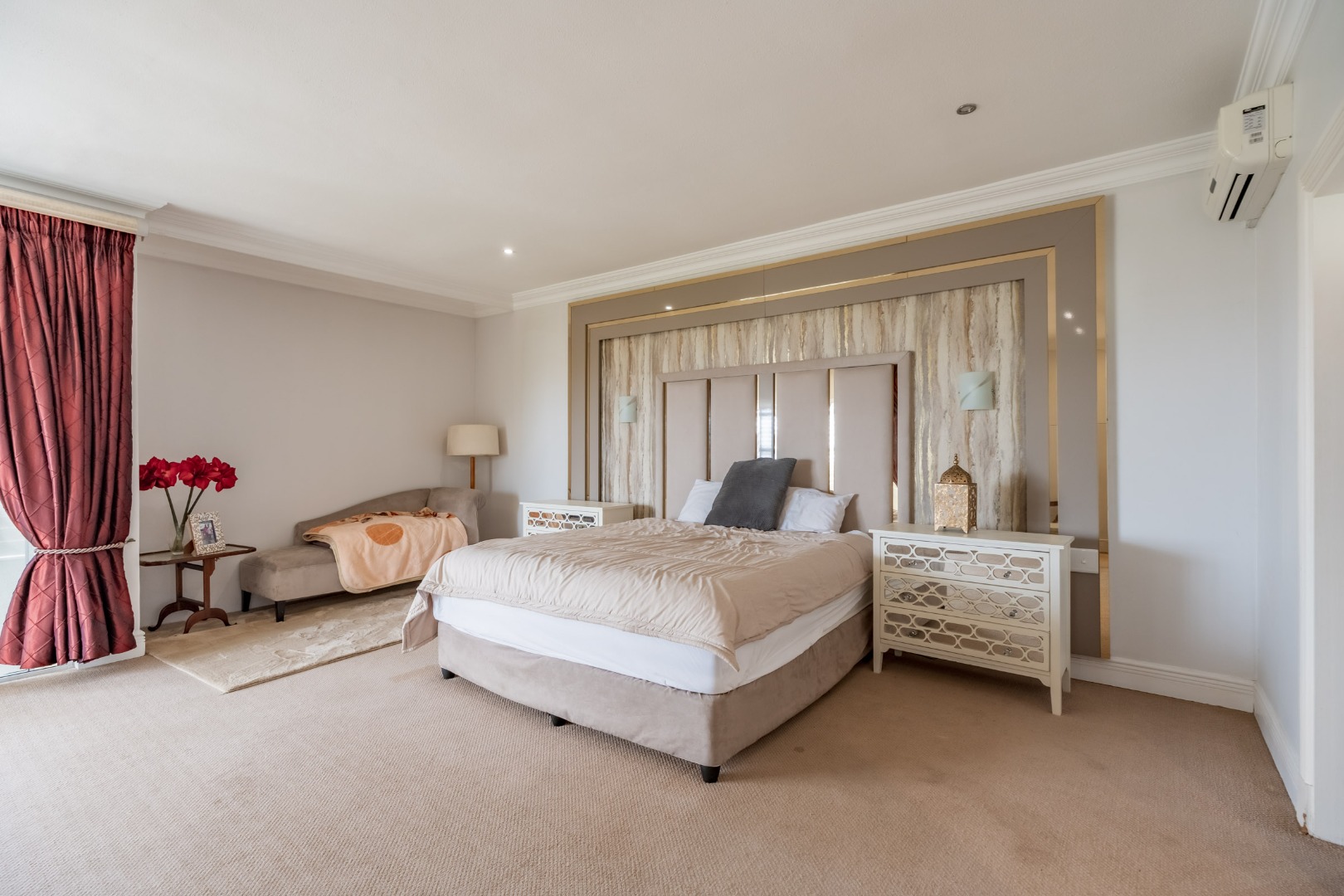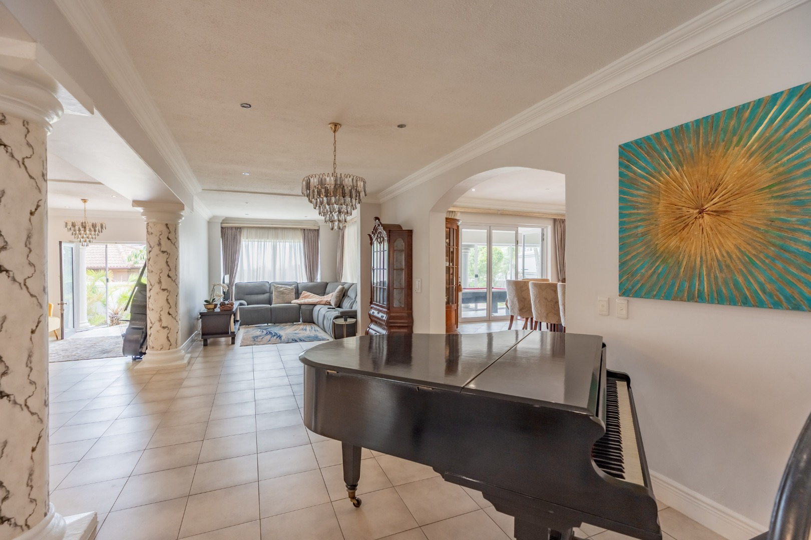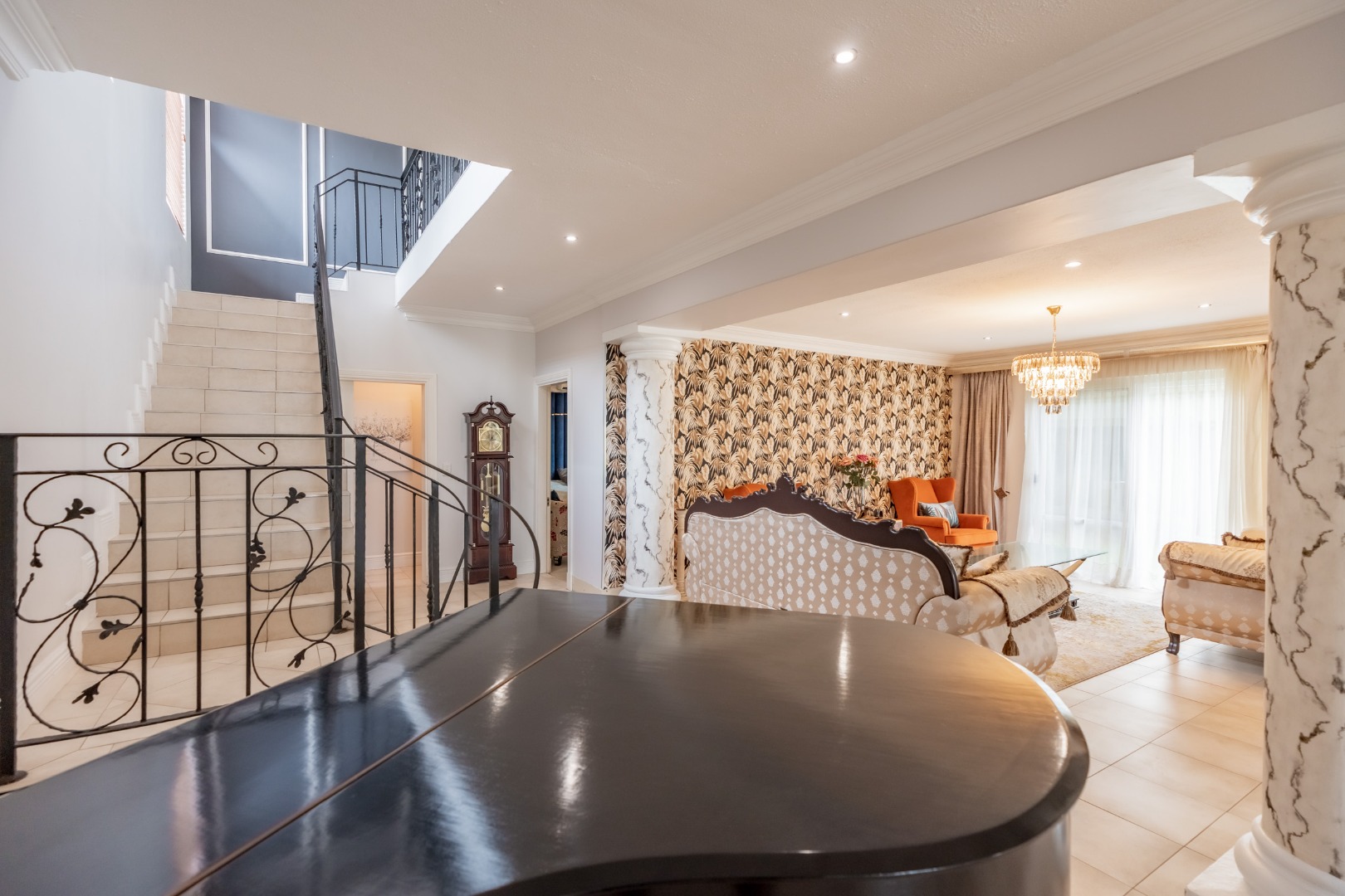 An impressive staircase with ornate balustrades and a striking chandelier leads to the expansive first floor, where four generously proportioned bedrooms and bathrooms are complemented by a relaxed pyjama lounge. Two large patios on this level offer direct access from the bedrooms and showcase uninterrupted sea views.