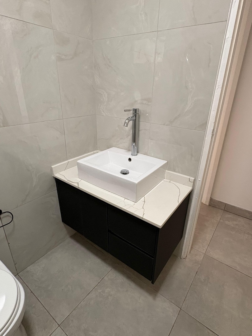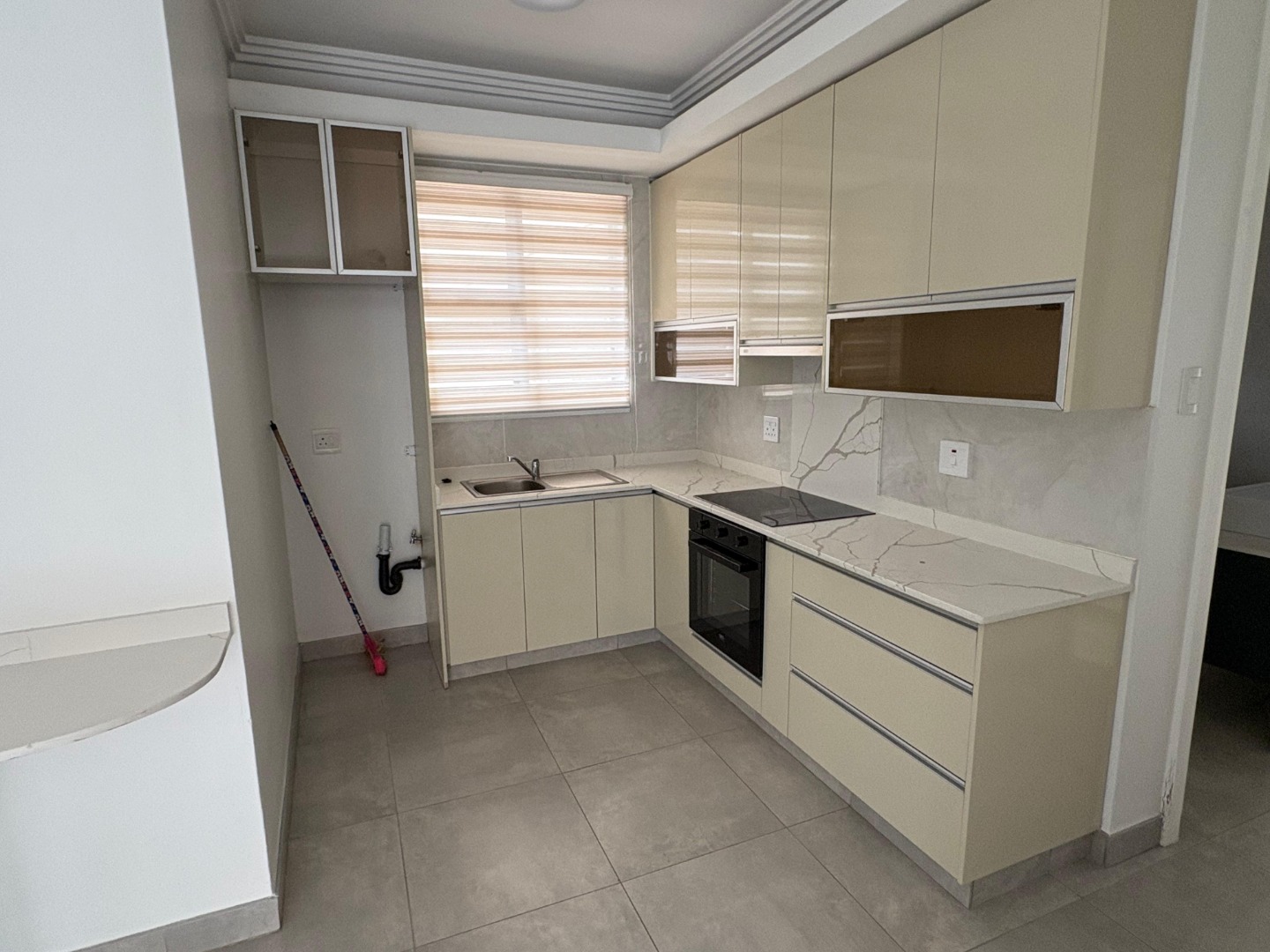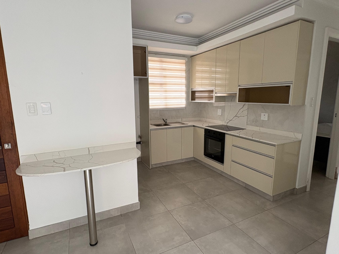 The kitchen is a seamless extension of the living area — sleek and functional, featuring granite countertops, contemporary cabinetry, and ample storage. Every detail has been thoughtfully designed to create a space that feels both stylish and practical.